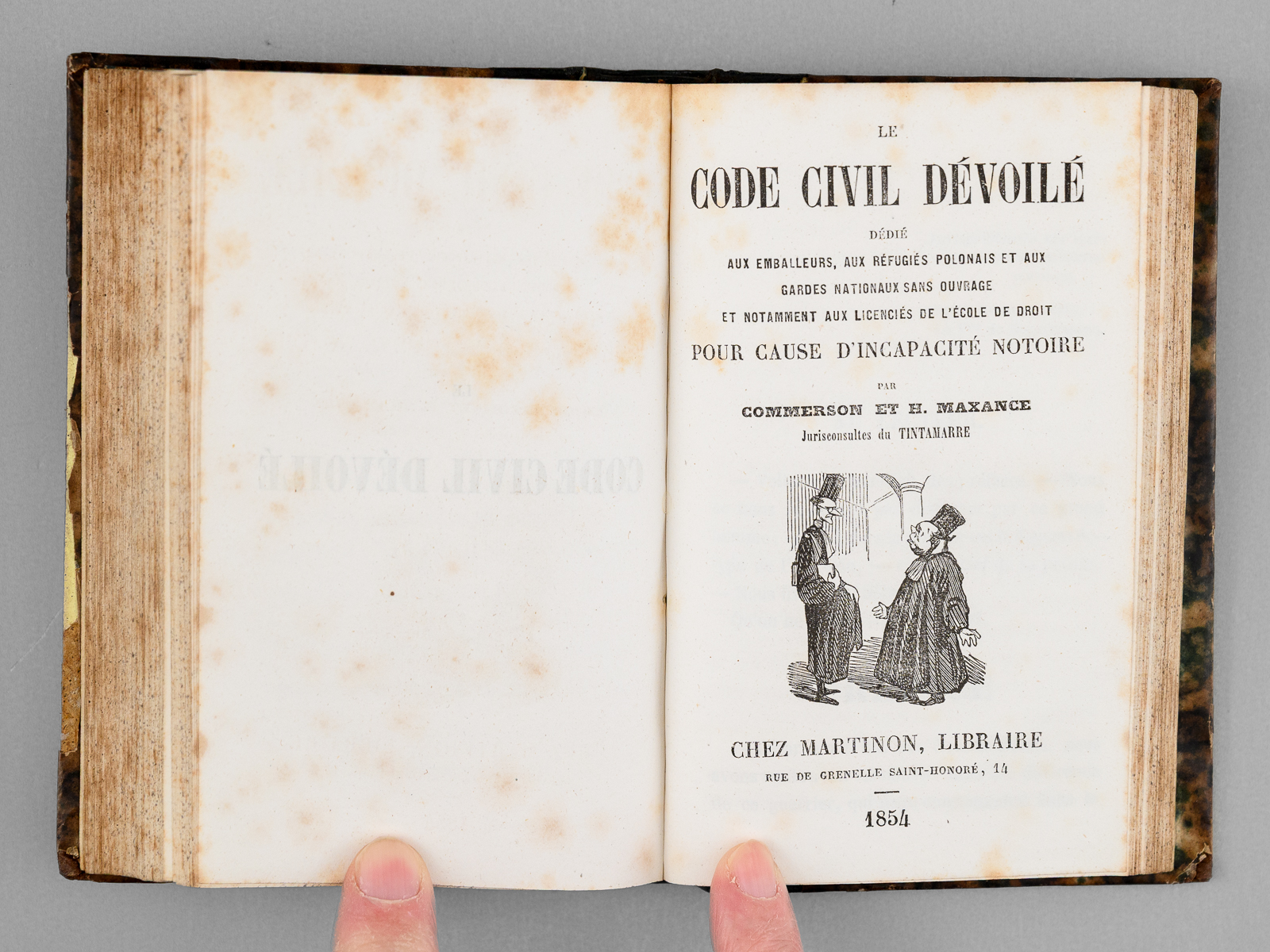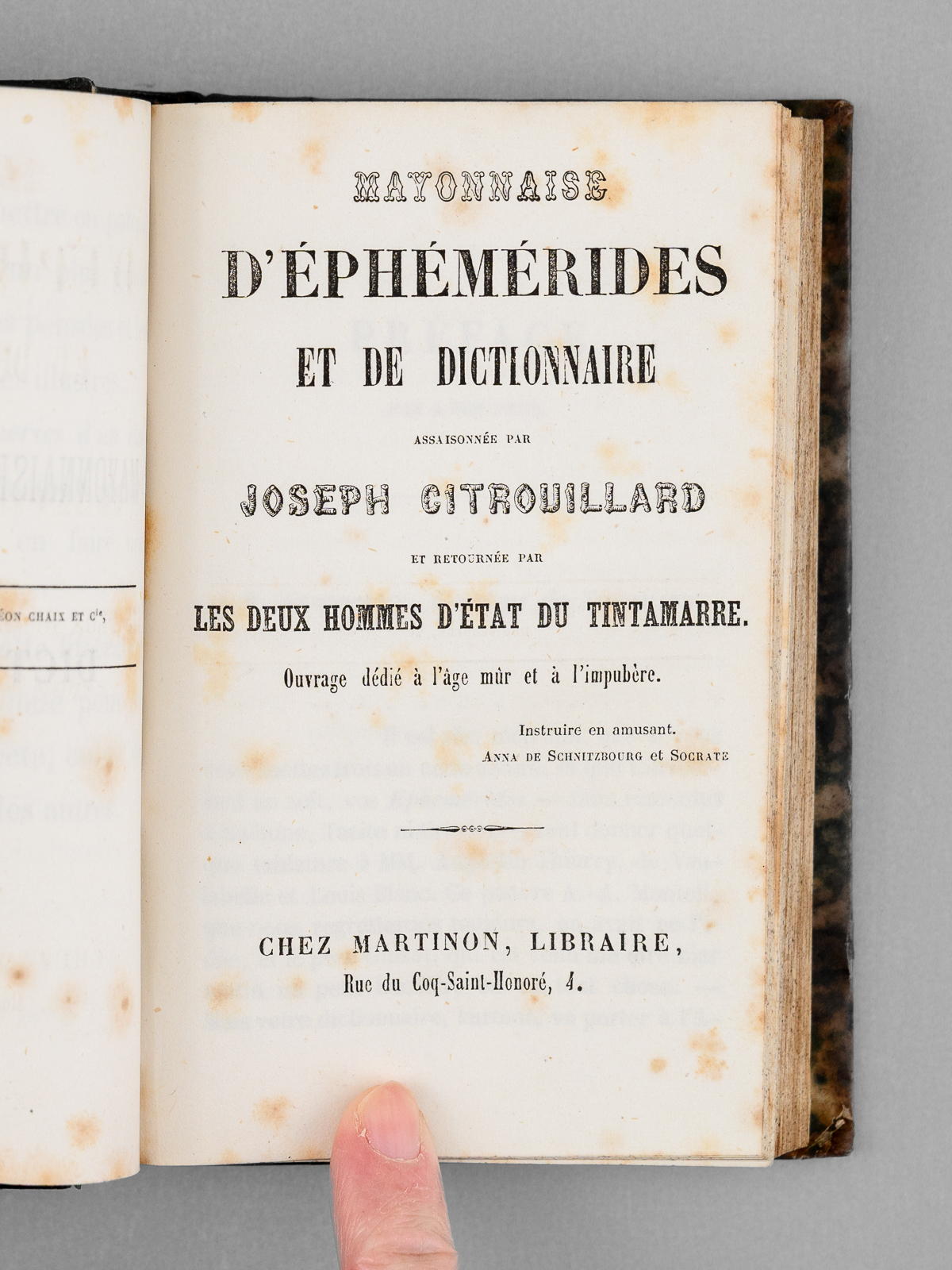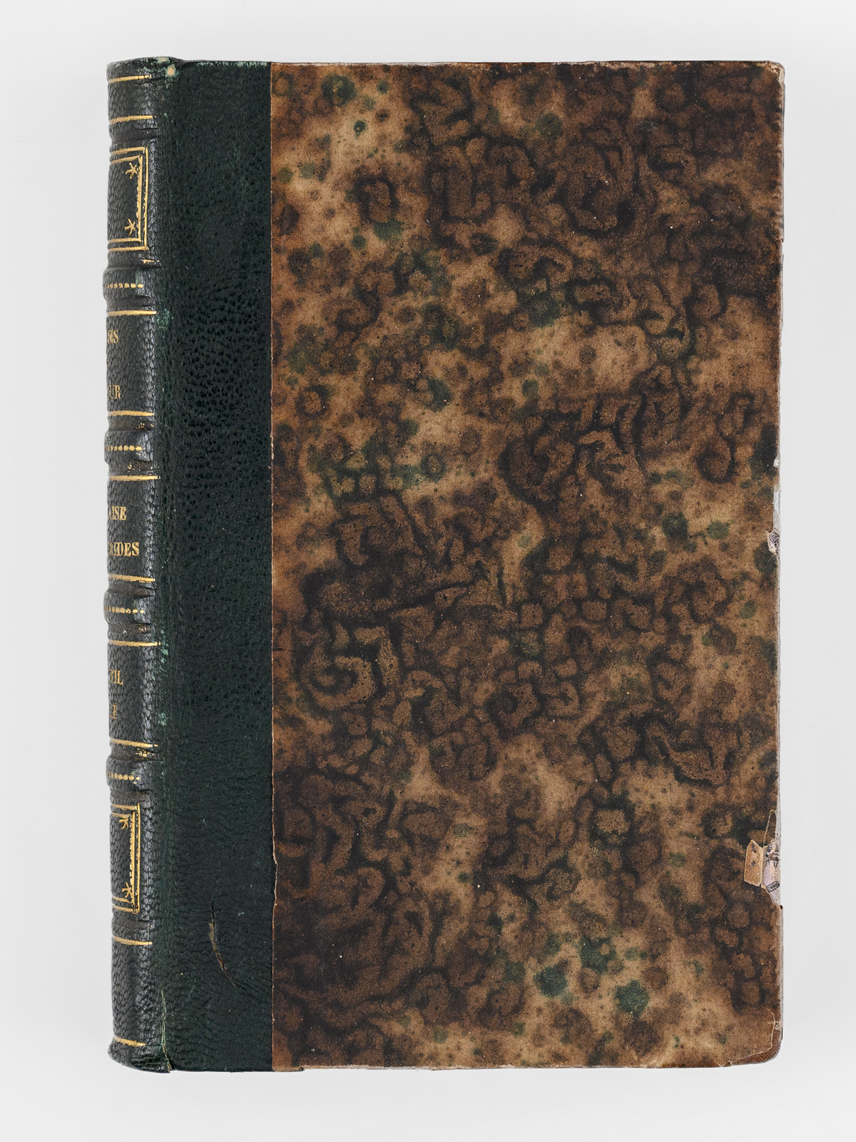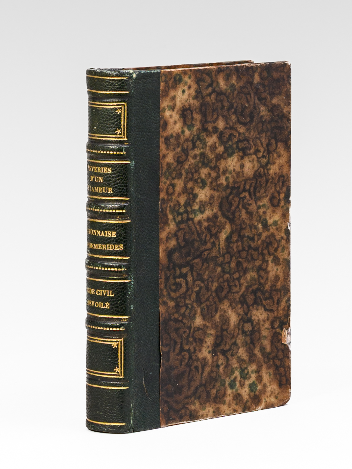 1 vol. in-18 reliure de l'époque demi-chagrin vert, dos à 4 nerfs dorés orné : Rêveries d'un Etameur pour faire suite aux Pensées de Blaise Pascal,par Commerson & E. Furpille, Chez Martinon, 1854, 144 pp. [ Suivi de : ] Mayonnaise d'Ephémérides et de Dictionnaire assaisonnée par Joseph Citrouillard et retournée par les deux hommes d'Etat du Tintamarre. Ouvrage dédié à l'âge mûr et à l'impubère, Chez Martinon, s.d., XIV-129 pp. [ Suivi de : ] Le Code civil dévoilé, dédié aux Emballeurs, aux Réfugiés polonais et aux Gardes nationaux sans ouvrage et notamment aux licenciés de l'Ecole de Droit pour Cause d'Incapacité Notoire par Commerson et H. Maxance Jurisconsultes du Tintamarre, Chez Martinon, 1854, 143 pp. Commentaire : Rare réunion de ces 3 titres peu commun, par le spécialiste du calembour et du bon mot, Jean-Louis Commerson (1803-1879). Bon état (coupes un peu frottées, bon exemplaire par ailleurs).