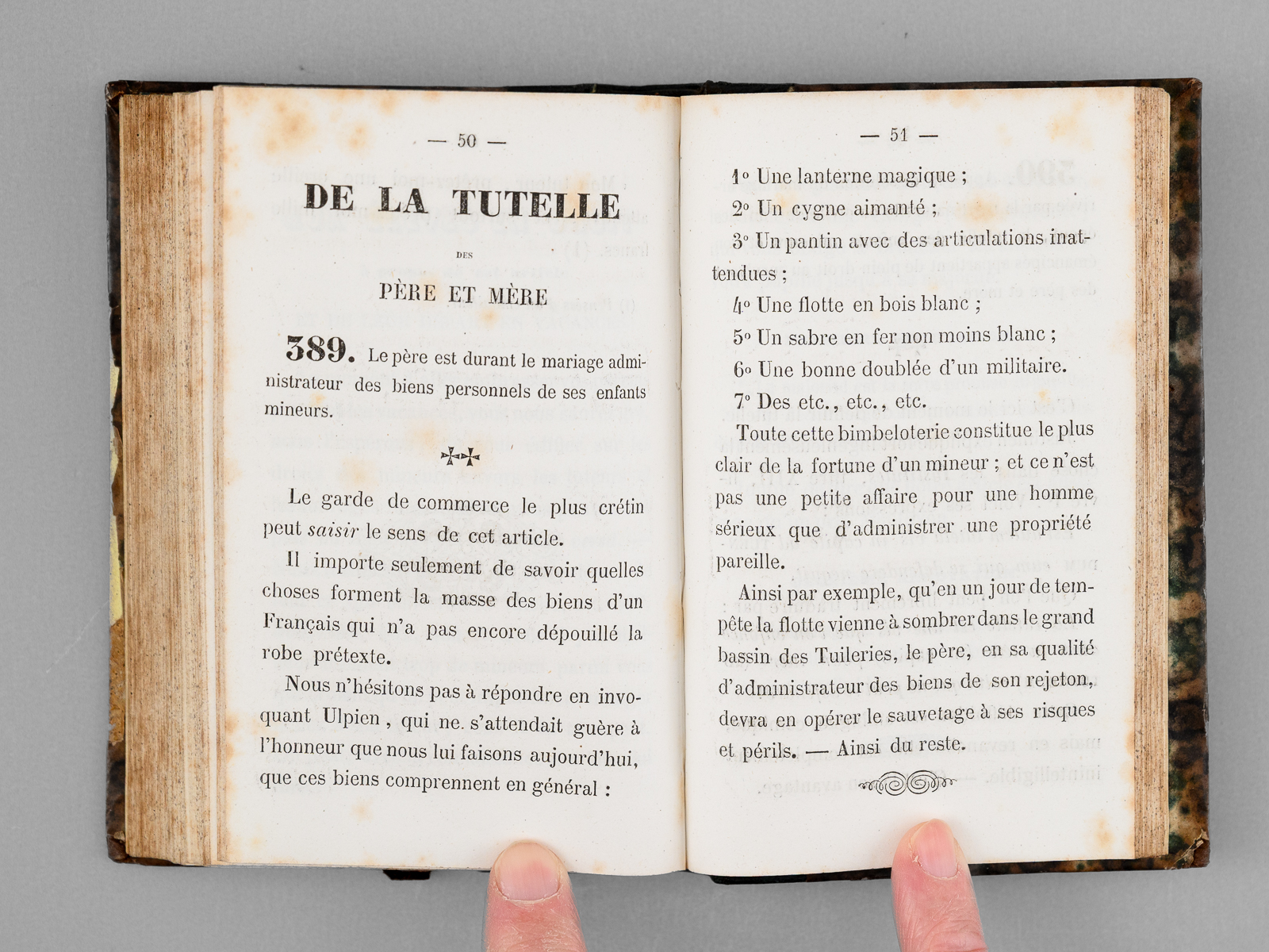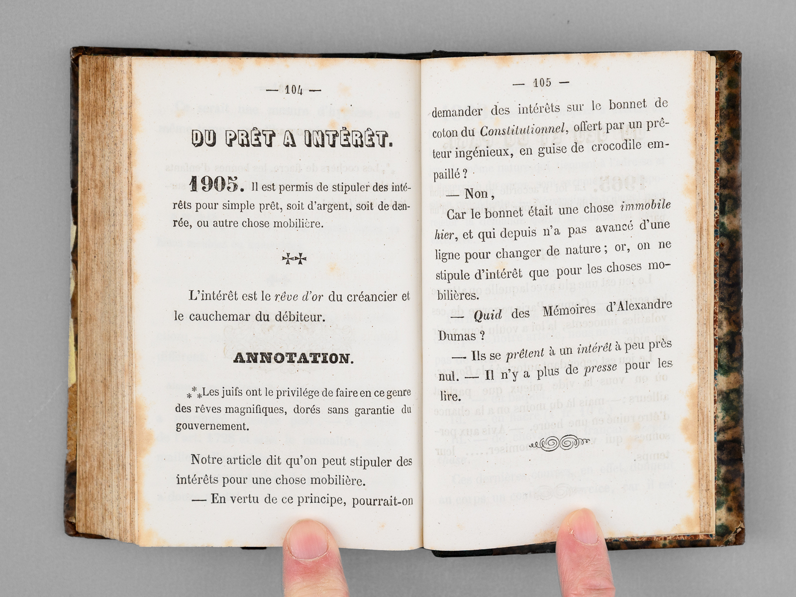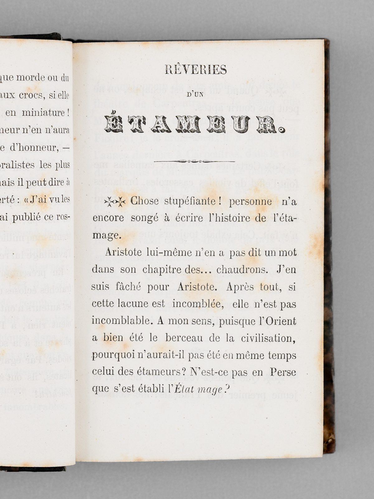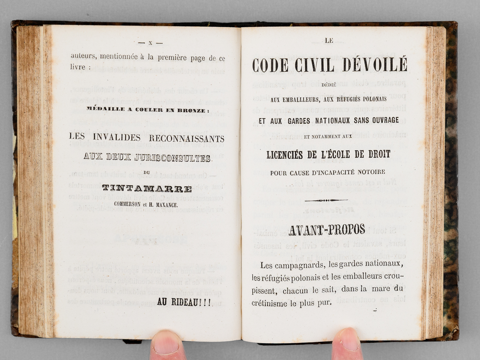 1 vol. in-18 reliure de l'époque demi-chagrin vert, dos à 4 nerfs dorés orné : Rêveries d'un Etameur pour faire suite aux Pensées de Blaise Pascal,par Commerson & E. Furpille, Chez Martinon, 1854, 144 pp. [ Suivi de : ] Mayonnaise d'Ephémérides et de Dictionnaire assaisonnée par Joseph Citrouillard et retournée par les deux hommes d'Etat du Tintamarre. Ouvrage dédié à l'âge mûr et à l'impubère, Chez Martinon, s.d., XIV-129 pp. [ Suivi de : ] Le Code civil dévoilé, dédié aux Emballeurs, aux Réfugiés polonais et aux Gardes nationaux sans ouvrage et notamment aux licenciés de l'Ecole de Droit pour Cause d'Incapacité Notoire par Commerson et H. Maxance Jurisconsultes du Tintamarre, Chez Martinon, 1854, 143 pp. Commentaire : Rare réunion de ces 3 titres peu commun, par le spécialiste du calembour et du bon mot, Jean-Louis Commerson (1803-1879). Bon état (coupes un peu frottées, bon exemplaire par ailleurs).