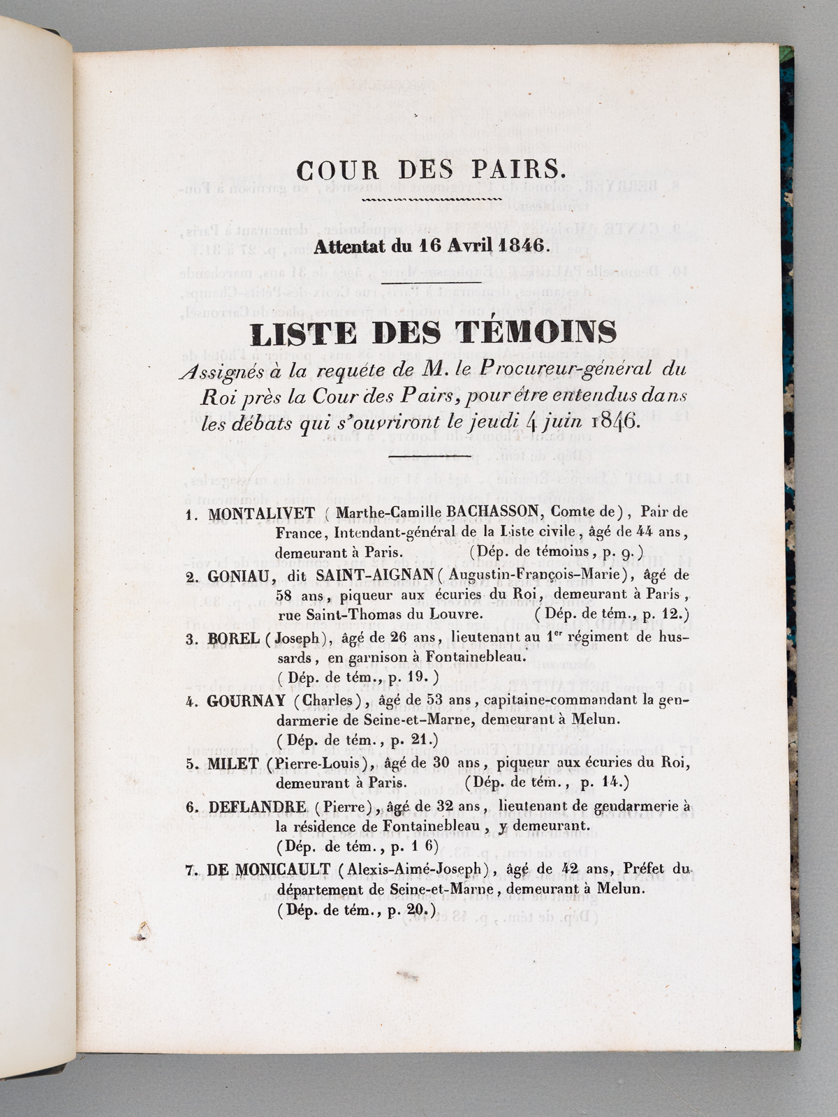[ Recueil relatif à l'attentat du 16 avril 1846 ] Cour des Pairs. Attentat du 16 avril 1846. Liste des Témoins [ Suivi de : ] Cour des Pairs. Attentat du 16 avril 1846. Arrêt du Mercredi 27 mai 1846. Acte d'Accusation [ Suivi