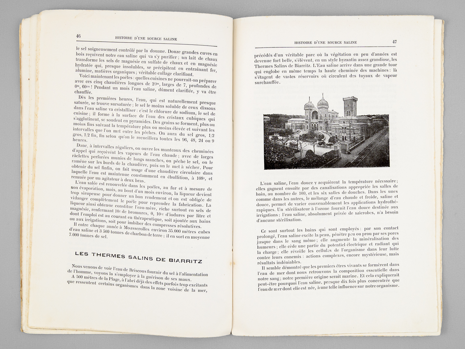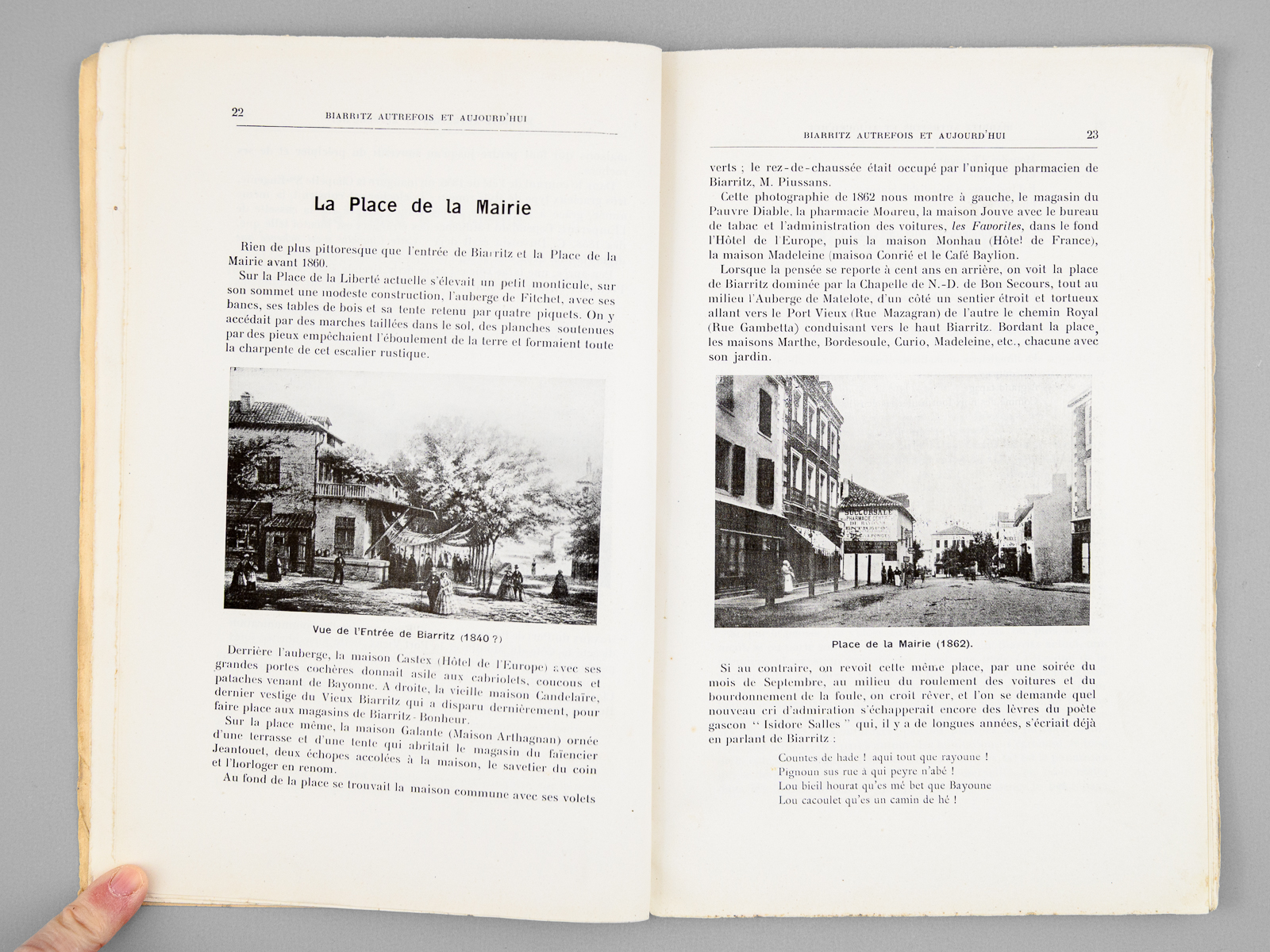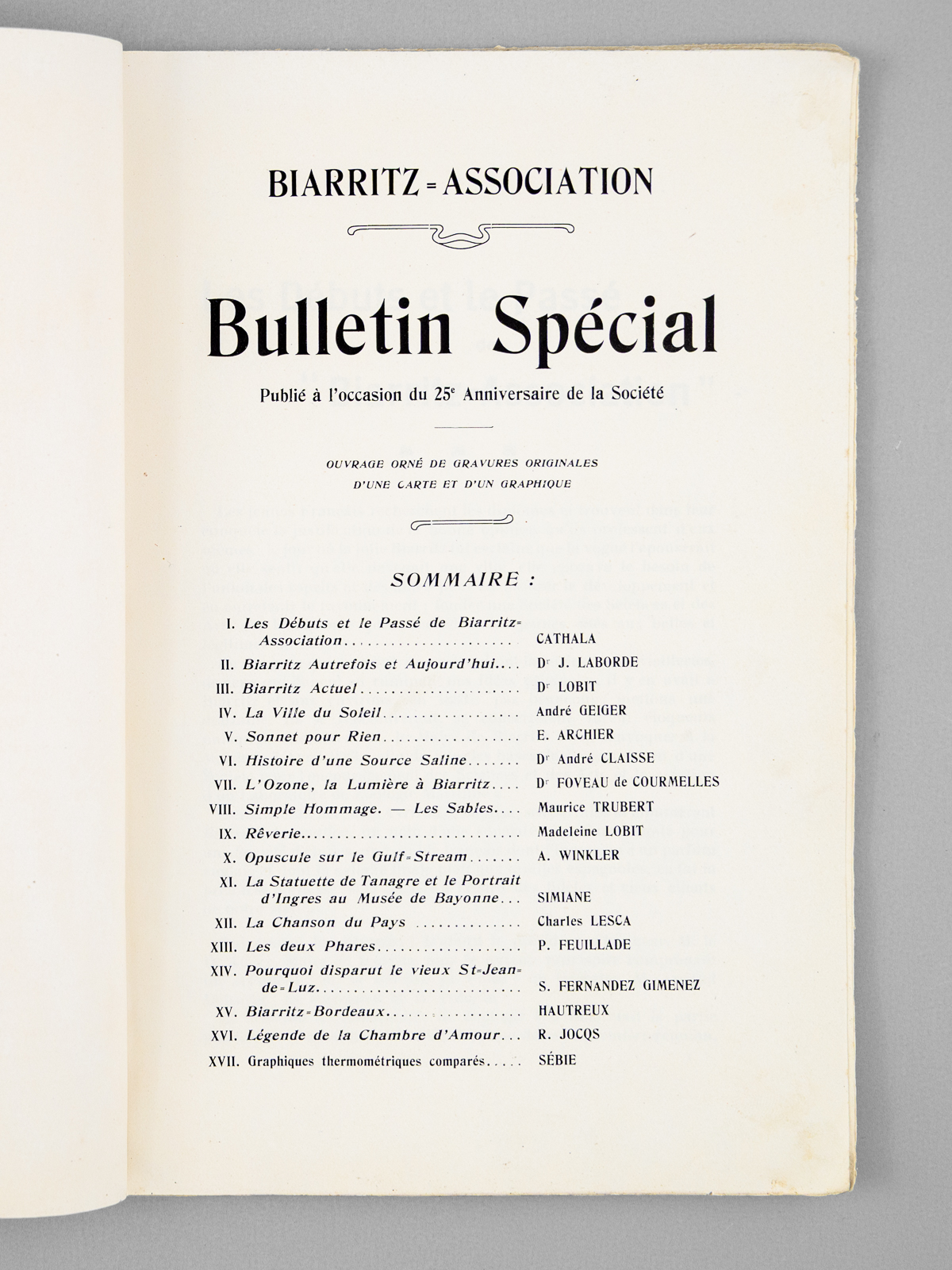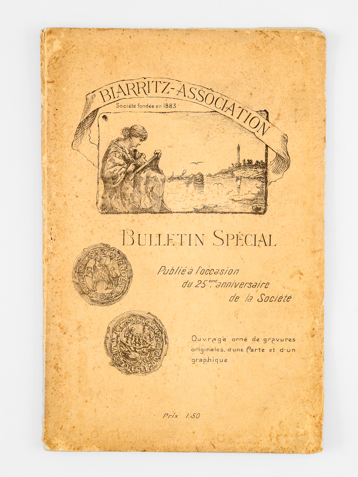 Publié à l'occasion du 25e Anniversaire de la Société ; Ouvrage orné de gravures originales, d'une carte et d'un graphique, 1 vol. in-8 br., Biarritz Association, Imprimerie Piche et Soulé, Biarritz, s.d. [ 1908 ], 76 pp. [ Contient : ] Les Débuts et le Passé de Biarritz-Association (Cathala); Biarritz Autrefois et Aujourd'hui... (Dr J. Laborde); Biarritz Actuel (Dr Lobit); La Ville du Soleil (André Geiger); Sonnet pour Rien (E. Archier); Histoire d'une Source Saline (Dr André Claisse); L'Ozone, la Lumière à Biarritz (Dr Foveau de Courmelles); Simple Hommage. - Les Sables (Maurice Trubert); Rêverie (Madeleine Lobit); Opuscule sur le Gulf-Stream (A. Winkler); La Statuette de Tanagre et le Portrait d'Ingres au Musée de Bayonne (Simiane); La Chanson du Pays (Charles Lesca); Les deux Phares (P. Feuillade); Pourquoi disparut le vieux St-Jean-de-Luz (S. Fernandez Gimenez); Biarritz-Bordeaux (Hautreux); Légende de la Chambre d'Amour (R. Jocqs); Graphiques thermométriques comparés (Sébie). Commentaire : Rare exemplaire de ce très intéressant bulletin illustré. Etat très satisfaisant (couv. frottée, bon état par ailleurs).