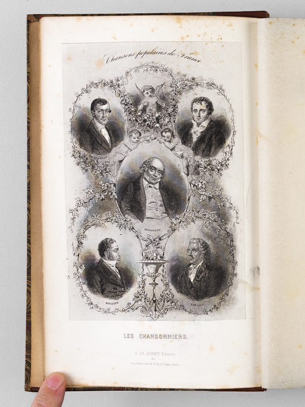 Commentaire : Ce beau recueil rassemble près de 1400 romances, chansons bachiques, badines, patriotiques, burlesques, épicuriennes, chansonnettes et rondes enfantines. Il est illustré de nombreuses planches gravées sur acier, illustrées par Gavarni, Hadamard, Traviès, etc. Bon état (petits frott. et très petits mq. à un mors, rouss., bon exemplaire par ailleurs) pour cet agréable exemplaire