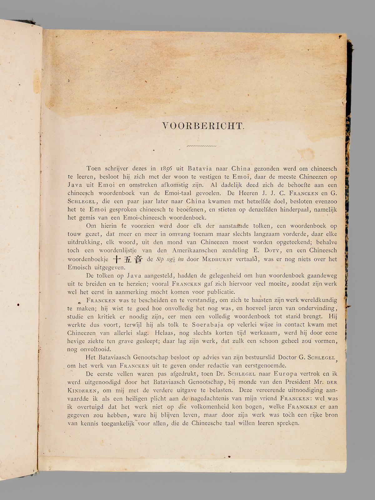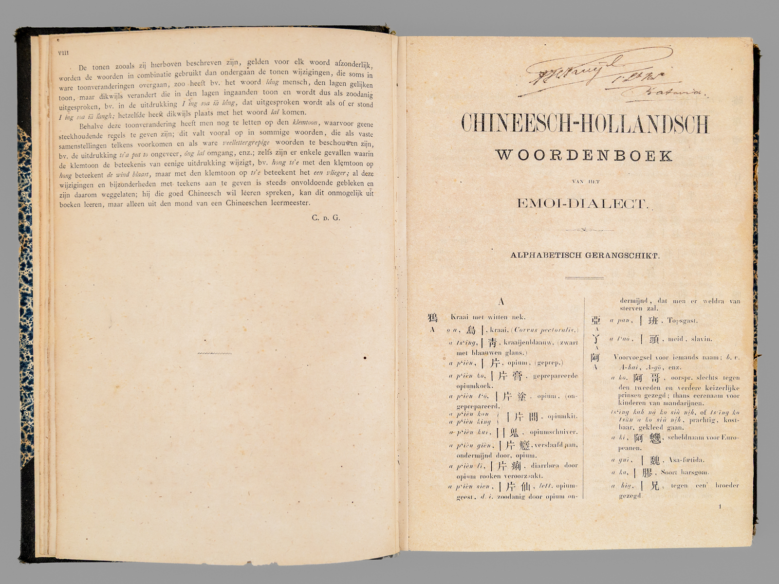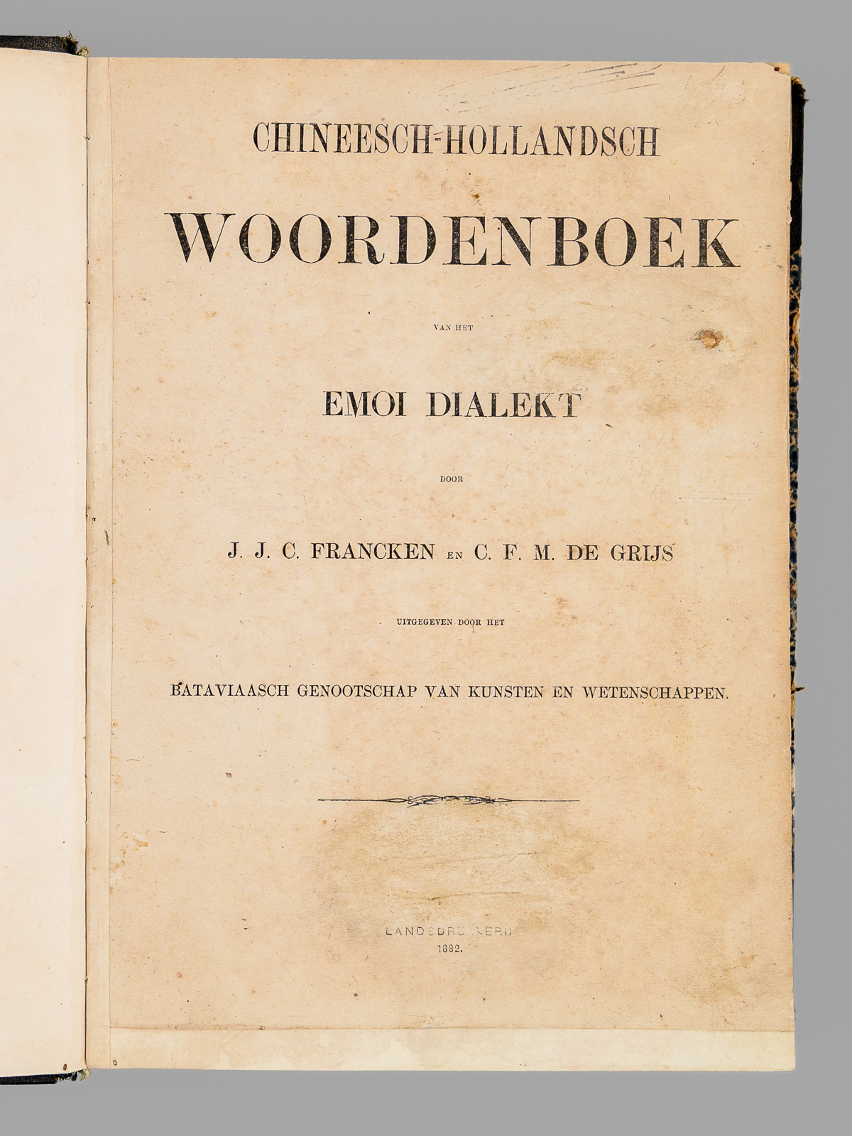 1 vol. grand in-8 cartonnage postérieur demi-percaline à coins noire, dos muet, Uitgegeven door het Bataviaasch Genootschap van Kunsten en Wetenschappen, Landsdrukkerij, 1882, VIII-774 pp. Commentaire : Publié à Batavia par l'Imprimerie Nationale, cet ouvrage est un outil fondamental pour notre connaissance du dialecte de Xiamen (historiquement appelé Amoy), une variante du Hokkien (Min Nan), mais il inclut également de nombreux éléments du dialecte de Zhangzhou. Une grande partie de la population chinoise en Indonésie étant d'origine Hokkien, la connaissance de ce dialecte par les fonctionnaires des Indes Néerlandaises était très importante. Published in Batavia by the Imprimerie Nationale, this work is a fundamental tool for our understanding of the Xiamen dialect (historically called Amoy), a variant of Hokkien (Min Nan), but it also includes many elements of the Zhangzhou dialect. Since a large part of the Chinese population in Indonesia was of Hokkien origin, knowledge of this dialect by officials in the Dutch East Indies was very important. Etat satisfaisant (petit accroc marginal sans mq. à qq. feuillets, restauration sans manque à 2 ff. in fine, accroc en dos muet, bon état par alleurs).