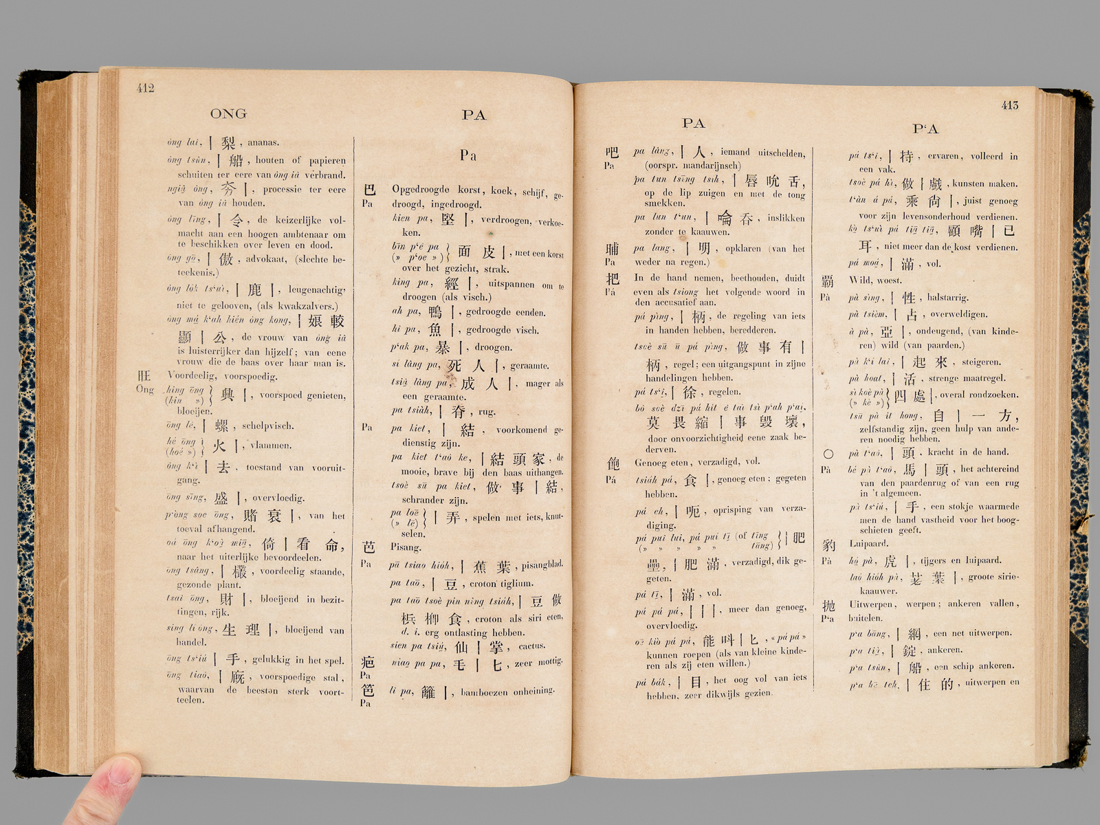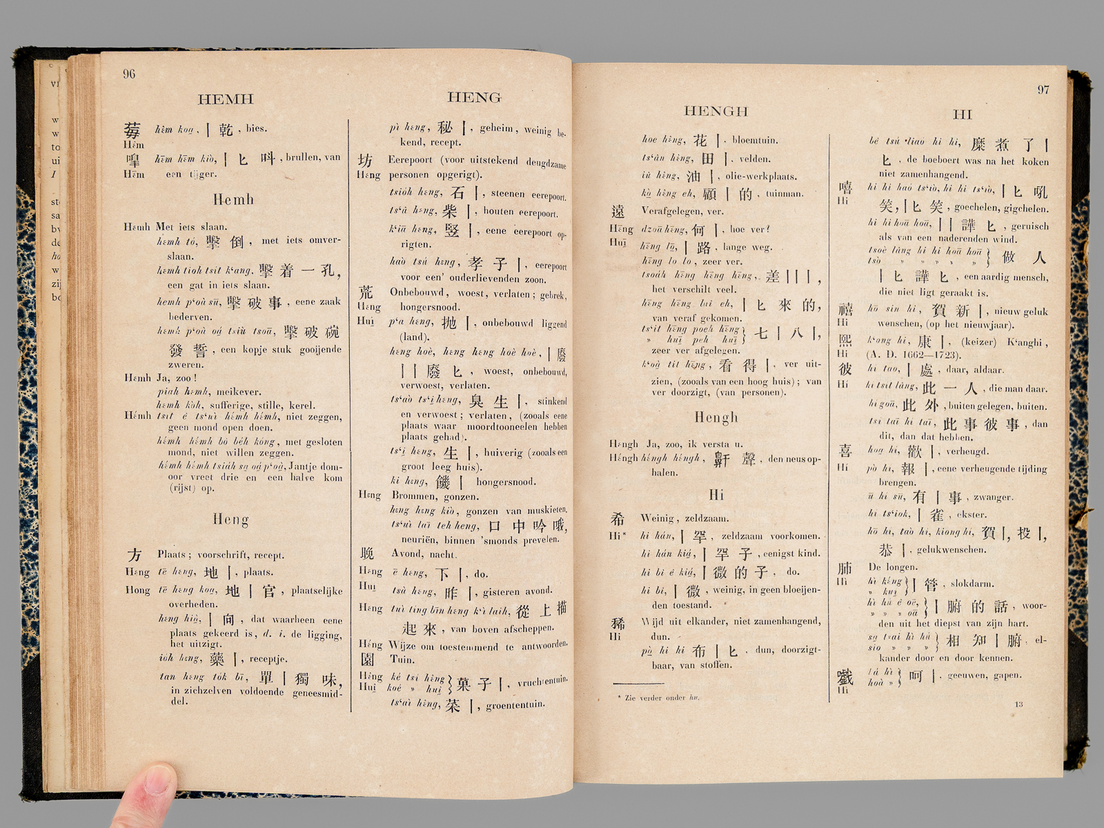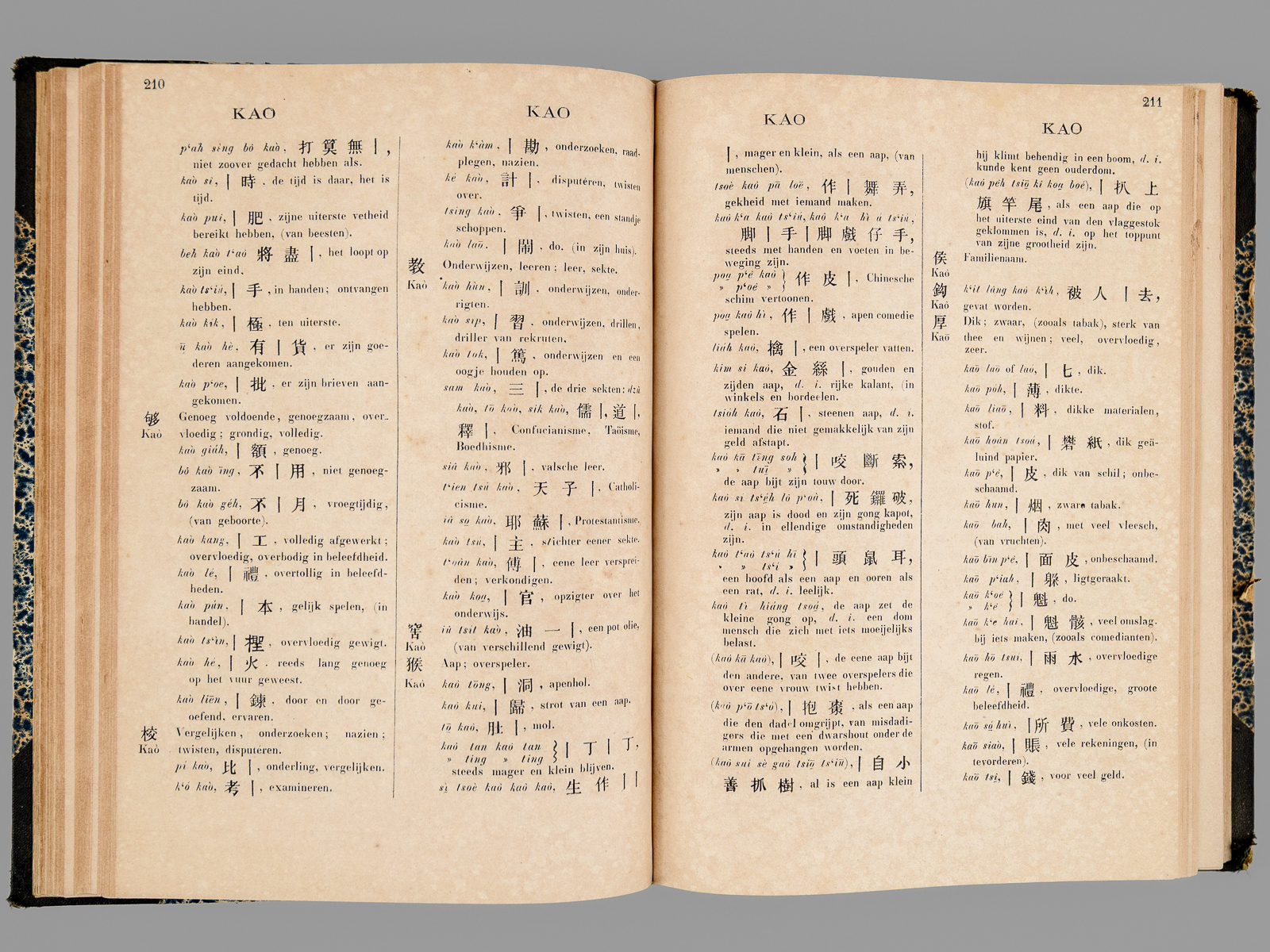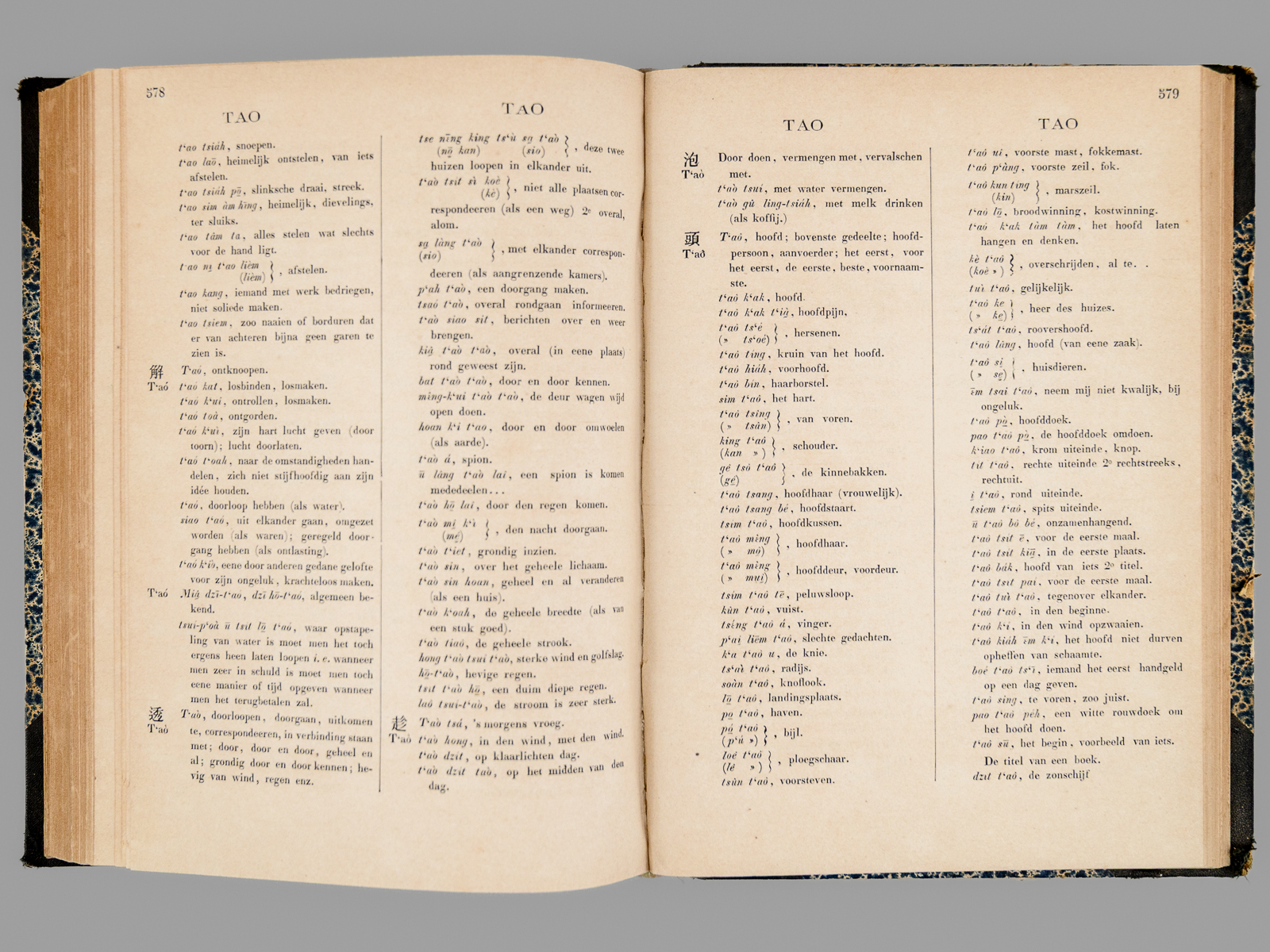 1 vol. grand in-8 cartonnage postérieur demi-percaline à coins noire, dos muet, Uitgegeven door het Bataviaasch Genootschap van Kunsten en Wetenschappen, Landsdrukkerij, 1882, VIII-774 pp. Commentaire : Publié à Batavia par l'Imprimerie Nationale, cet ouvrage est un outil fondamental pour notre connaissance du dialecte de Xiamen (historiquement appelé Amoy), une variante du Hokkien (Min Nan), mais il inclut également de nombreux éléments du dialecte de Zhangzhou. Une grande partie de la population chinoise en Indonésie étant d'origine Hokkien, la connaissance de ce dialecte par les fonctionnaires des Indes Néerlandaises était très importante. Published in Batavia by the Imprimerie Nationale, this work is a fundamental tool for our understanding of the Xiamen dialect (historically called Amoy), a variant of Hokkien (Min Nan), but it also includes many elements of the Zhangzhou dialect. Since a large part of the Chinese population in Indonesia was of Hokkien origin, knowledge of this dialect by officials in the Dutch East Indies was very important. Etat satisfaisant (petit accroc marginal sans mq. à qq. feuillets, restauration sans manque à 2 ff. in fine, accroc en dos muet, bon état par alleurs).