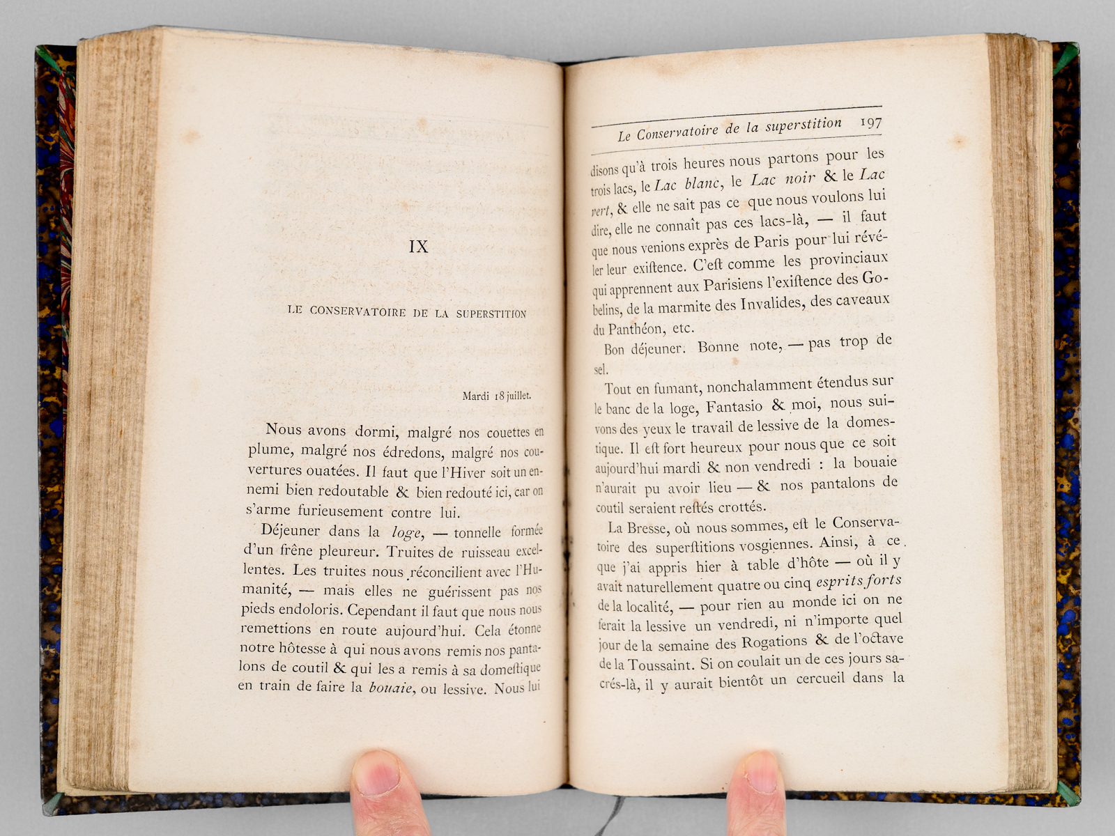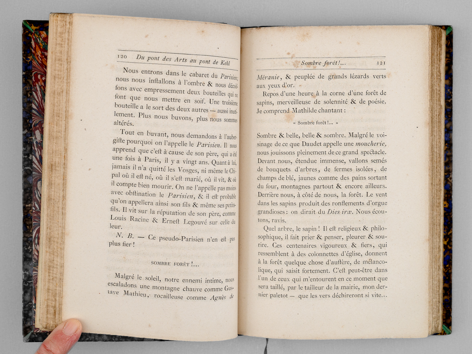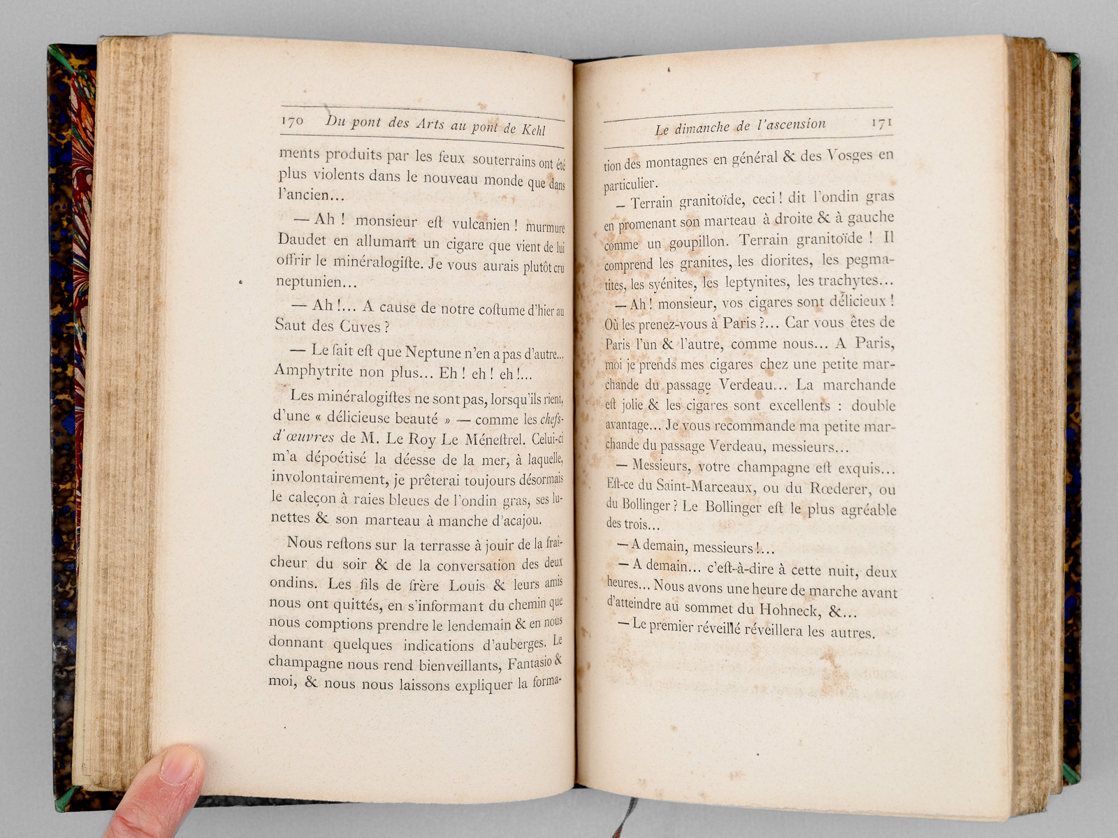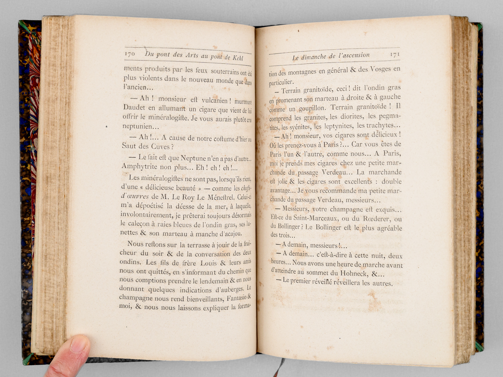 Avec un frontispice par Emile Bénassit, 1 vol. in-12 reliure de l'époque demi-chagrin maroquiné vert, dos à 5 nerfs, tête dorée, Achille Faure, Paris, 1866, 2 ff., 344 pp. Commentaire : Sans le frontispice, qui manque souvent. L'ouvrage est dédié à Alphonse Daudet, qui fut le compagnon de voyage de l'auteur vers l'Allemagne. Bon état (sans le frontispisce, des rouss.) pour cet exemplaire bien relié