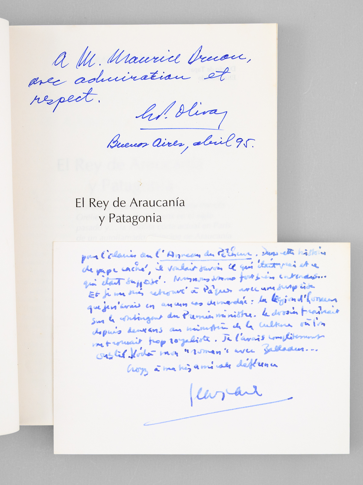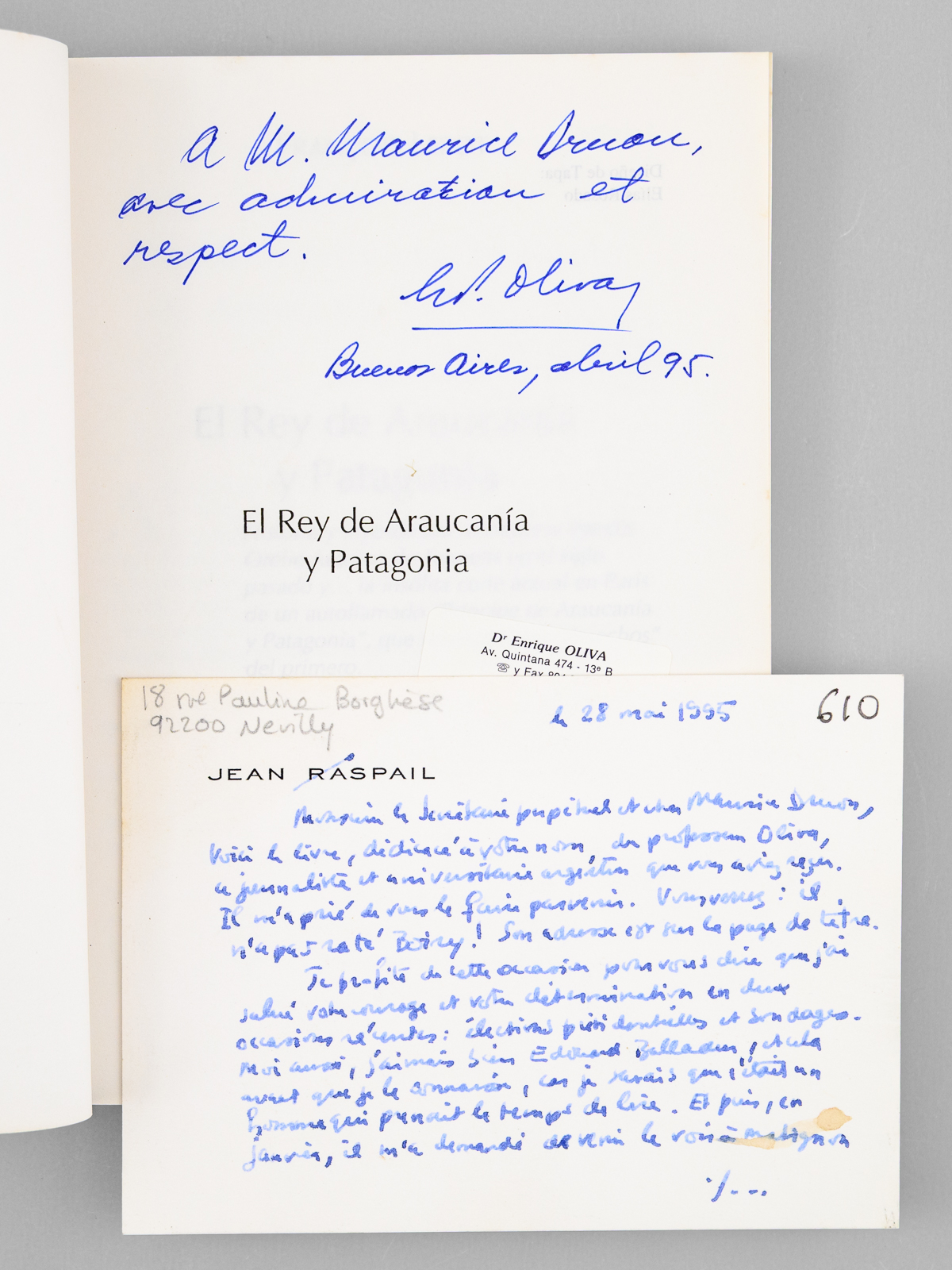 El Rey de Araucania y Patagonia [ Livre dédicacé par l'auteur Enrique Oliva à Maurice Druon - Avec une longue carte autographe signée de Jean Raspail à Maurice Druon ]