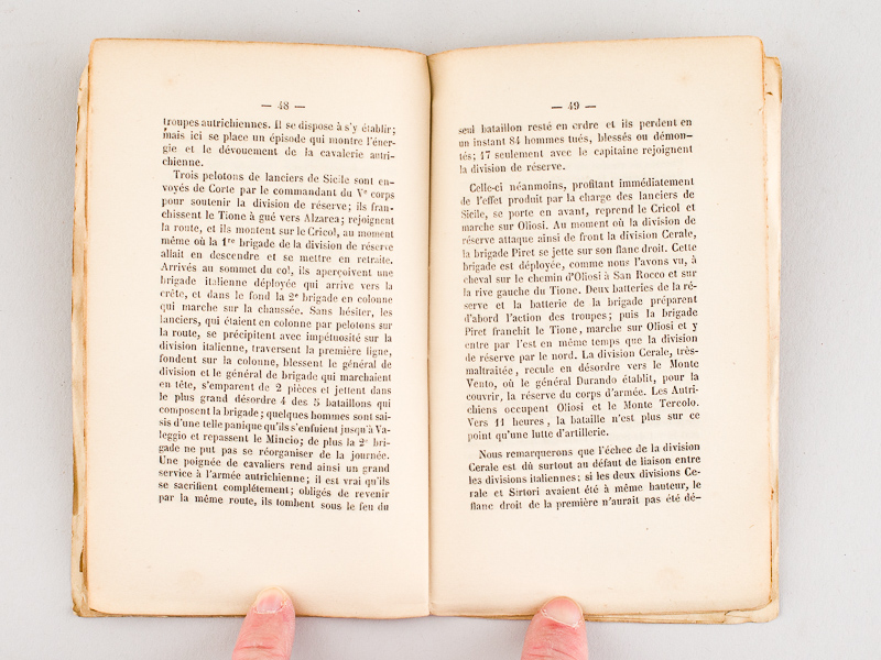 1 vol. in-18 br., Librairie Militaire de J. Dumaine, Paris, 1870, 74 p. avec 2 planches dépliantes Commentaire : Etat satisfaisant (couv. lég. frottée avec petit accroc au dos en tête, bon état par ailleurs) pour ce petit livre sur la troisième guerre d'indépendance italienne, au cours de laquelle les troupes italiennes tentèrent de rattacher la Vénétie au jeune Royaume d'Italie (proclamé en 1866). L'Italie s'était pour la circonstance alliée à la Prusse. L'Itallie fut sévèrement battue par l'Autriche à Custozza, mais récupéra néanmoins la Vénétie, suite à la défaite de l'Autriche devant la Prusse, à Sadowa. L'auteur de cet ouvrage était un officier français, qui fut notamment professeur à l'École d'application d'état-major, et lieutenant-colonel d'état-major