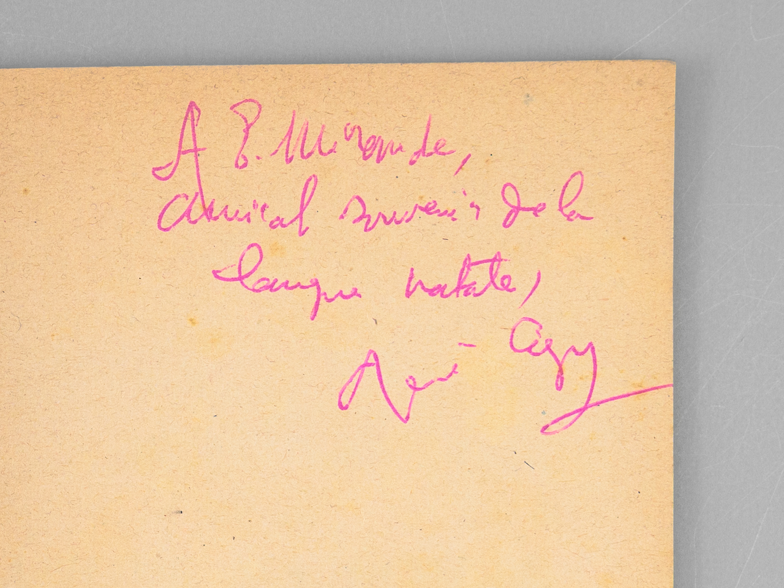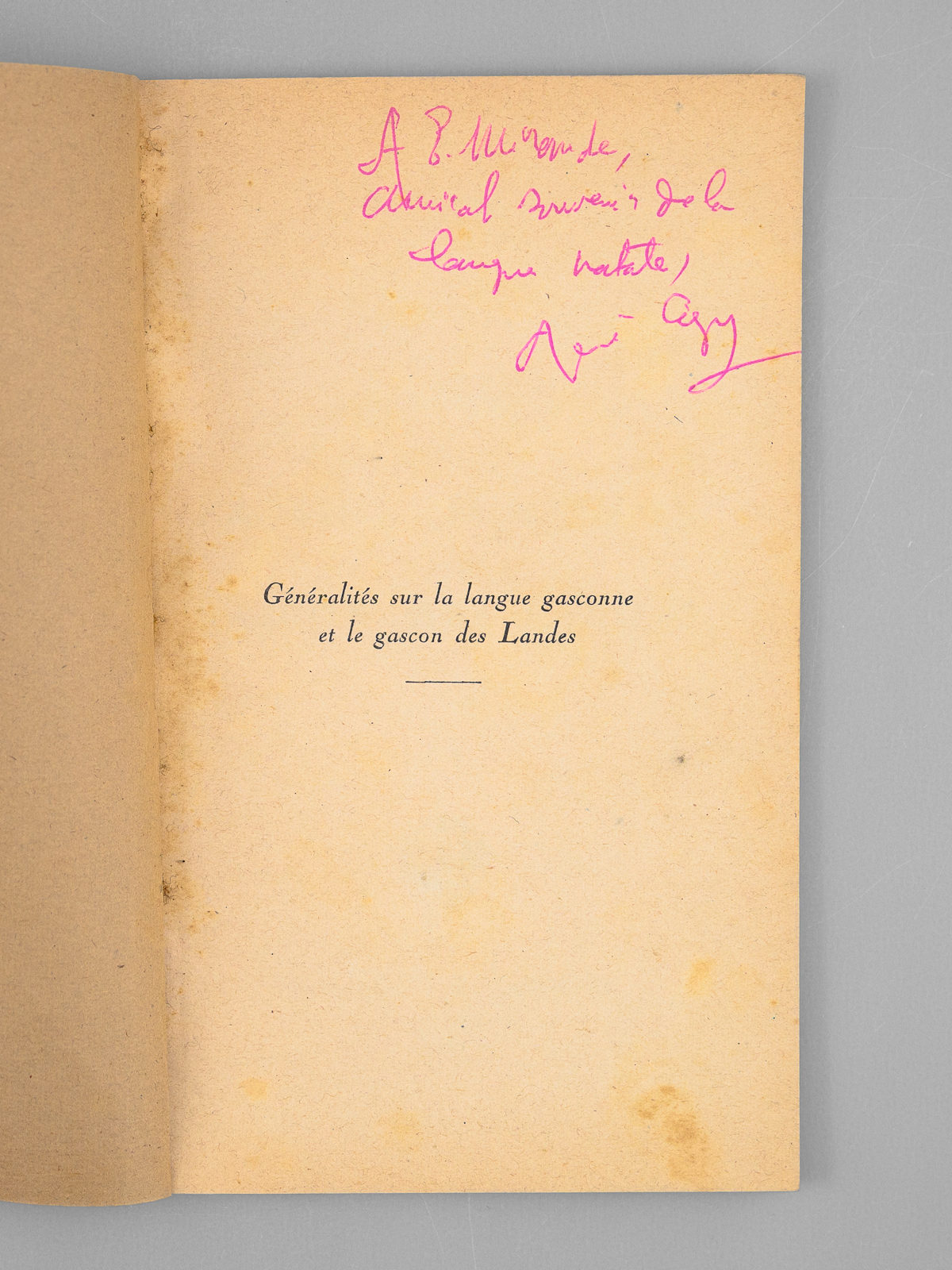 Commentaire : Envoi de l'auteur à M. Mirande, 'amical souvenir de la langue natale'. Bon exemplaire de cette monographie peu commune