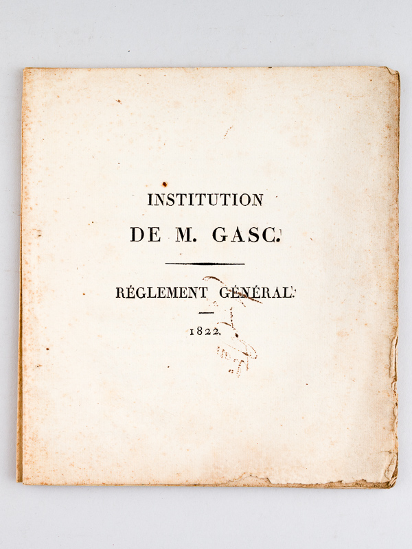Institution de M. Gasc. Règlement général 1822 [ On joint : ] Institution de M. Gasc, rue du Rocher, 29, Exercices littéraires-dramatiques de 1839. Samedi 6 avril. Programme - Auteur: GASC, M. - Année d'édition: 1822 |