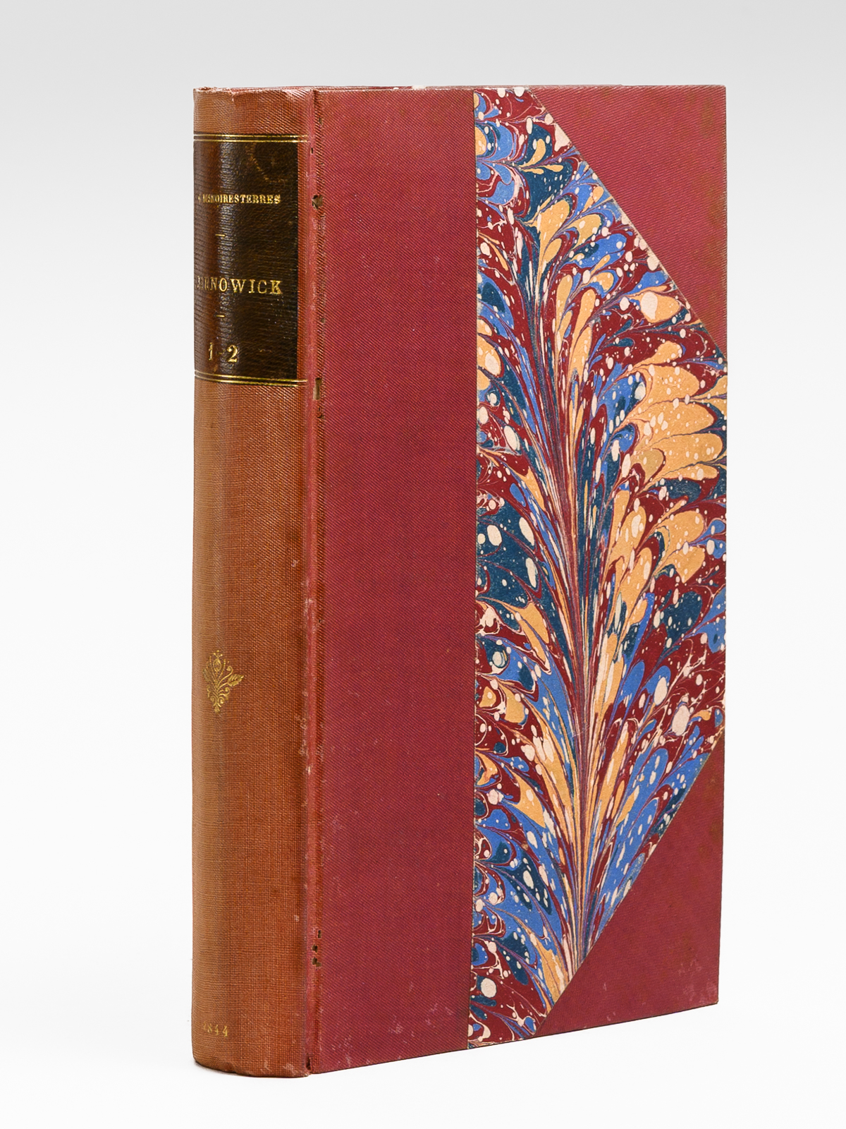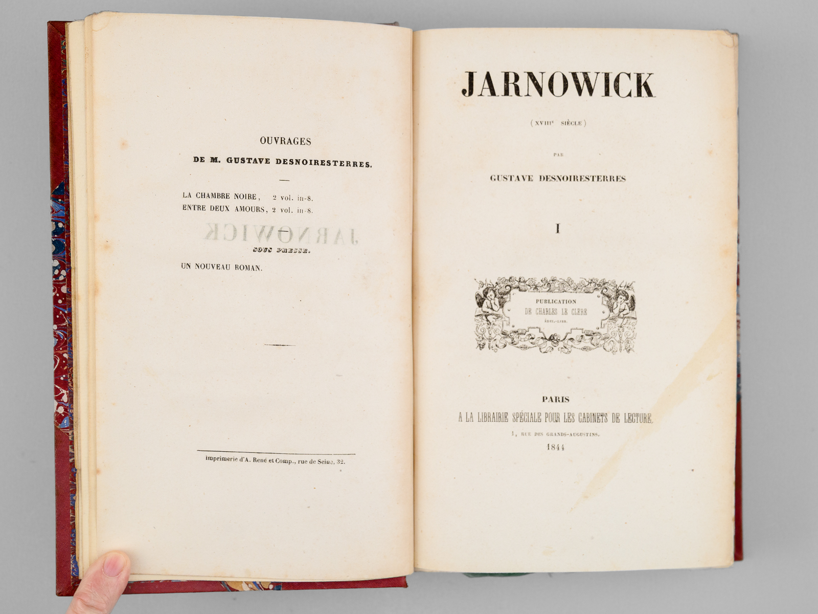 Commentaire : Très rare exemplaire de l'édition originale de cet écrit de jeunesse, provenant selon toute vraisemblance de la propre bibliothèque de l'auteur, l'écrivain normand Gustave Desnoireterres (1817-1892). Ce roman relate la vie extraordinaire du violoniste virtuose, d'origine dalmate (croate) et de culture italienne, Ivan Mane Jarnovic (encore connu sous les noms de Giovanni Mane Giornovichi, Jarnowick ou Jarnowitz). Elève d'Antonio Lolli, Jarnowick était fameux pour la pureté de son jeu et sa vigueur d'archet. 'M. Desnoiresterres s'est beaucoup occupé du XVIIIe siècle, de ses moeurs et de ses célébrités. Il en a scruté le côté intime avec talent et fait revivre avec habileté l'intéressante physionomie' (Larousse, GDU, VI, 573). Bon état (petits accrocs en mors en coiffe sup., qq. rares rouss., bon exemplaire par ailleurs) pour cet ouvrage de toute rareté.
