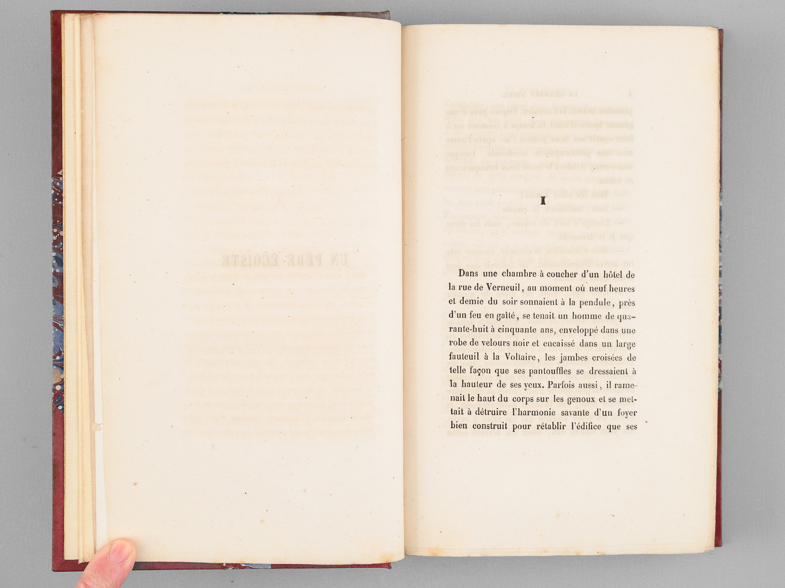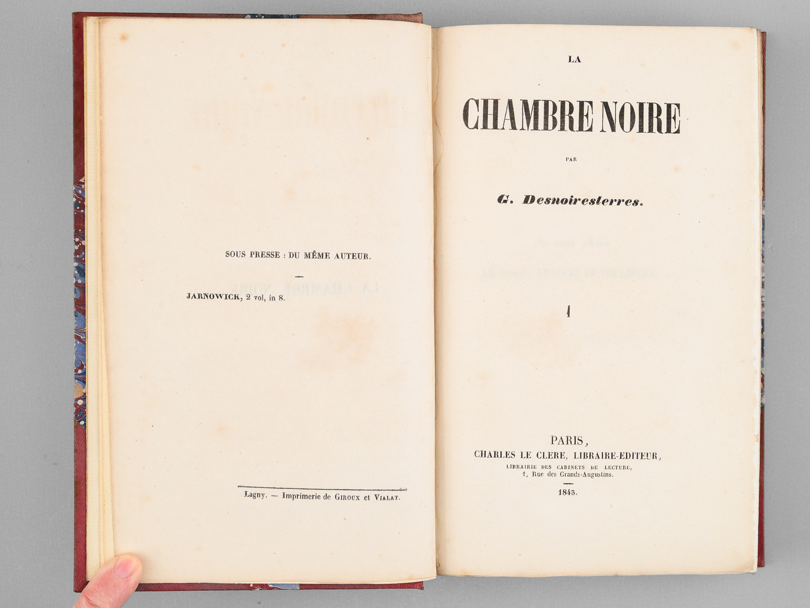 Commentaire : Très rare exemplaire de l'édition originale de cet écrit de jeunesse et premier ouvrage publié, provenant selon toute vraisemblance de la propre bibliothèque de l'auteur, l'écrivain normand Gustave Desnoireterres (1817-1892). Cet ouvrage est un recueil de 4 nouvelles : Un Père égoïste - L'élève de Philosophie - Le Notaire amoureux - La Barricade Sainte-Apolline. 'La Barricade Sainte-Apolline' commence le 28 juillet 1830, et 'L'élève de Philosophie' évoque le jeune Octave Favry, 'venu à Caen pour suivre à la faculté des lettres un cours de philosophie fait par un jeune professeur plein de hardiesse et d'éloquence', 'M. Charma auteur de 'Essai sur les bases et les développements de la moralité'...