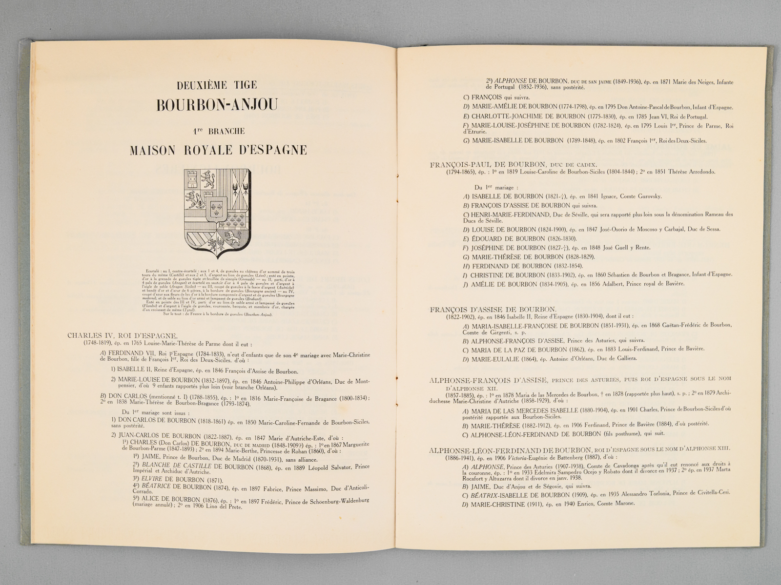 1 vol. in-4 br., S.G.A.F. éditeurs, Paris, 1952, 22 pages non-paginées, une feuille par branche, avec les armes de celle-ci, une planche en couleurs avec les armes respectives des Boubons, Bourbon-Busset, Bourbon-Sicile, Bourbon-Orléans, Bourbon-Anjou, Bourbon-Parme, Bourbon-Bragange. On joint deux exemplaires du bulletin de souscription aux 7 voumes du Grand Armorial. Commentaire : Bon état pour cette généalogie des diverses branches de la maison de Bourbon, depuis 1883, jusqu'à l'année d'édition (1952). Au sein de la maison de Bourbon, 1883 fut marquée par la disparition du Comte de Chambord (1820-1883), chef de la branche aînée, prétendant à la couronne de France sous le nom d'Henri V.