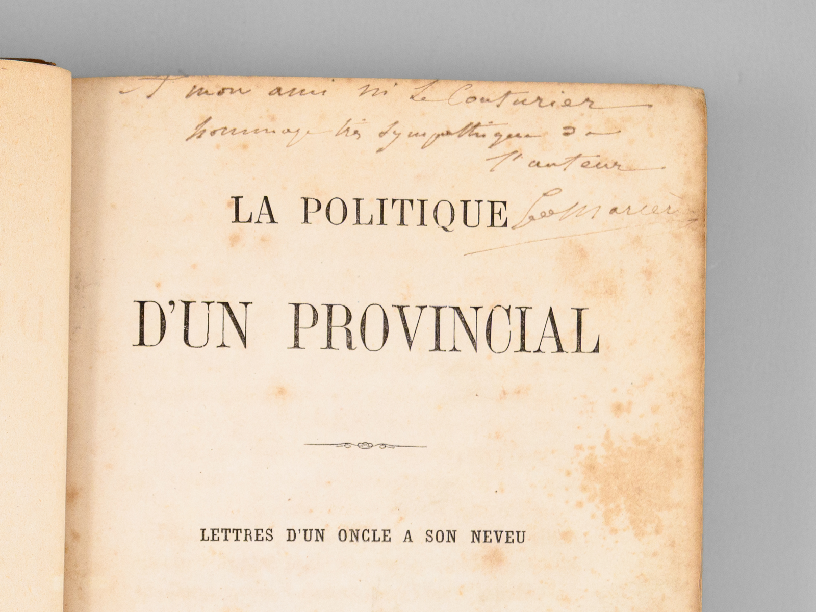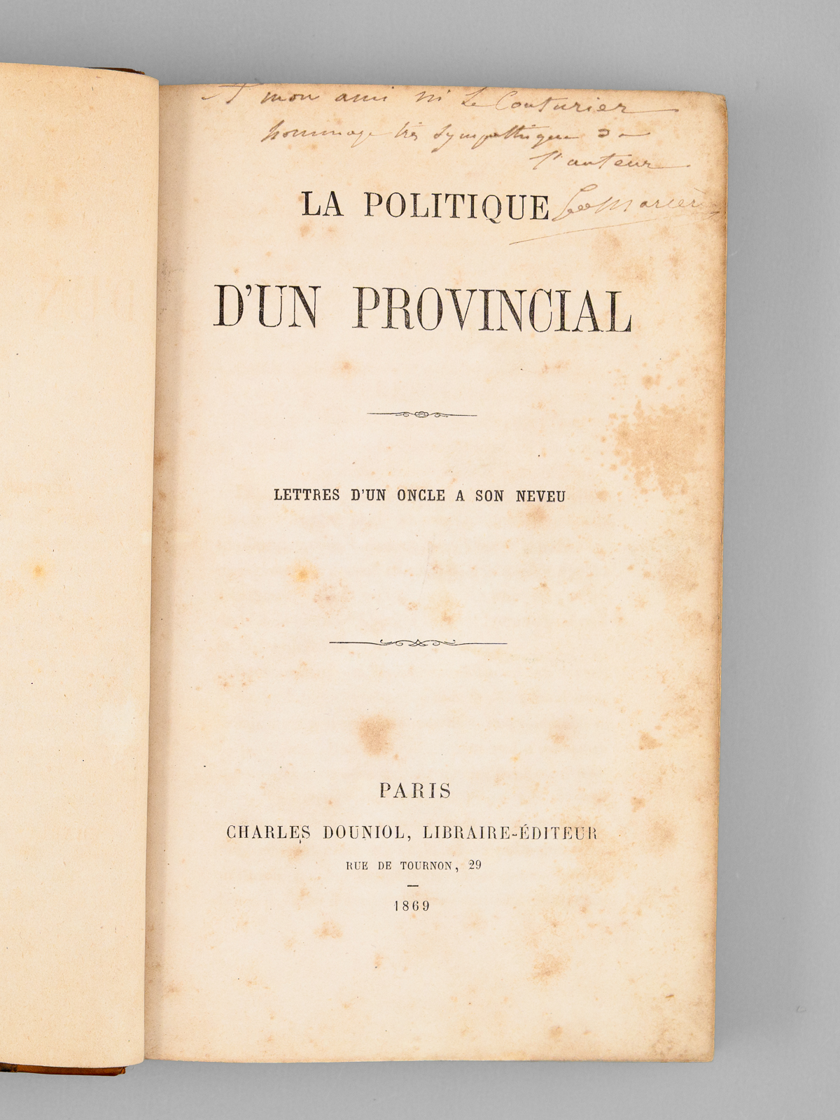 La Politique d'un Provincial. Lettres d'un Oncle à son Neveu [ Edition originale - Livre dédicacé par l'auteur ] - Auteur: ANONYME ; [ DESHAYES DE MARCERE, Emile Louis Gustave ] - Année d'édition: 1869