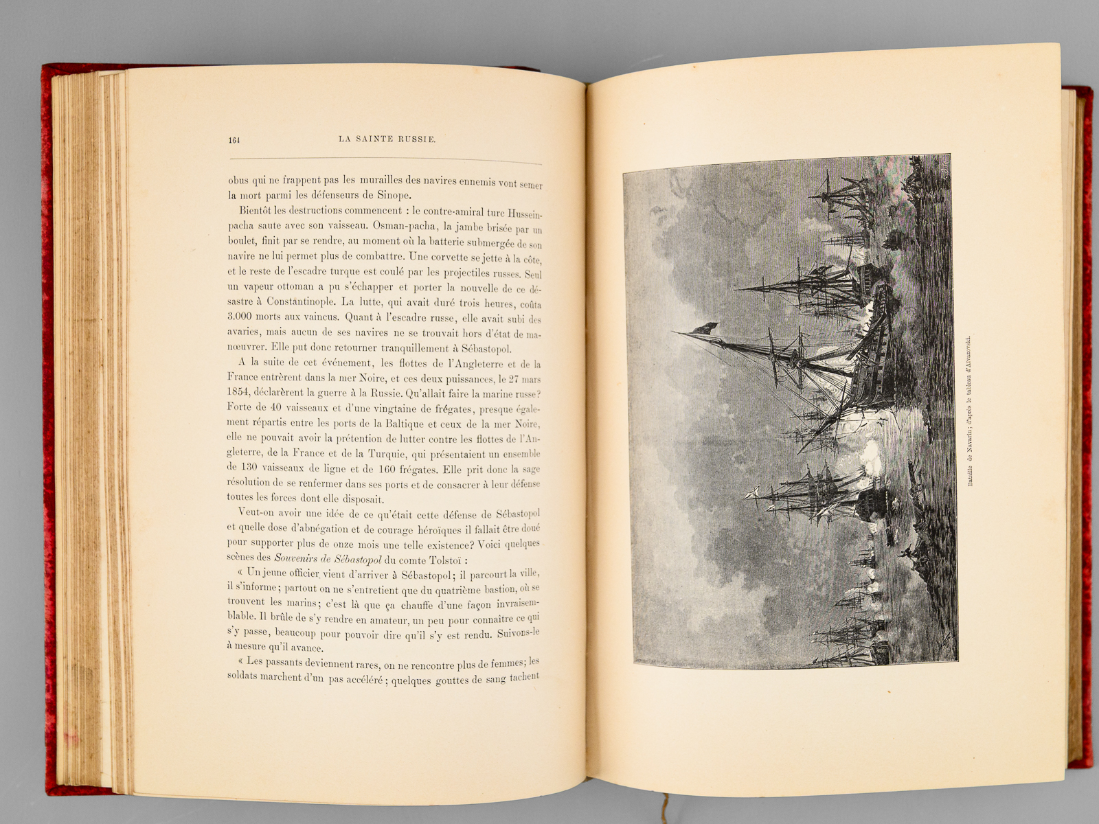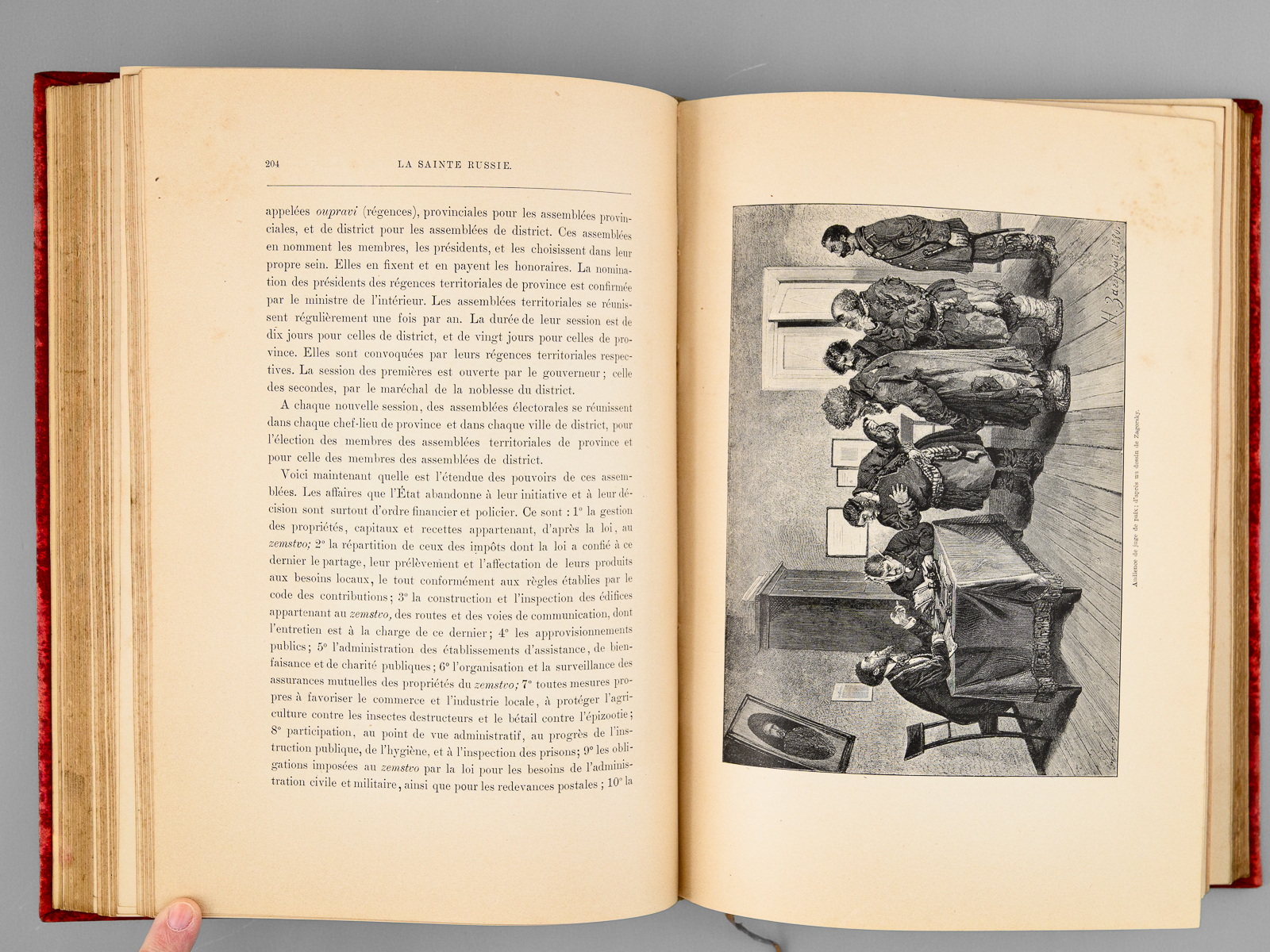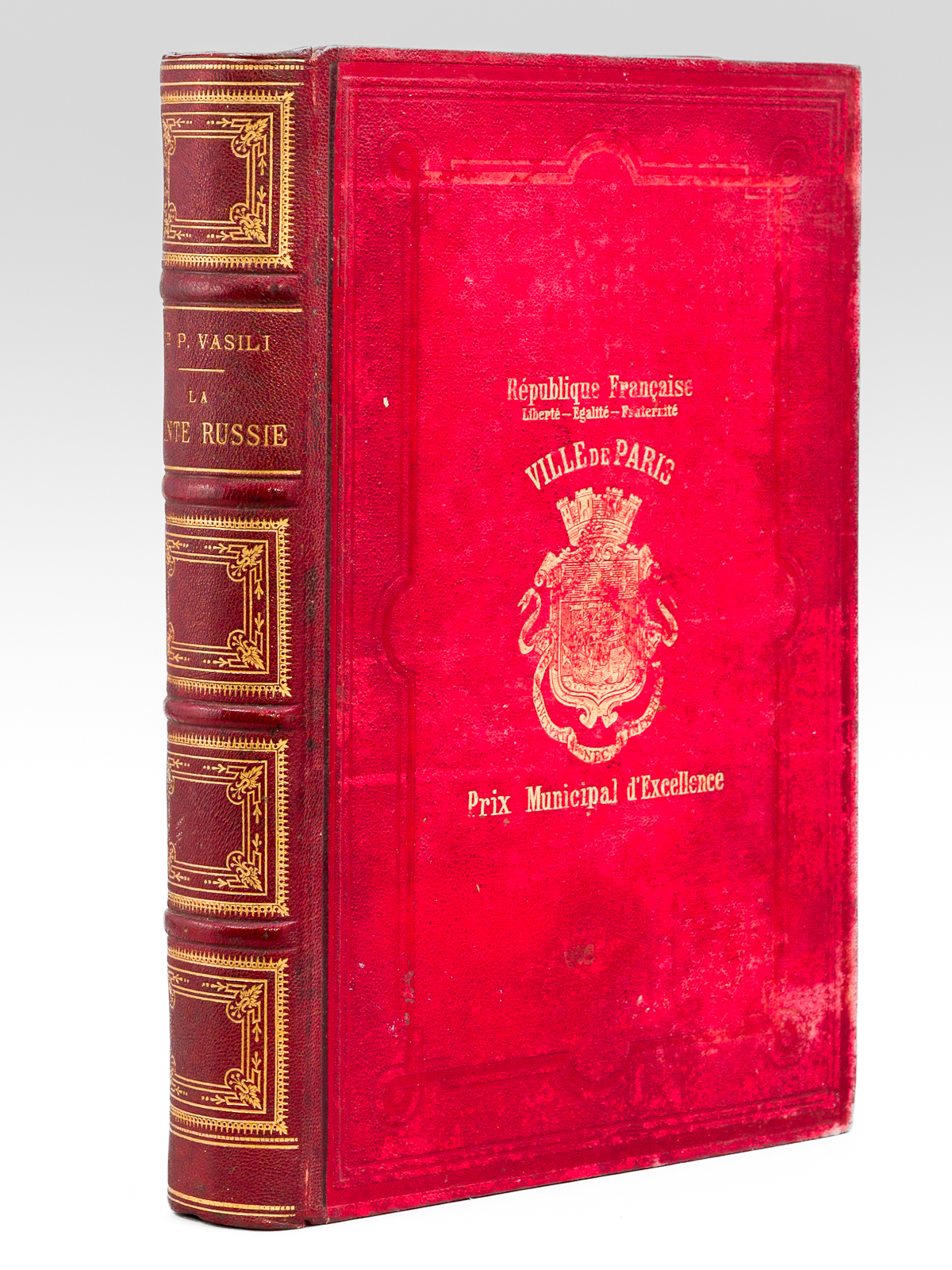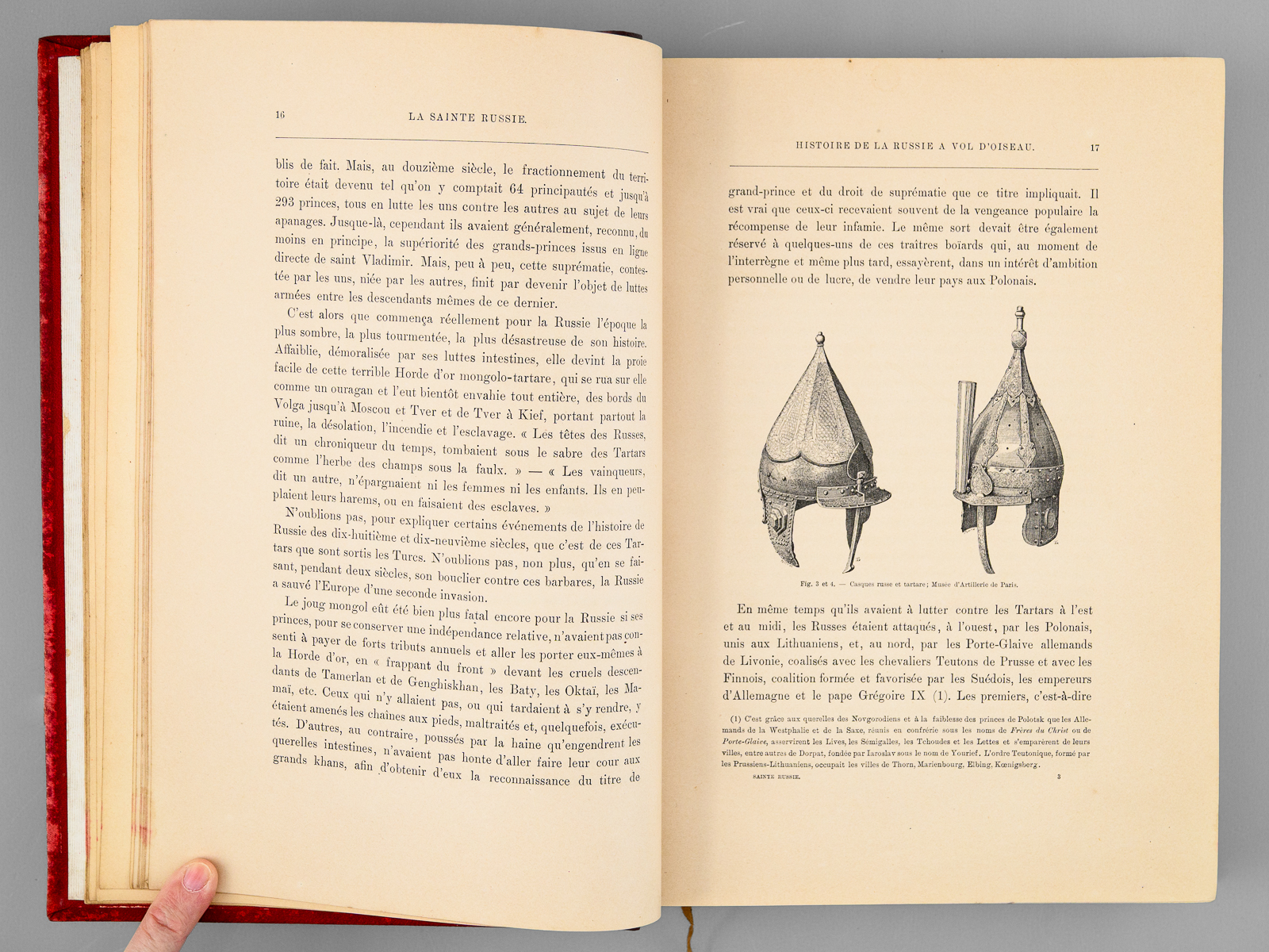 1 vol. in-4 rel demi-basane rouge, dos orné à 4 nerfs, fers de Prix Municipal d'Excellence de la Ville de Paris en plat sup., frontiscipe et ill. noir et blanc, qques chromolithographies couleurs h.t., toutes tranches dorées, Librairie Firmin-Didot et Cie, Paris, 1890, 550 pp. Titre complet : La Sainte Russie. la Cour, l'armée, le clergé, la bourgeoisie et le peuple. Ouvrage contenant 4 chromolithographies et plus de 200 gravures d'après les dessins d'Aviano, Bord, Chauvet, Dunki, Gaillard, Jouant, Lacker, Loevy, Martin, Mencina, Montader, Roguet, Vallet et Waret.