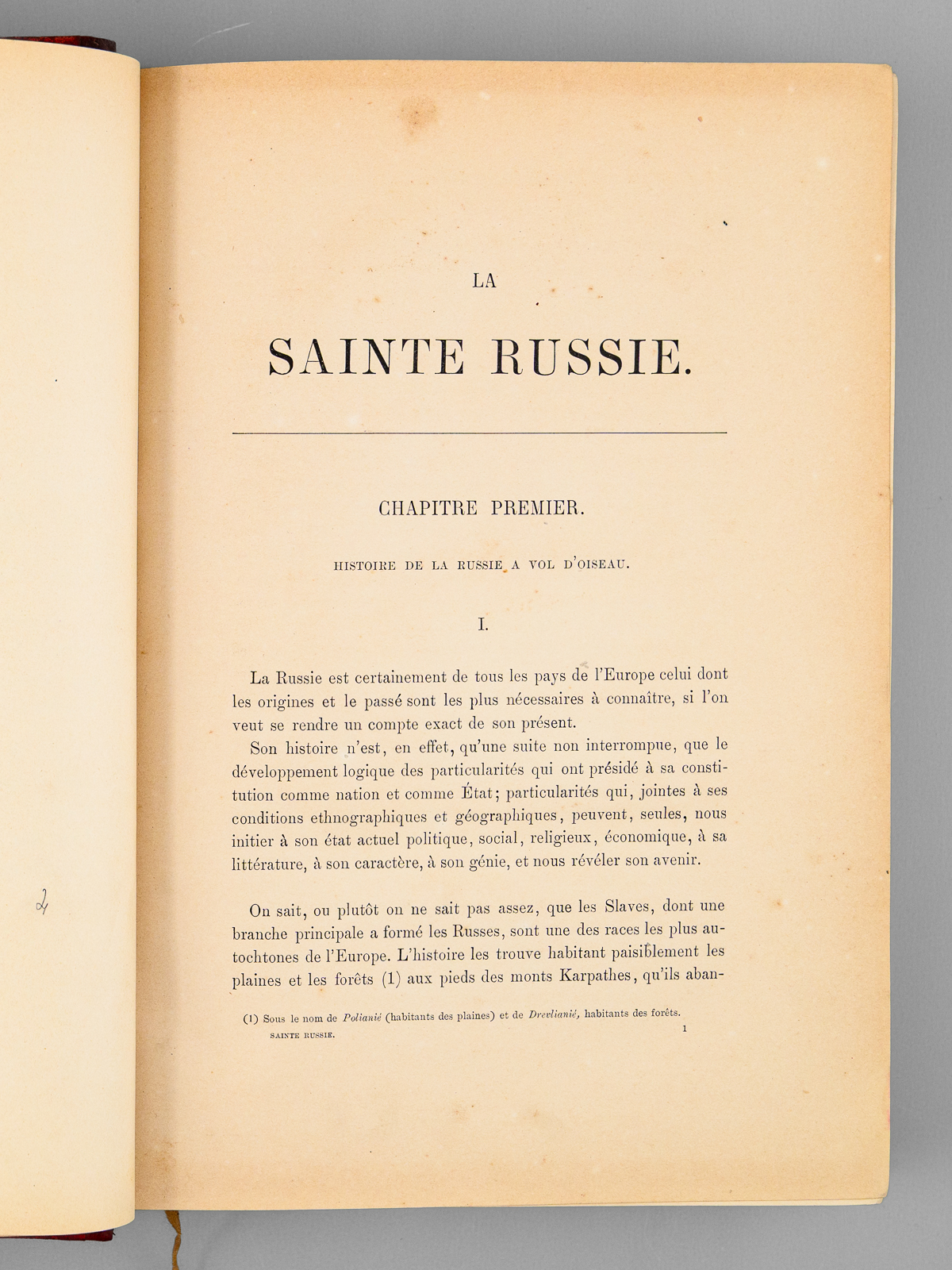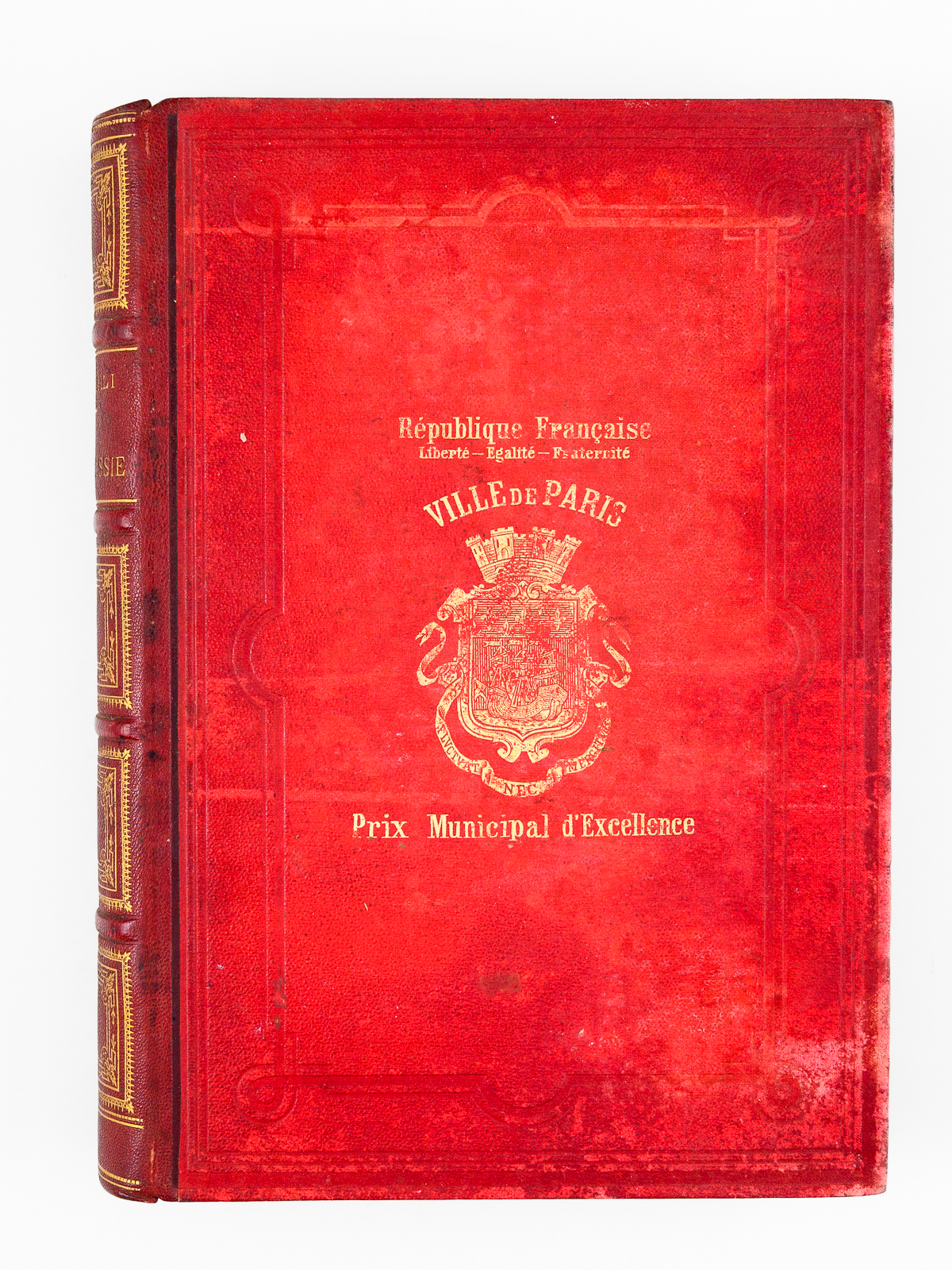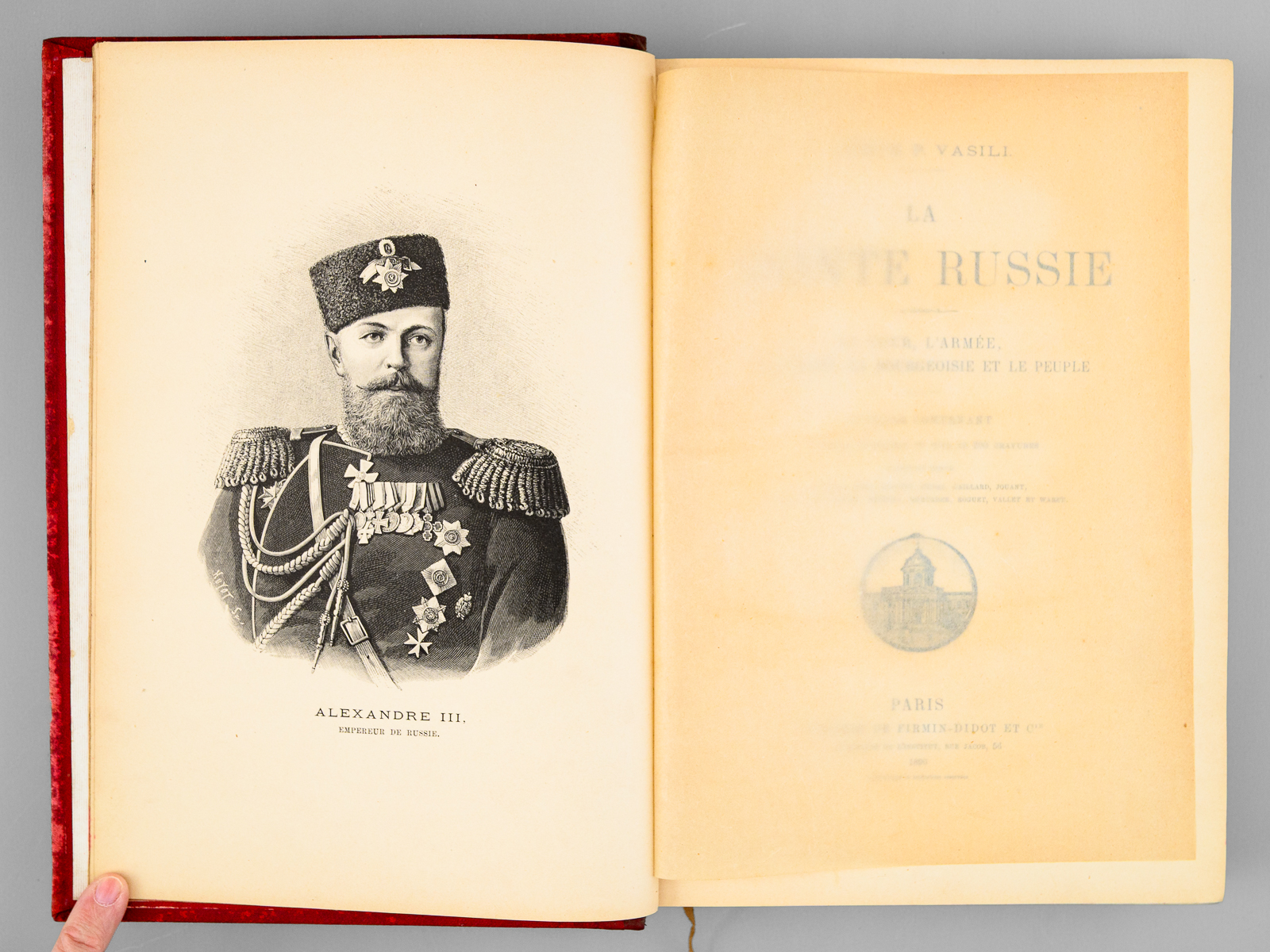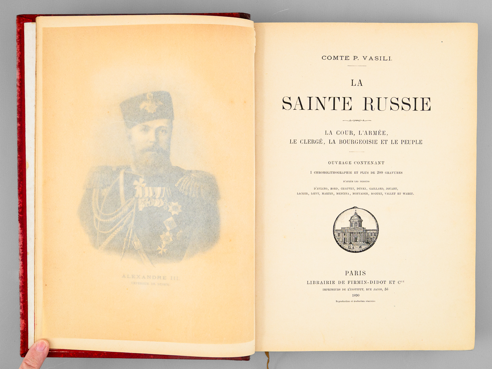 1 vol. in-4 rel demi-basane rouge, dos orné à 4 nerfs, fers de Prix Municipal d'Excellence de la Ville de Paris en plat sup., frontiscipe et ill. noir et blanc, qques chromolithographies couleurs h.t., toutes tranches dorées, Librairie Firmin-Didot et Cie, Paris, 1890, 550 pp. Titre complet : La Sainte Russie. la Cour, l'armée, le clergé, la bourgeoisie et le peuple. Ouvrage contenant 4 chromolithographies et plus de 200 gravures d'après les dessins d'Aviano, Bord, Chauvet, Dunki, Gaillard, Jouant, Lacker, Loevy, Martin, Mencina, Montader, Roguet, Vallet et Waret.