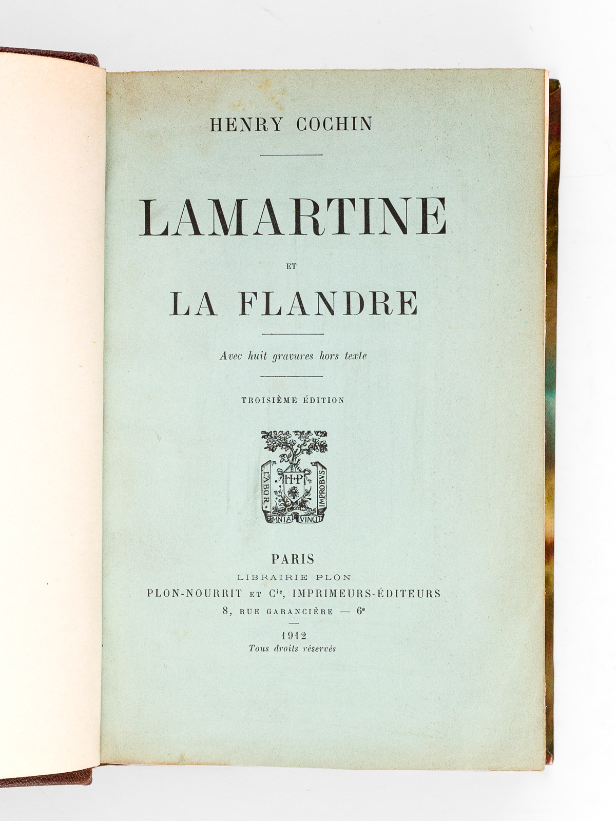 Avec huit gravures hors texte, troisième édition, 1 vol. petit in-8 reliure postérieure demi-chagrin brun, dos à 5 nerfs, couvertures conservées : Lamartine et la Flandre, Troisième édition, Librairie Plon, Plon-Nourrit et Cie, Paris, 1912, XXVI-442 pp. [ Suivi de : ] A M. de Lamartine, Candidat à la Députation de Toulon et Dunkerque, Extrait de la 13ème Livraison de Némésis, par Barthélémy, Imp. de veuve Weins, 2 ff. [ Edition originale ] [ Suivi de : ] Electeurs ! Nommons M. de Lamartine, Bergues, 5 juillet 1831, 1 f. [ Edition originale ] [ Suivi de : ] Electeurs ! Laet ons myn heer De Lamartinenaemen. bergen den 5 julius 1831 [ Edition originale ] [ Suivi de : ] A Messieurs les Electeurs du 2me arrondissement de Dunkerque, par Alphonse de Lamartine, 24 juin 1831, Imprimerie de Vanwormhoudt, Dunkerque, 2 ff. [ Edition originale ] [ Suivi de : ] Explication aux Electeurs, par Alphonse de Lamartine, Hondschoote, 2 juillet 1831, 2 ff., [ Edition originale ] [ Suivi de : ] A Messieurs les Electeurs du 2me Arrondissement de Dunkerque, par Alphonse de Lamartine, Hondschoote, 2 juillet 1831, Vanwormhoudt, Imprimeur du Roi, Dunkerque, 1 f. dépliant [ Edition originale ] [ Suivi de : ] A Messieurs les Electeurs de l'arrondissement de Bergues, par Alphonse de Lamartine, St-Point, 22 octobre 1837, Imp. de Vanwormhoudt, Dunkerque [ Edition originale ] [ Suivi de : ] A Messieurs les Electeurs de l'arrondissement de Dunkerque - Bergues, par Alphonse de Lamartine, St-Point, 17 novembre 1837, Imp. de Vanwormhoudt, Dunkerque, 7 pp.