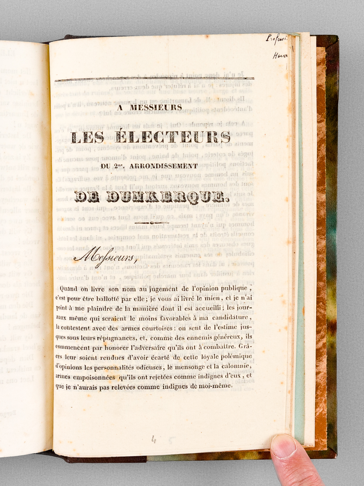 Commentaire : Remarquable exemplaire recueillant, in-fine, 8 très rares prospectus électoraux, en édition originale, relatifs aux candidatures d'Alphonse de Lamartine aux élections de la ville de Bergues (Nord). Eugénie, la soeur de Lamartine et épouse du Baron Coppens et seigneur d'Hondschoote, l'avait incité à se présenter à la députation. Battu une première fois, il sera élu député de Bergues en janvier 1833. Bon exemplaire (ex-libris Robert Thibaut).