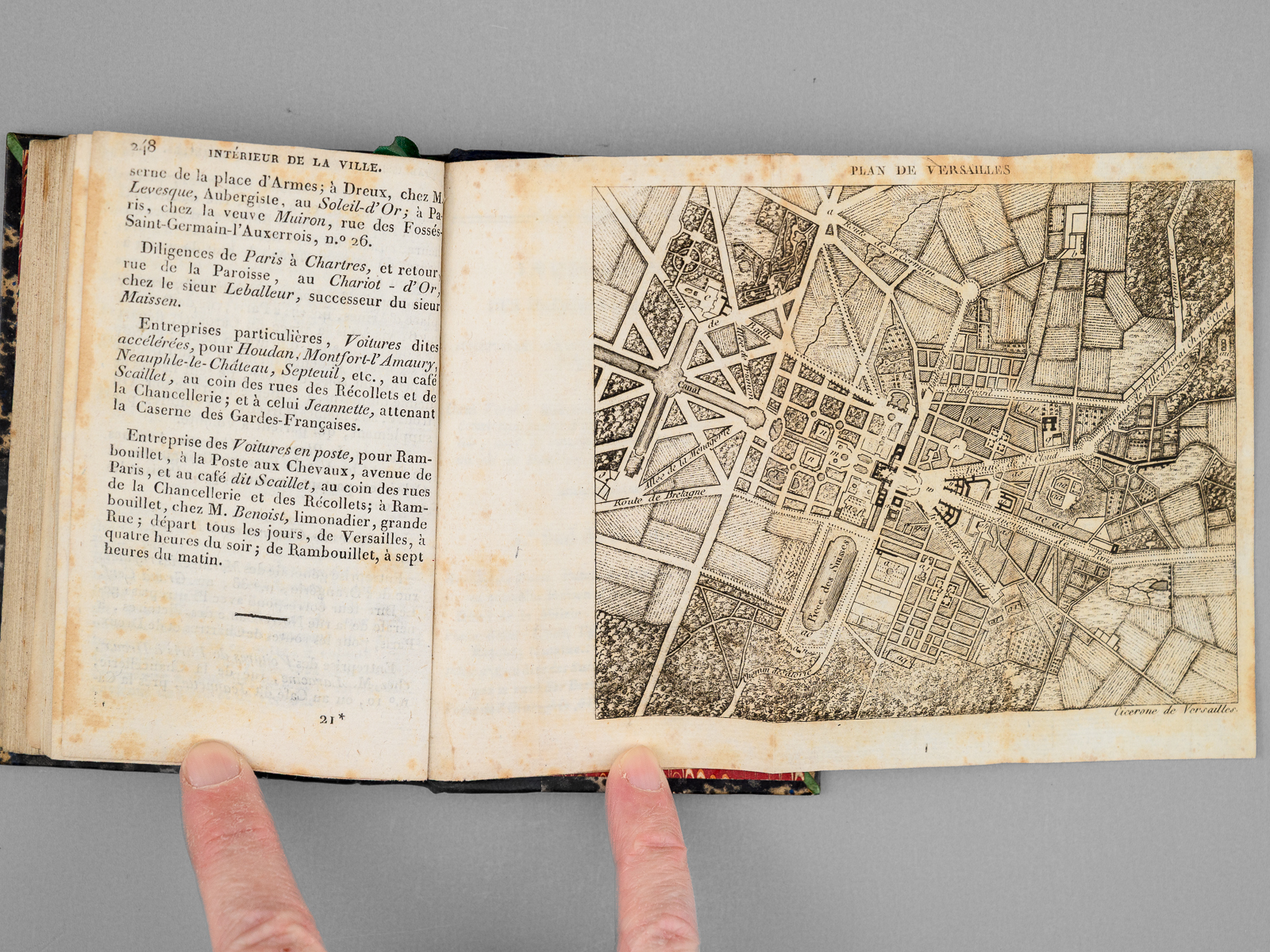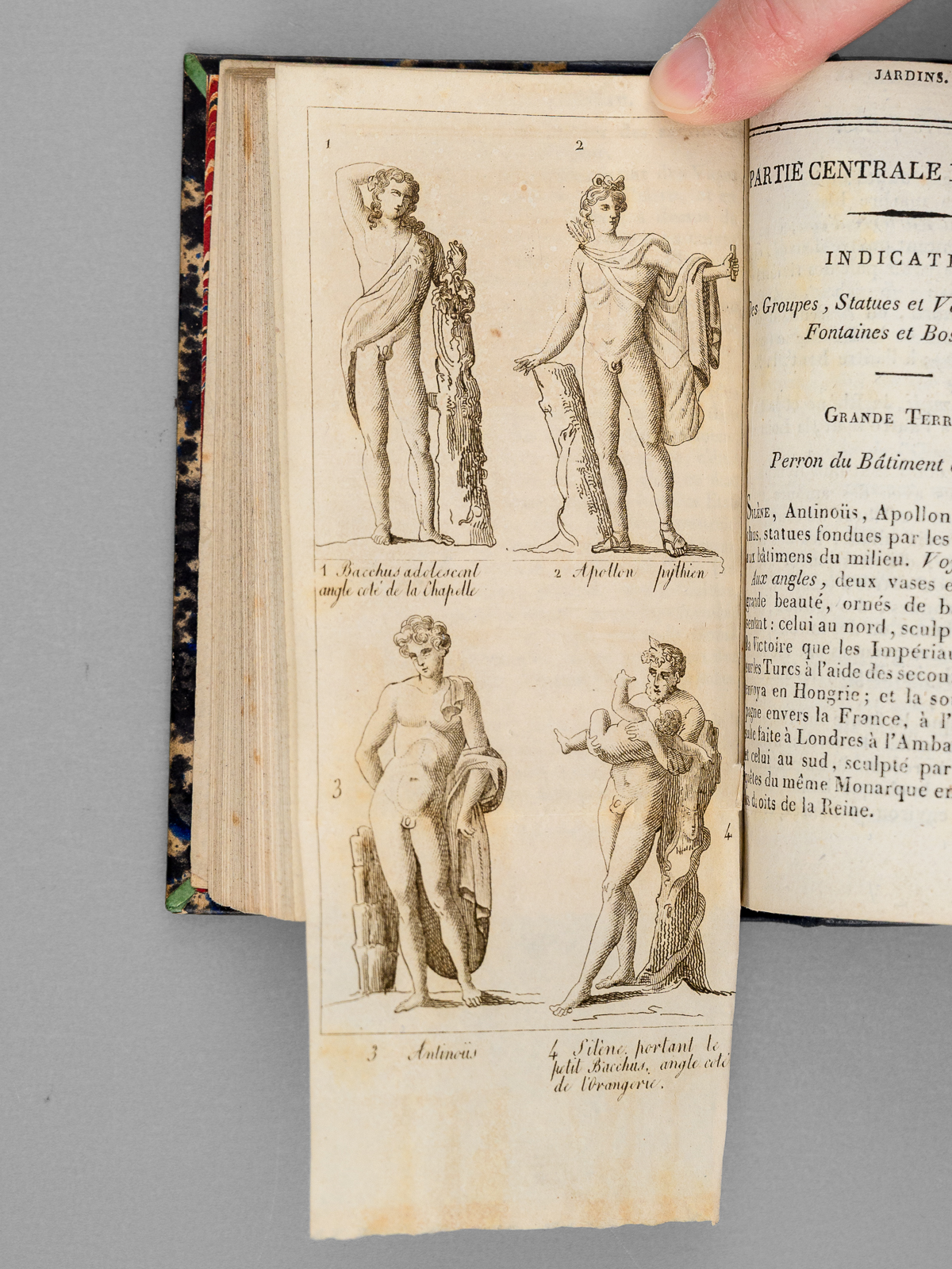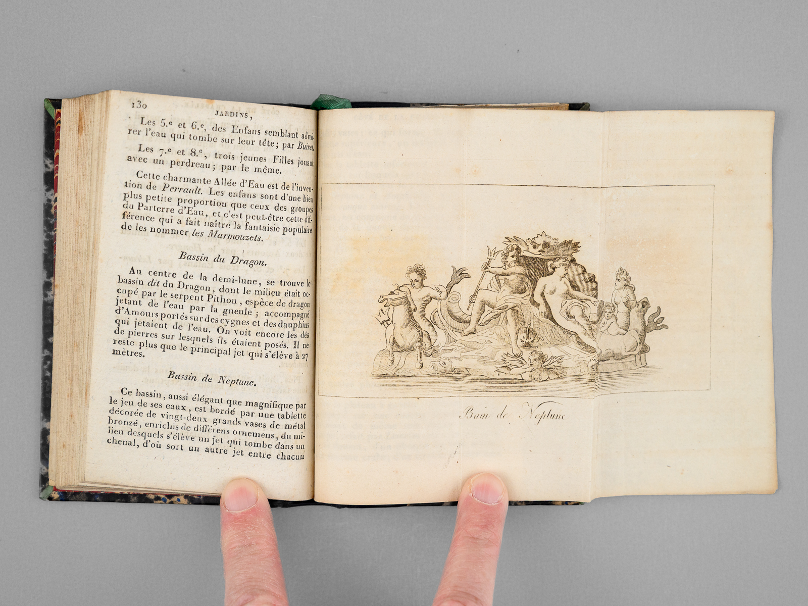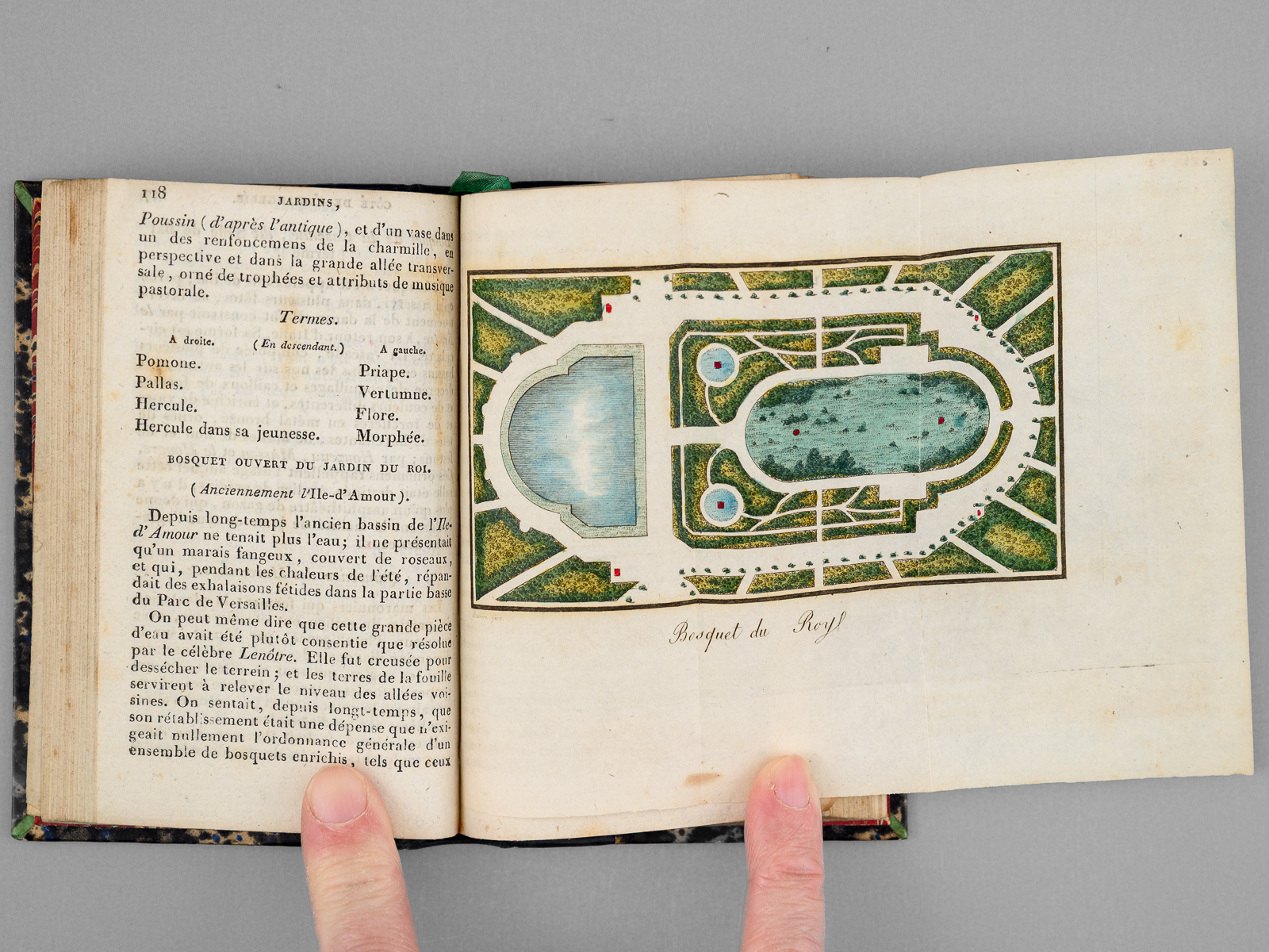 Commentaire : Bon exemplaire bien relié, bien relié du plan et des 8 gravures dont celle, dépliante et en couleurs, du 'Bosquet du Roy'. Charmant exemplaire (qq. rouss., très bon état par ailleurs).