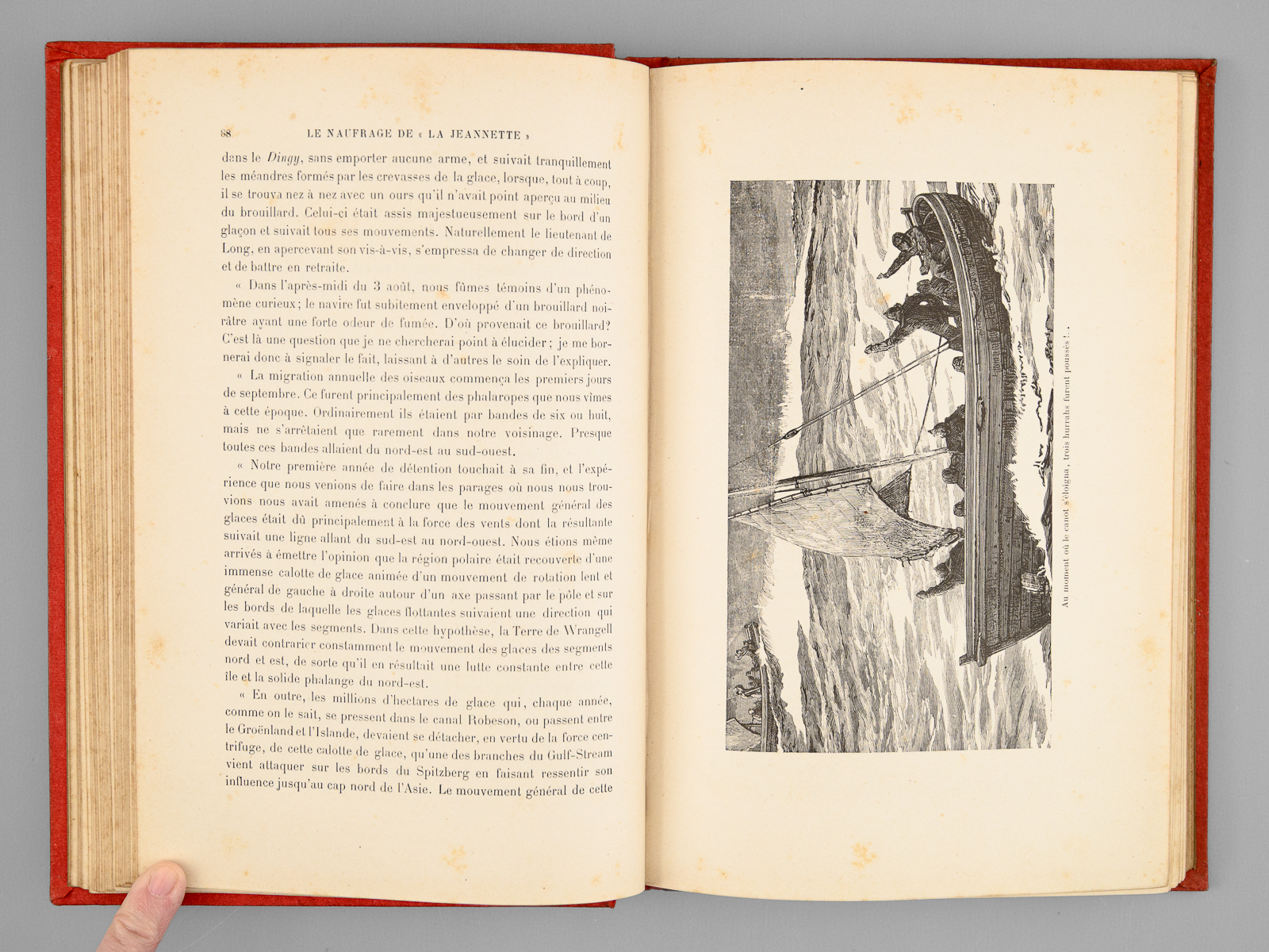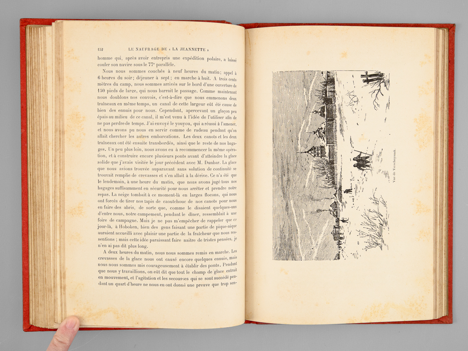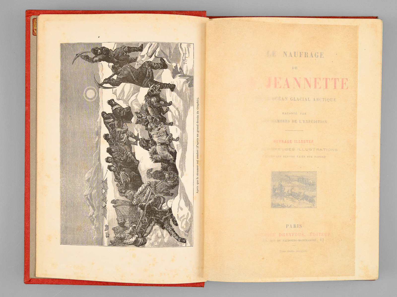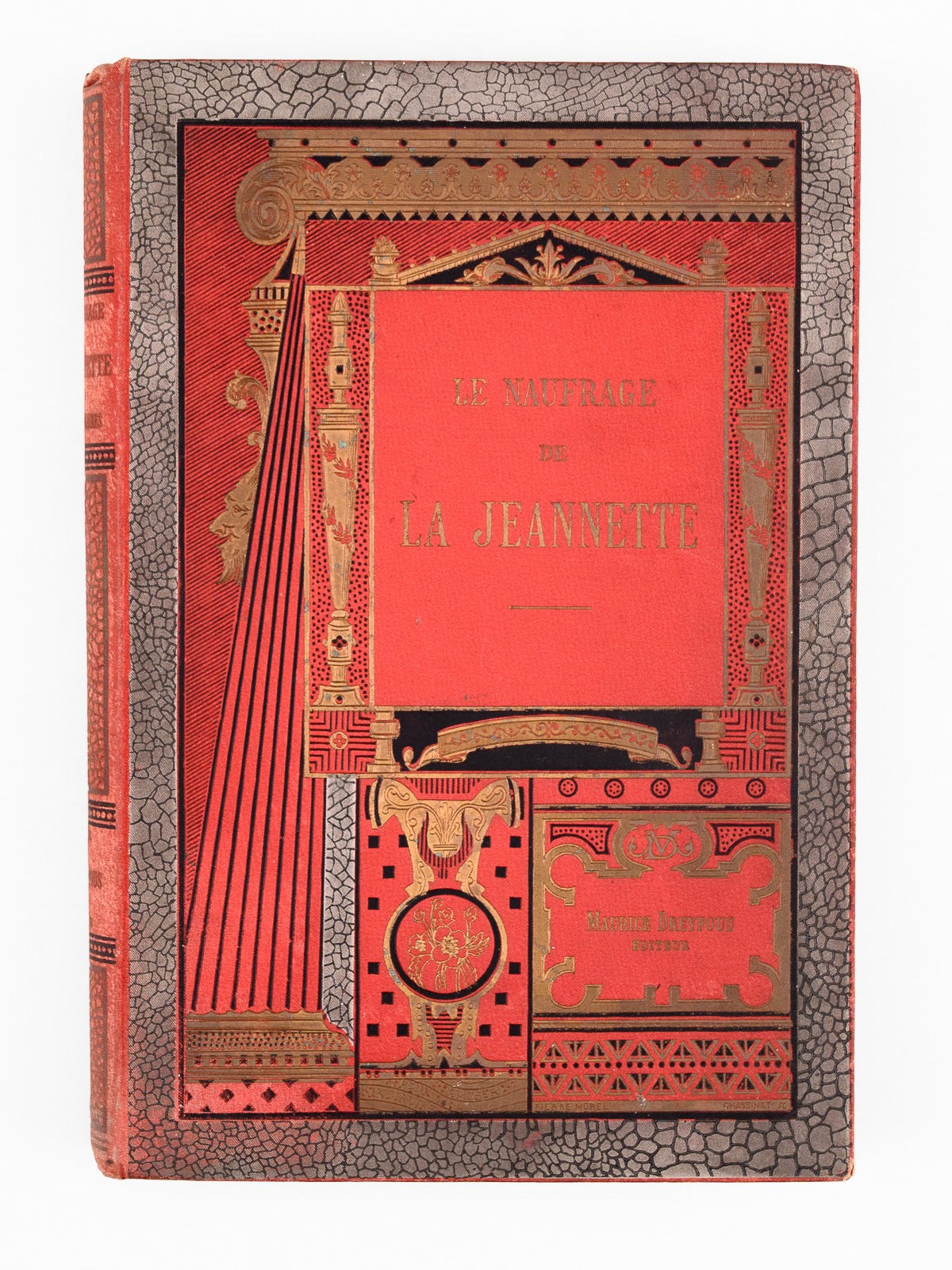 Ouvrage illustré de nombreuses illustrations d'après les dessins faits sur nature, 1 vol. in-8 cartonnage éditeur pleine percaline rouge richement orné, toutes tranches dorées, Maurice Dreyfous, Paris, s.d. [ circa 1890 ], VIII-306 pp. Commentaire : L'expédition de la Jeannette, officiellement dénommée 'US Arctic Expedition' est une expédition polaire américaine commandée par George Washington De Long de 1879 à 1881. Elle visait à rejoindre le Pôle Nord via le détroit de Béring, croyant possible de circuler sur un courant tempéré, le Kuroshio. Piégée par les glaces, la Jeannette dérivera 2 ans, le commandant De Long et De Long et vingt de ses compagnons y trouveront la mort. Bon état (qq. rouss., très bon éat par ailleurs).