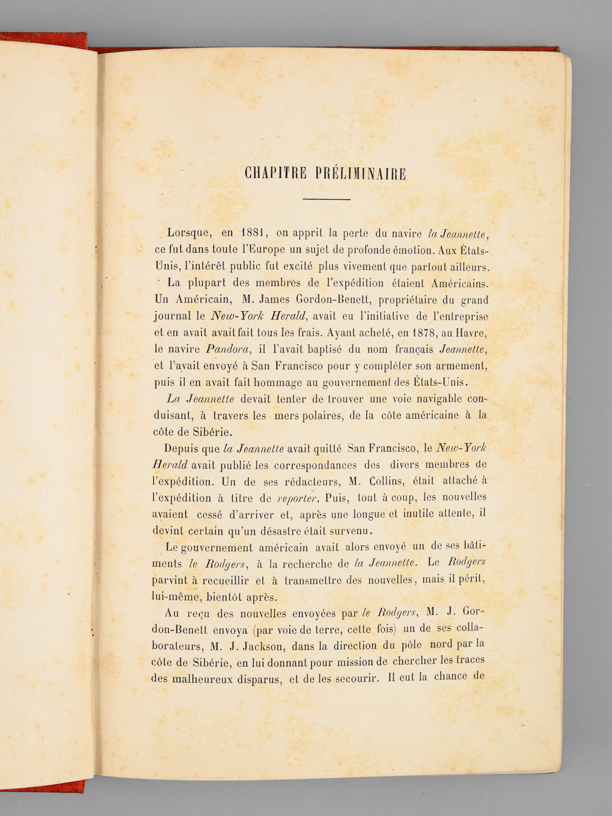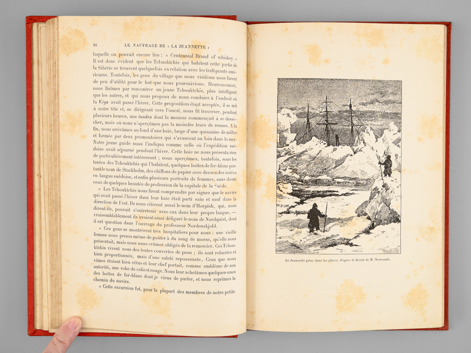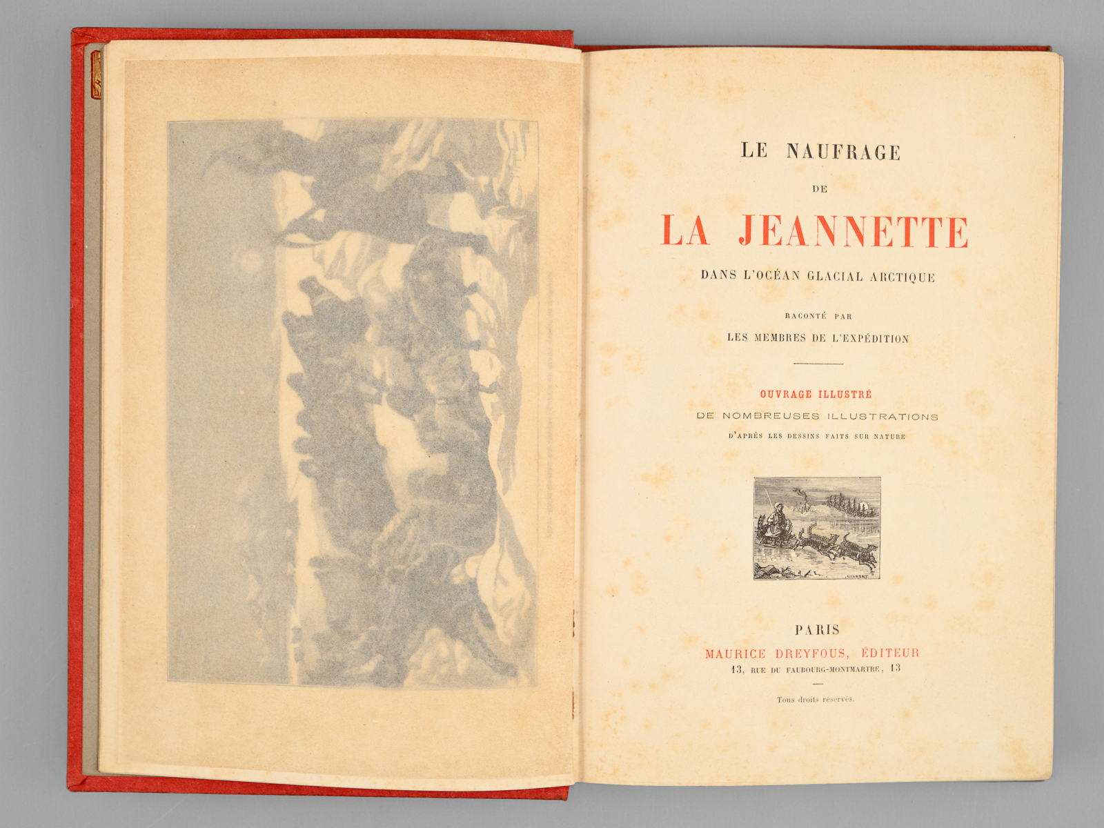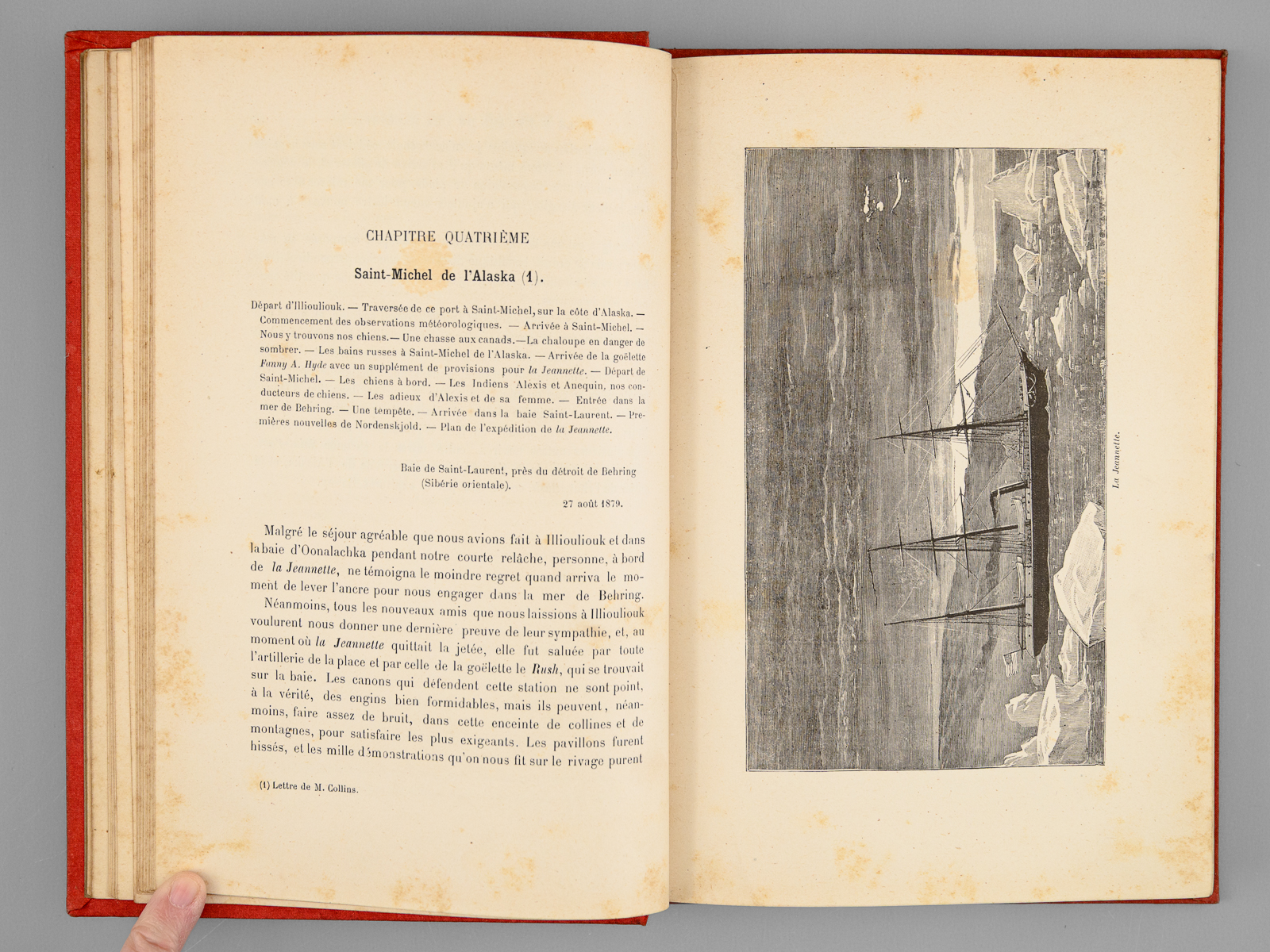 Ouvrage illustré de nombreuses illustrations d'après les dessins faits sur nature, 1 vol. in-8 cartonnage éditeur pleine percaline rouge richement orné, toutes tranches dorées, Maurice Dreyfous, Paris, s.d. [ circa 1890 ], VIII-306 pp. Commentaire : L'expédition de la Jeannette, officiellement dénommée 'US Arctic Expedition' est une expédition polaire américaine commandée par George Washington De Long de 1879 à 1881. Elle visait à rejoindre le Pôle Nord via le détroit de Béring, croyant possible de circuler sur un courant tempéré, le Kuroshio. Piégée par les glaces, la Jeannette dérivera 2 ans, le commandant De Long et De Long et vingt de ses compagnons y trouveront la mort. Bon état (qq. rouss., très bon éat par ailleurs).