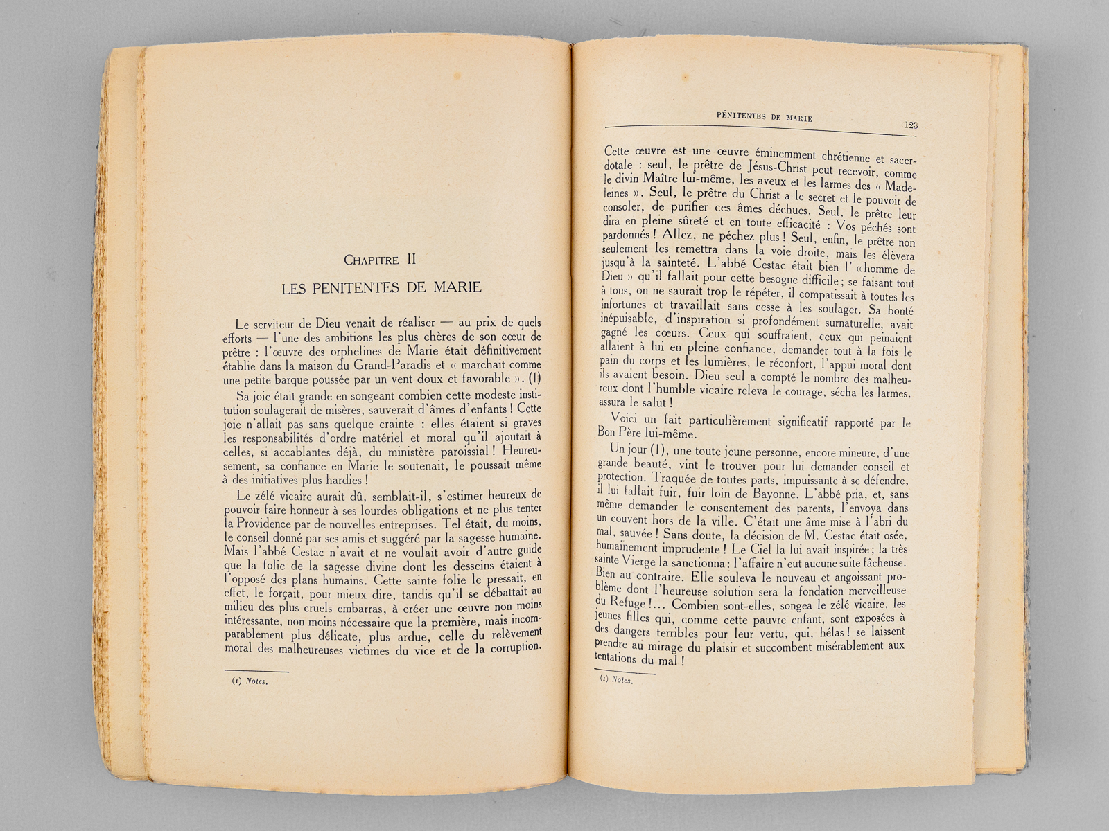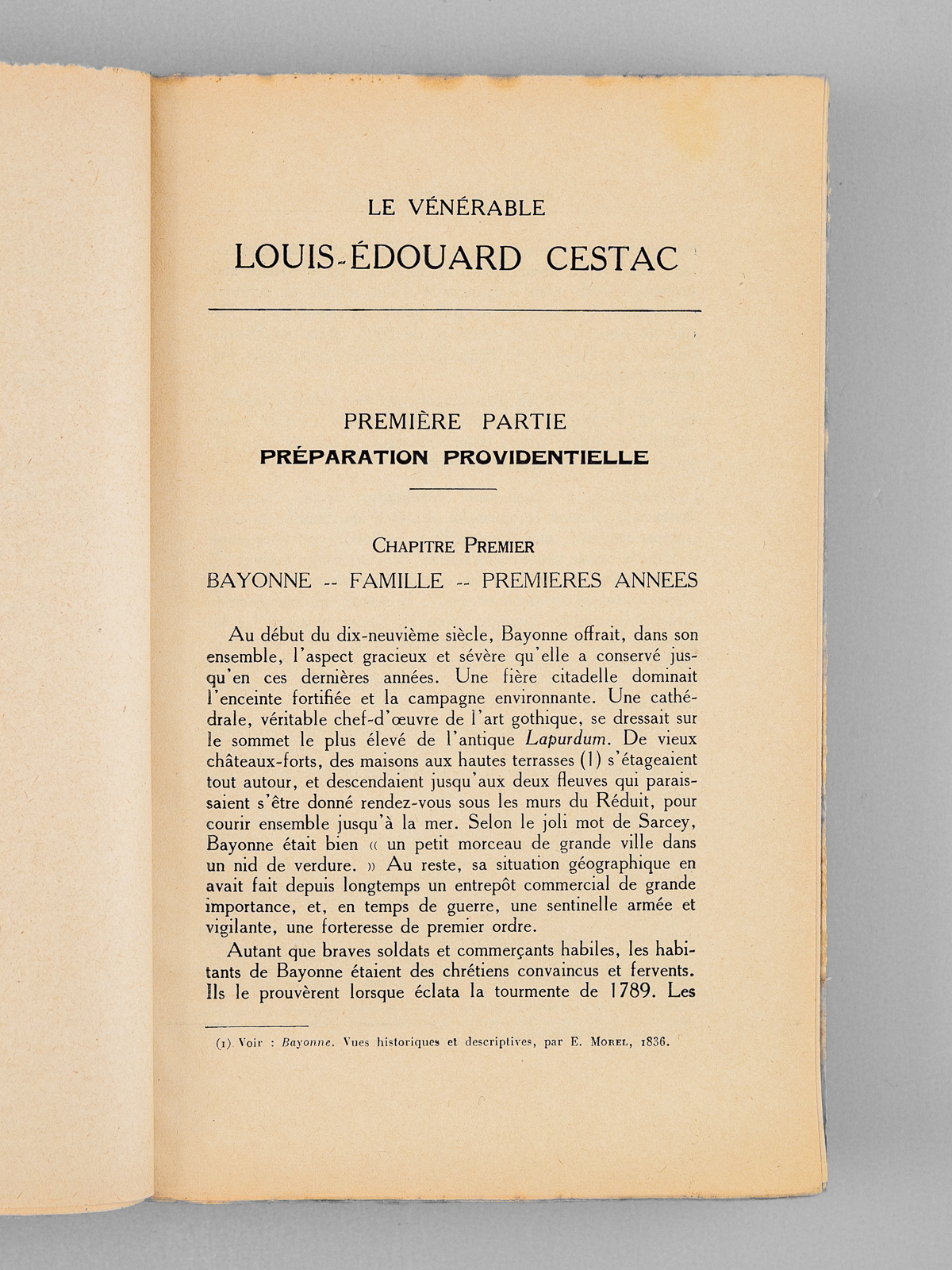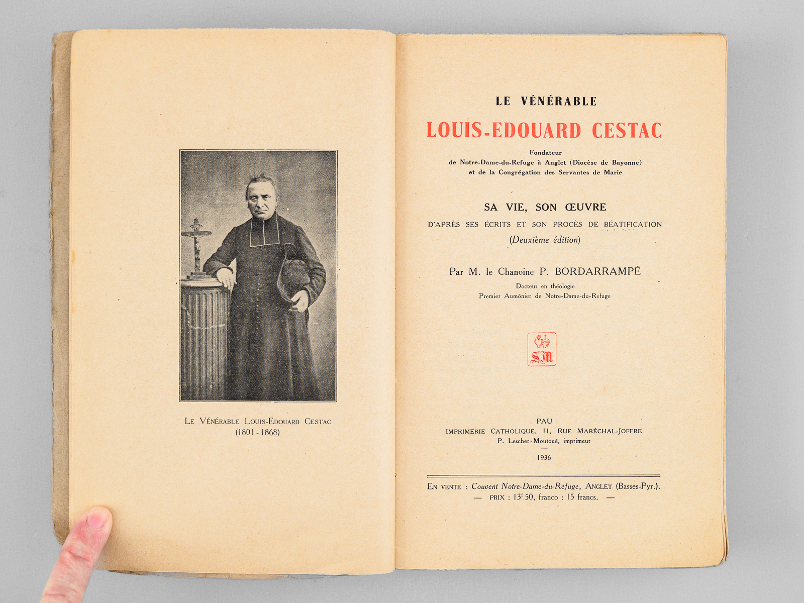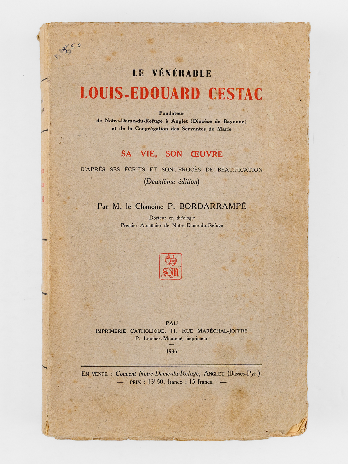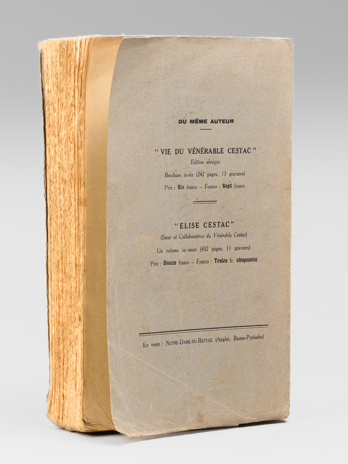 Commentaire : Etat très satisfaisant (couv. frottée, lég. rousseurs, bon état par ailleurs) pour ce livre peu courant. Ouvrage consacré au Bienheureux Louis-Edouard Cestac (1801-1868), prêtre basque qui acheta en 1838 un domaine à Anglet. Il y fondera Notre-Dame-du-Refuge, institution destinée à réinsérer des jeunes femmes voulant quitter le monde de la prostitution. En 1851 y sera fondée une communauté de religieuses contemplatives. Ce site de N.D.-du-Refuge devint également un site pionnier en innovation agronomique, dans un premier temps, pour nourrir les pensionnaires en exploitant au mieux les terres agricoles du domaine.