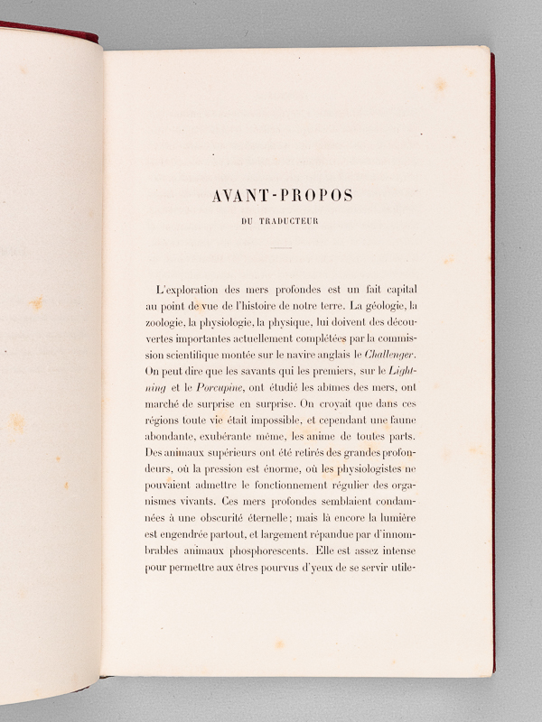Sous la direction scientifique du Dr. Carpenter, de M. J. Gwyn Jeffreys & du Dr. Wyville Thomson, par C. Wyville Thomson, ouvrage traduit avec l'autorisation de l'auteur par le Dr. Lortet, et contenant 94 gravures sur bois et 8 cartes, 1 vol. in-8 reliure demi-chagrin rouge, dos à 4 nerfs orné, toutes tranches dorées, Librairie Hachette et Cie, Paris, 1875, XXXVI-454 pp. avec 8 planches hors texte (7 cartes en couleurs et un diagramme) Commentaire : Bon état (rouss.) pour cet exemplaire bien relié. L'expédition menée de 1868 à 1870 démontra l'abondance de la vie dans les grandes profondeurs.