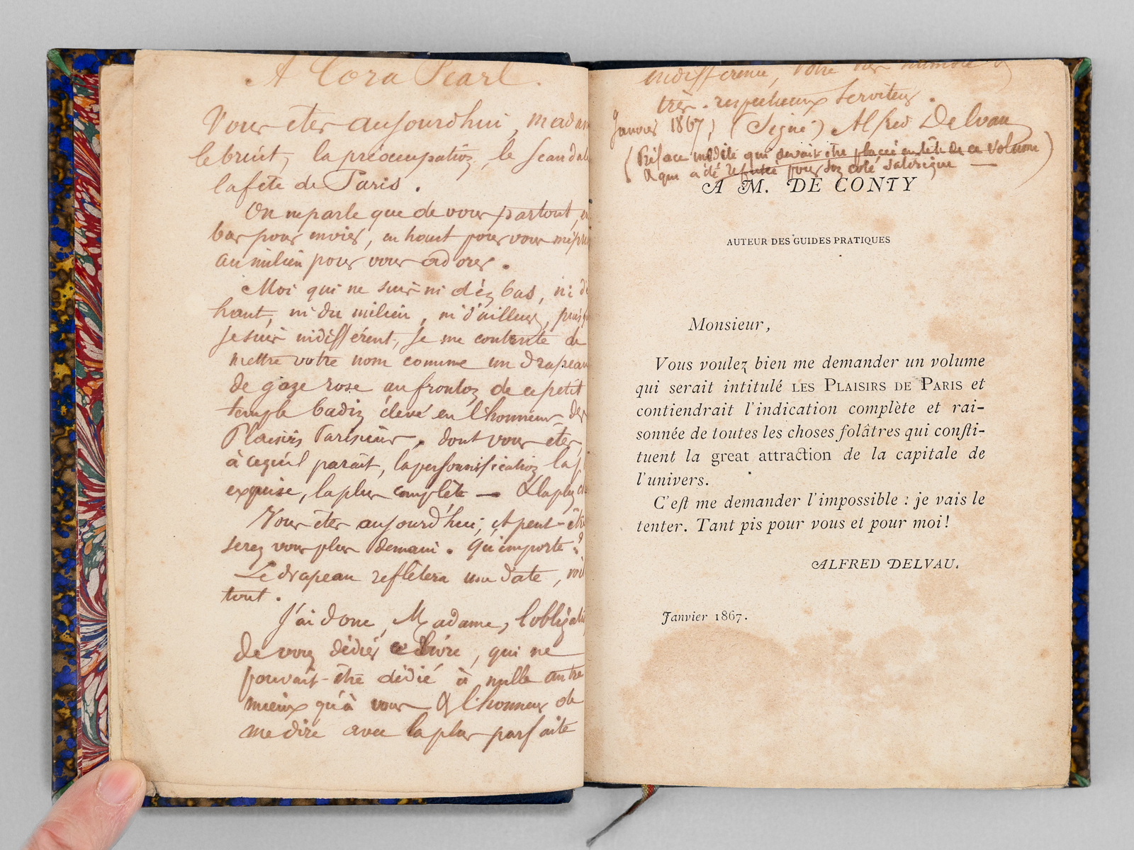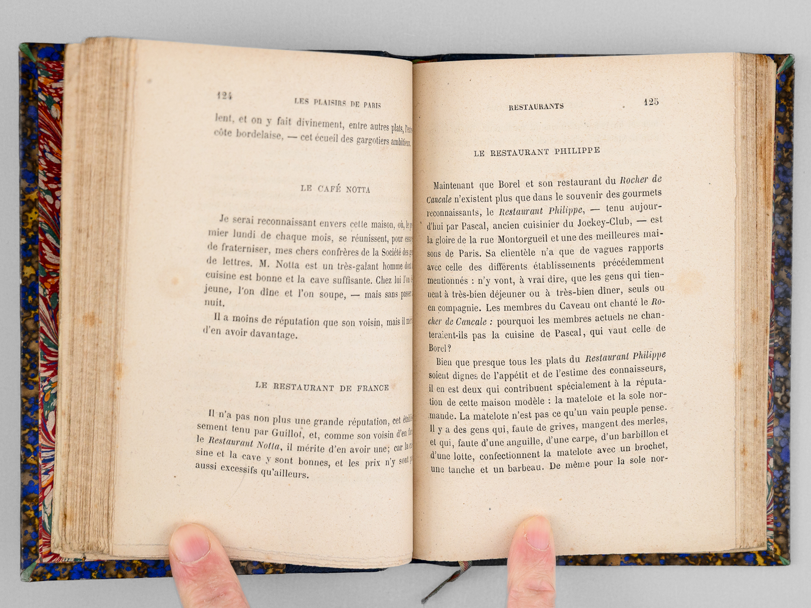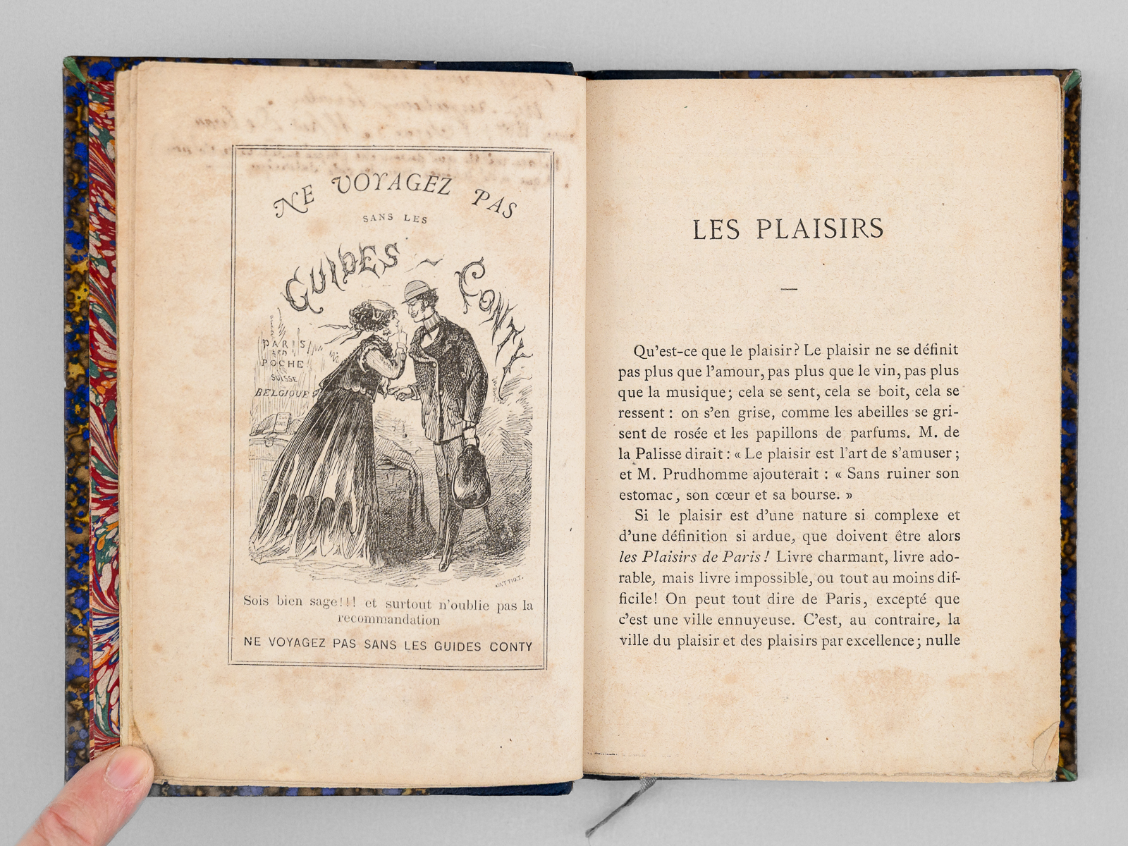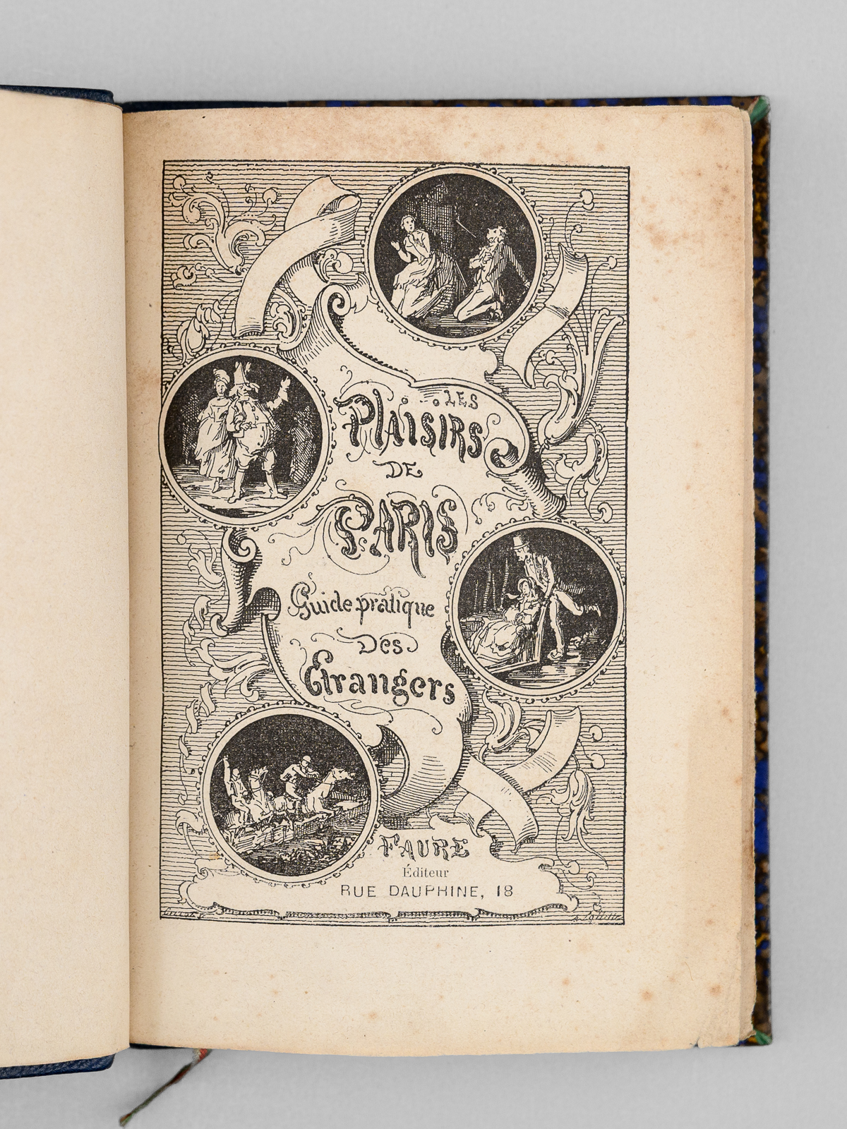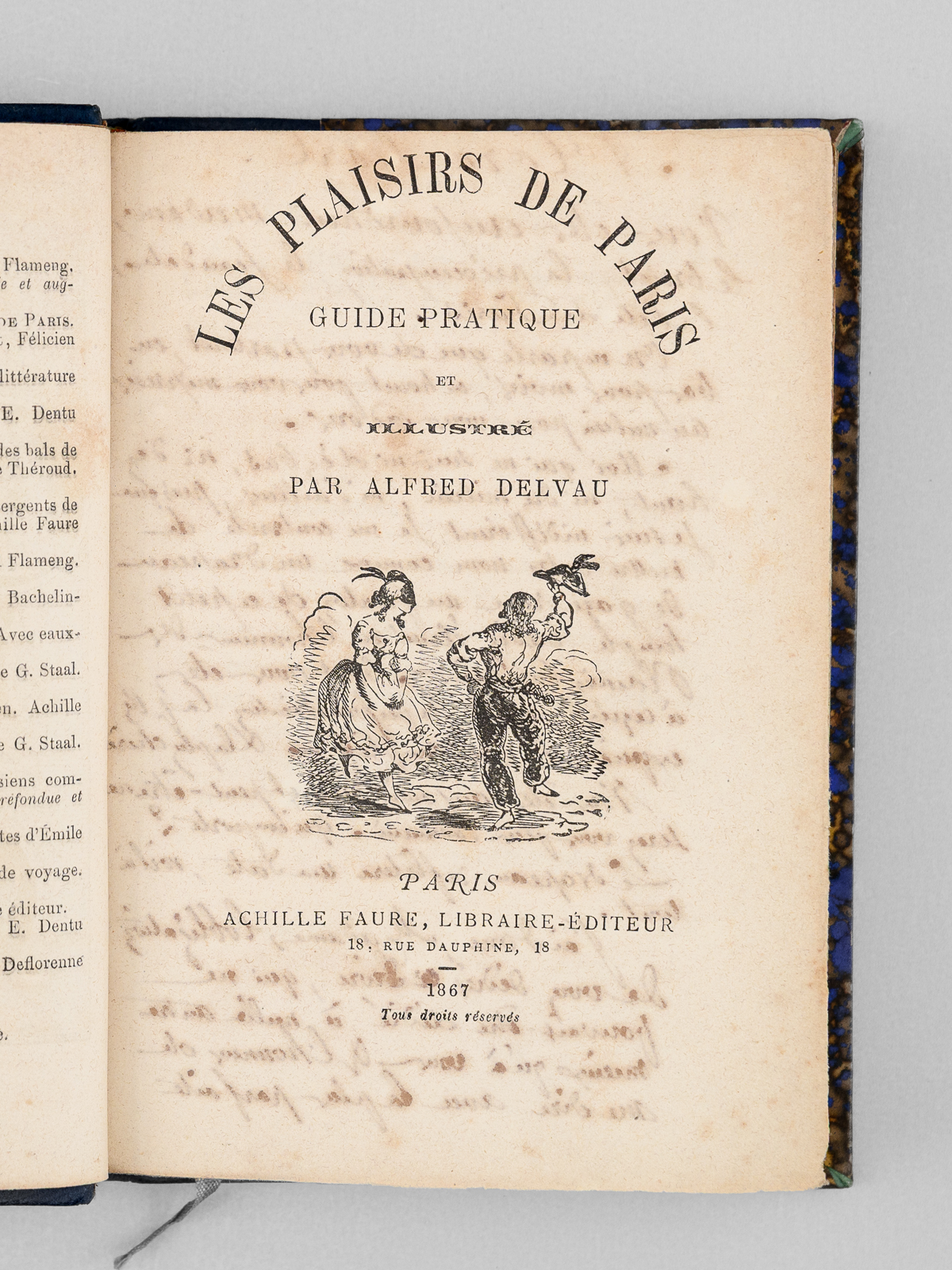 Commentaire : Une main anonyme mais contemporaine de l'ouvrage a reproduit, au verso du feuillet de titre, le texte de la 'préface inédite qui devait être placée en tête de ce volume & qui a été refusée pour son côté satirique' : 'À Cora Pearl, Vous êtes aujourd'hui, madame, le bruit, la préoccupation, le scandale, la fête de Paris. On ne parle que de vous partout, en bas pour envie, en haut pour vous mépriser, au milieu pour vous adorer. Moi qui ne suis ni d'en bas, ni d'en haut, ni du milieu, ni d'ailleurs, puisque je suis indifférent, je me contente de mettre votre nom comme un drapeau de gaze rose au fronton de ce petit temple badin élevé en l'honneur des plaisirs parisiens, dont vous êtes, à ce qu'il paraît, la personnification la plus exquise, la plus complète. - Hélas ! Vous êtes aujourd'hui, et peut-être serez-vous plus demain. Qu'importe ? Le drapeau reflétera une date, voilà tout [ ... ]'. Vicaire, Gastr., 265 ('Nombreuses notes humoristiques sur les cafés et les restaurants de Paris, depuis les cabarets les plus à la mode jusqu'aux tables d'hôtes les plus modestes.') ; Lacombe, 1149 ('Ce volume semble, par son titre, devoir rentrer dans la série des Guides - Cicerones, mais il est mieux placé ici parce qu'il n'est en somme qu'un tableau moral ou immoral, comme on voudra - « de toutes les choses folâtres qui constituent la great attraction de la capitale de l'univers » [ ... ]). Bon état