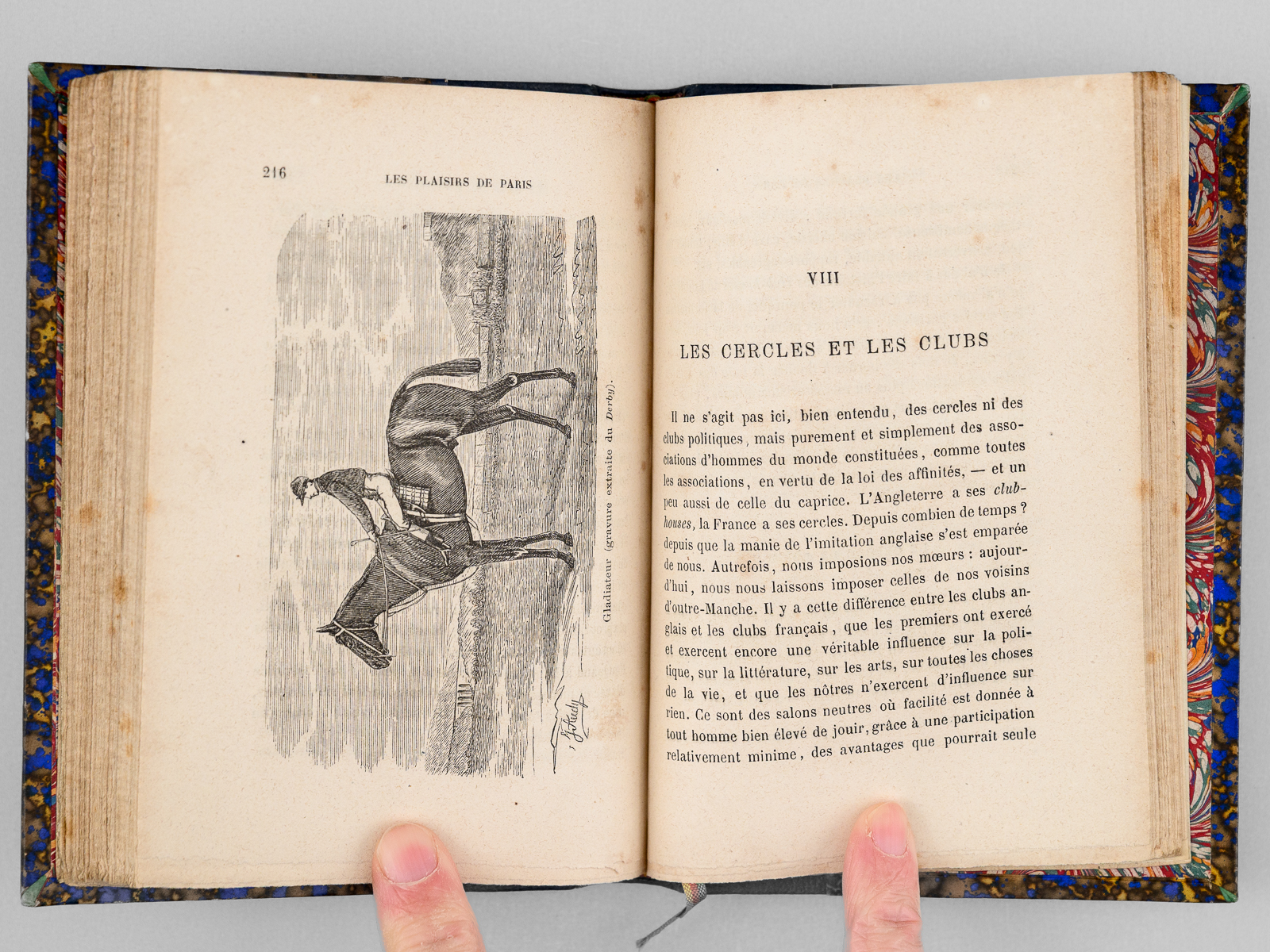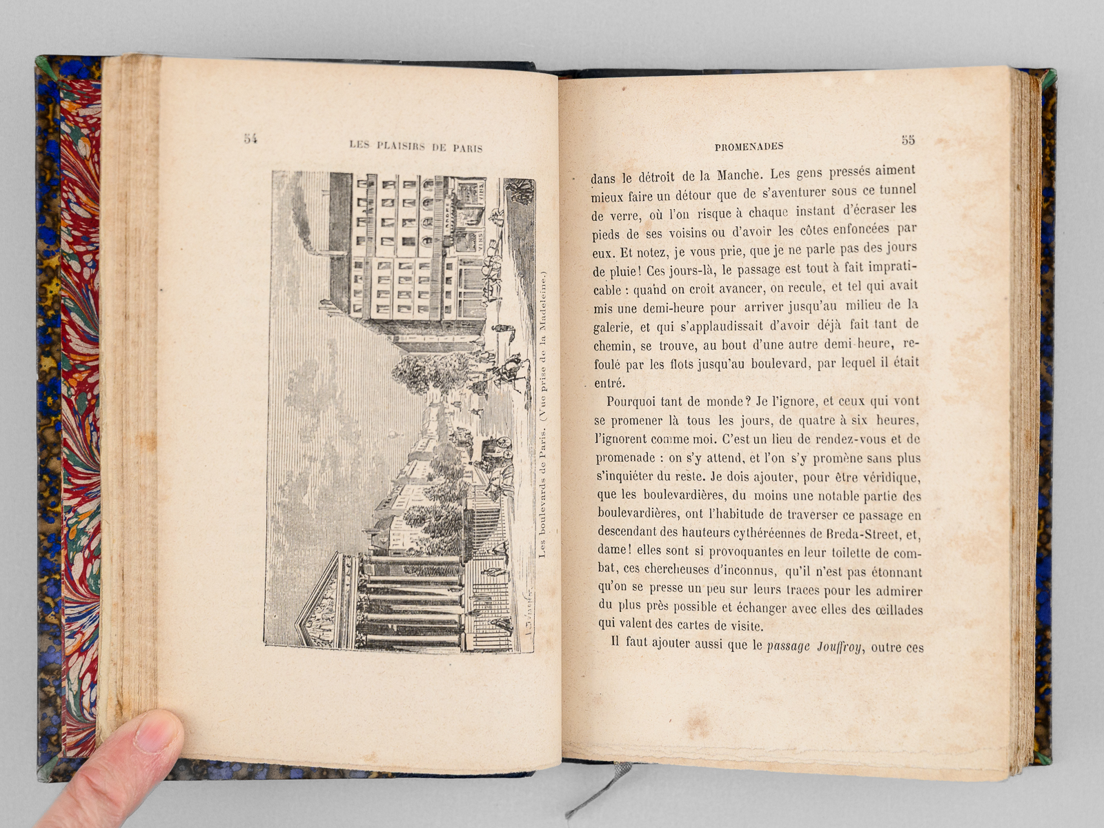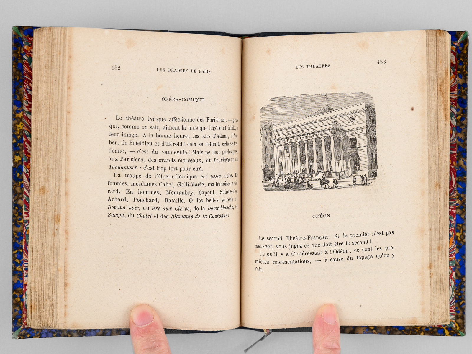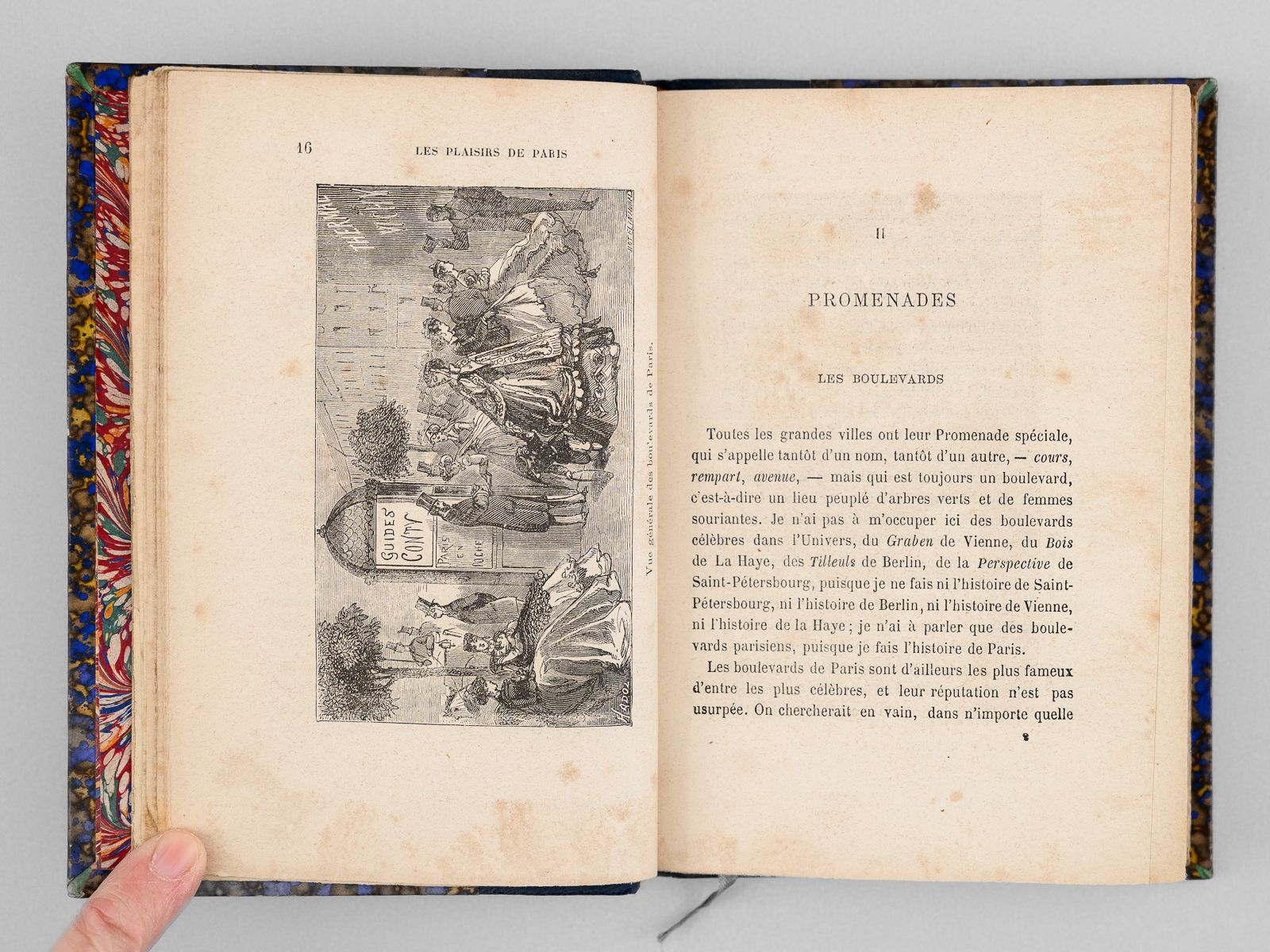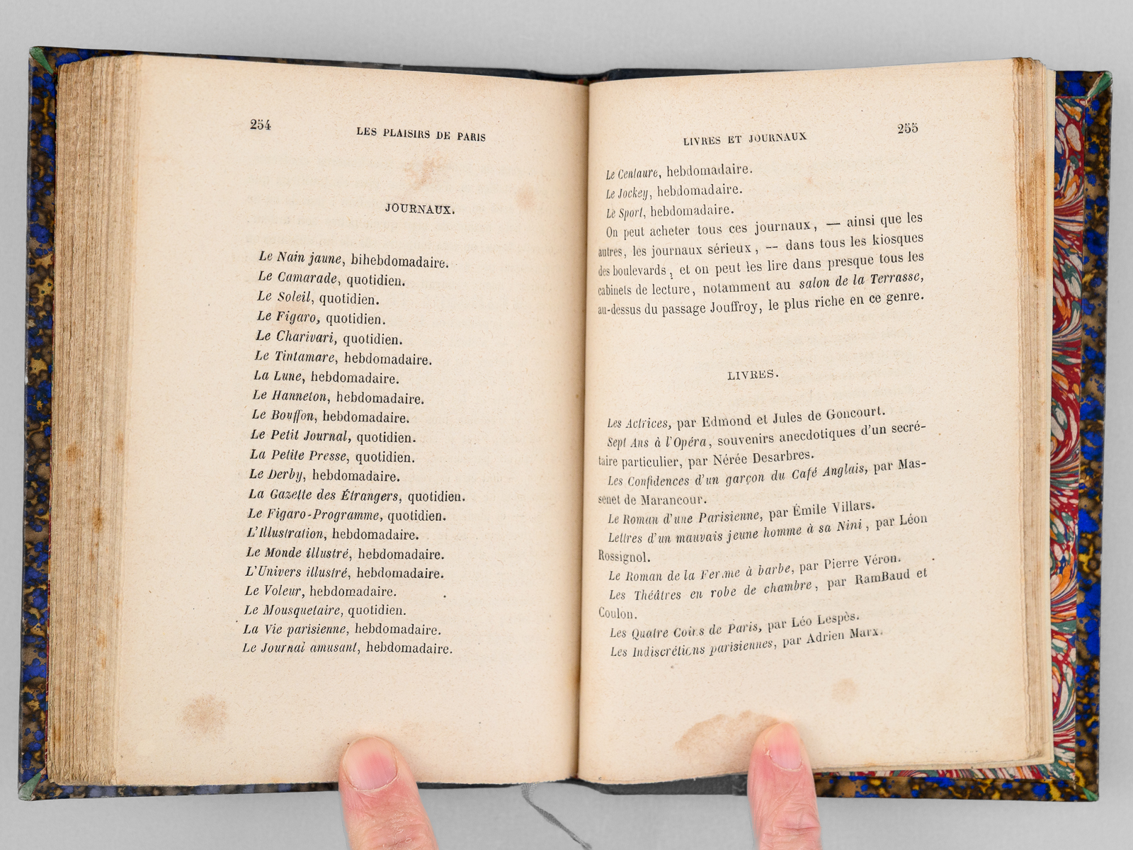 Commentaire : Une main anonyme mais contemporaine de l'ouvrage a reproduit, au verso du feuillet de titre, le texte de la 'préface inédite qui devait être placée en tête de ce volume & qui a été refusée pour son côté satirique' : 'À Cora Pearl, Vous êtes aujourd'hui, madame, le bruit, la préoccupation, le scandale, la fête de Paris. On ne parle que de vous partout, en bas pour envie, en haut pour vous mépriser, au milieu pour vous adorer. Moi qui ne suis ni d'en bas, ni d'en haut, ni du milieu, ni d'ailleurs, puisque je suis indifférent, je me contente de mettre votre nom comme un drapeau de gaze rose au fronton de ce petit temple badin élevé en l'honneur des plaisirs parisiens, dont vous êtes, à ce qu'il paraît, la personnification la plus exquise, la plus complète. - Hélas ! Vous êtes aujourd'hui, et peut-être serez-vous plus demain. Qu'importe ? Le drapeau reflétera une date, voilà tout [ ... ]'. Vicaire, Gastr., 265 ('Nombreuses notes humoristiques sur les cafés et les restaurants de Paris, depuis les cabarets les plus à la mode jusqu'aux tables d'hôtes les plus modestes.') ; Lacombe, 1149 ('Ce volume semble, par son titre, devoir rentrer dans la série des Guides - Cicerones, mais il est mieux placé ici parce qu'il n'est en somme qu'un tableau moral ou immoral, comme on voudra - « de toutes les choses folâtres qui constituent la great attraction de la capitale de l'univers » [ ... ]). Bon état