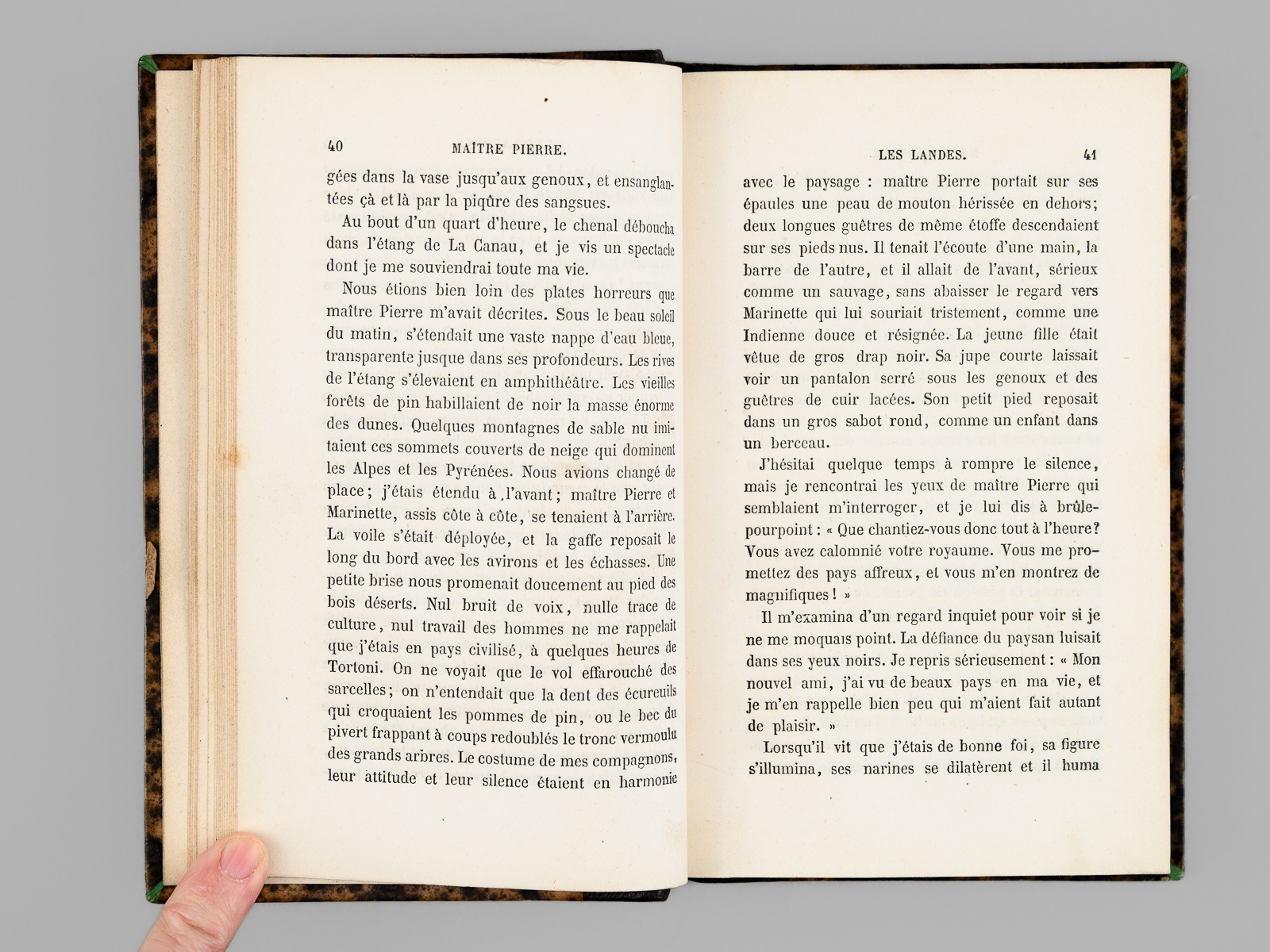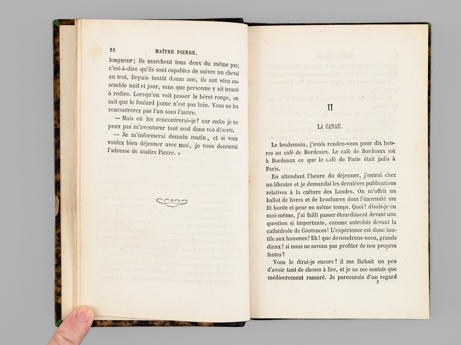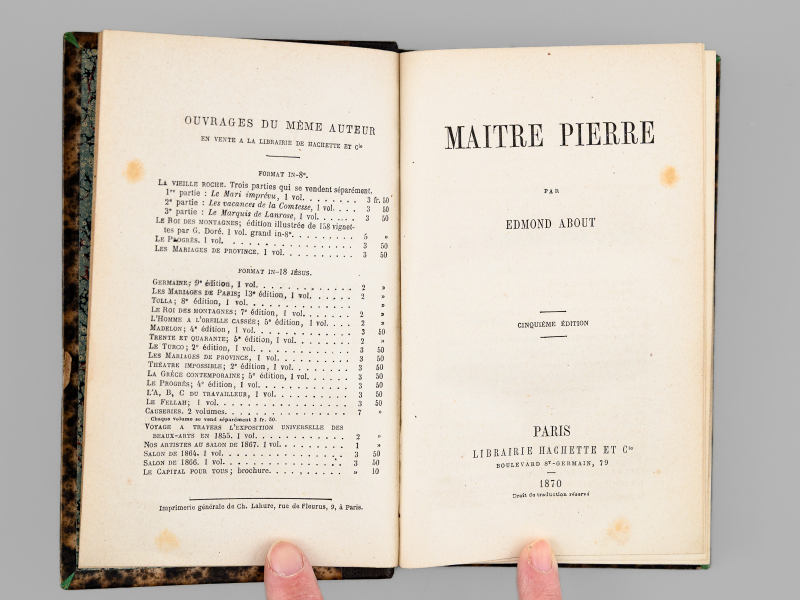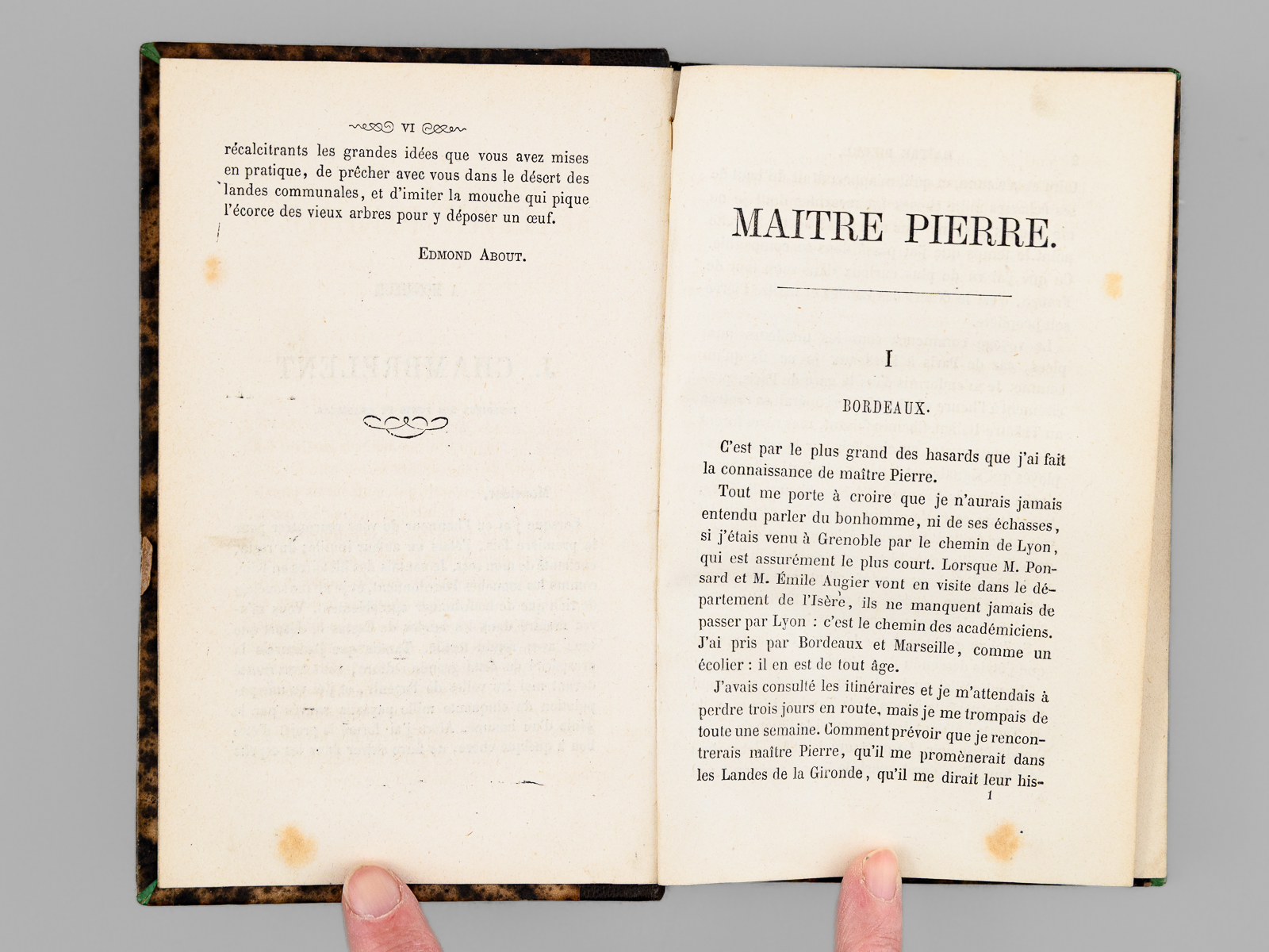 Commentaire : Sous forme romancée, l'ouvrage d'Edmond About est une ballade à Bordeaux et dans les landes girondines, sous la direction du meilleur guide : Maître Pierre. About évoque Bordeaux, Lacanau ('La Canau'), les landes, la pellagre, les dunes, se promène bateau 'sur l'herbe' et termine son voyage sur le bassin d'Arcachon. Bon état