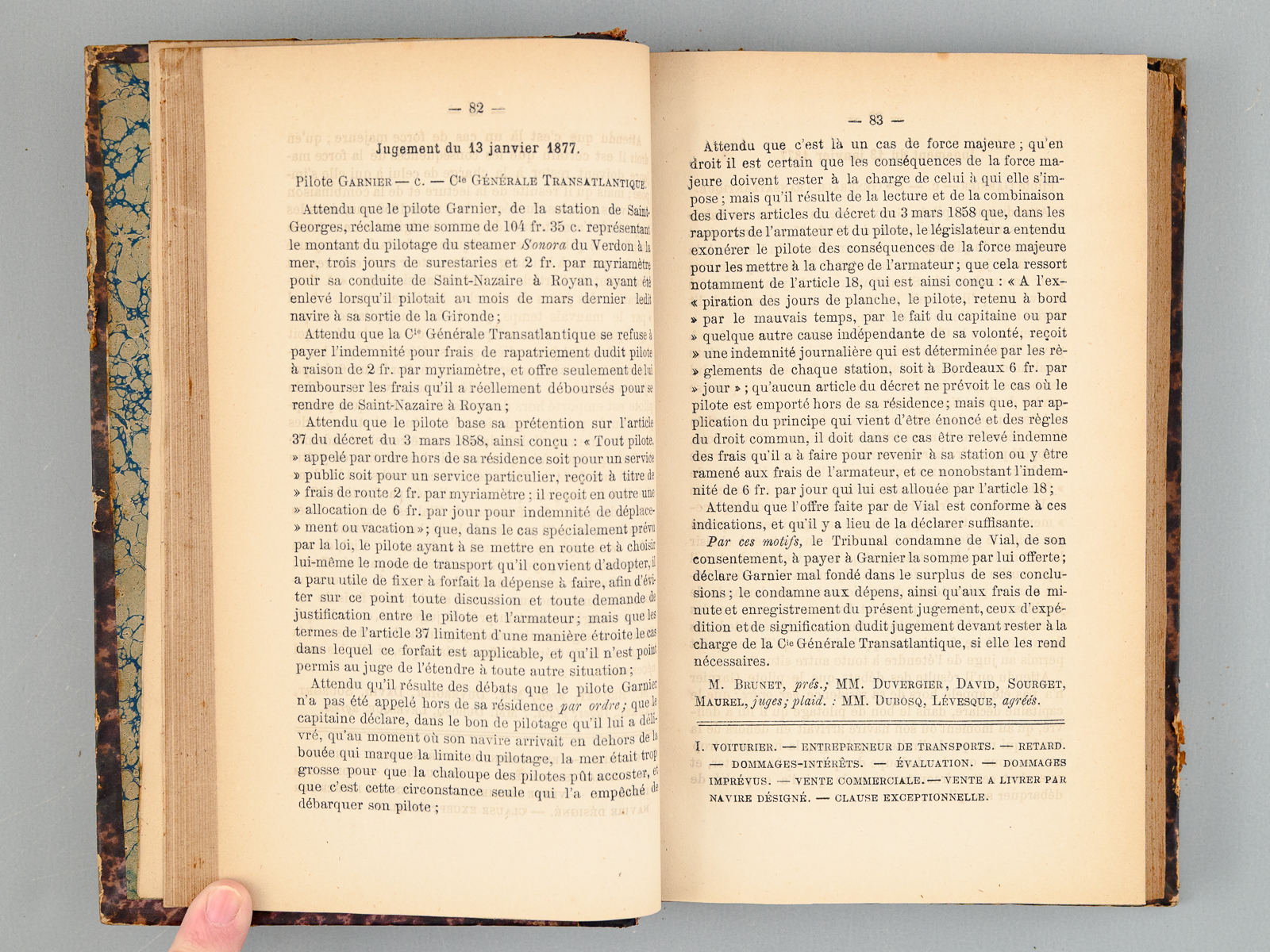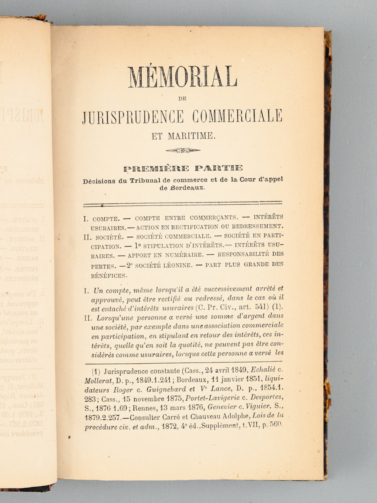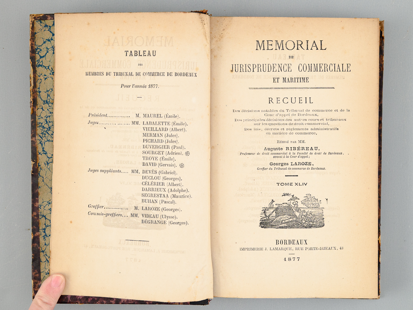 1 vol. in-8 rel. demi-basane brune, dos lisses, Imprimerie J. Lamarque, Bordeaux, 1877, 453-61 pp. Commentaire : Etat très satisfaisant (couv. lég. frottée, bon état par ailleurs). Cet ouvrage contient deux parties : Première patrie, Décisions du Tribunal de Commerce et de la Cour Impériale de Bordeaux ; Deuxième partie, Décisions diverses, Lois, Décrets et Règlements administratifs en matière de commerce. Ces parties sont suivie d'une table des matières.