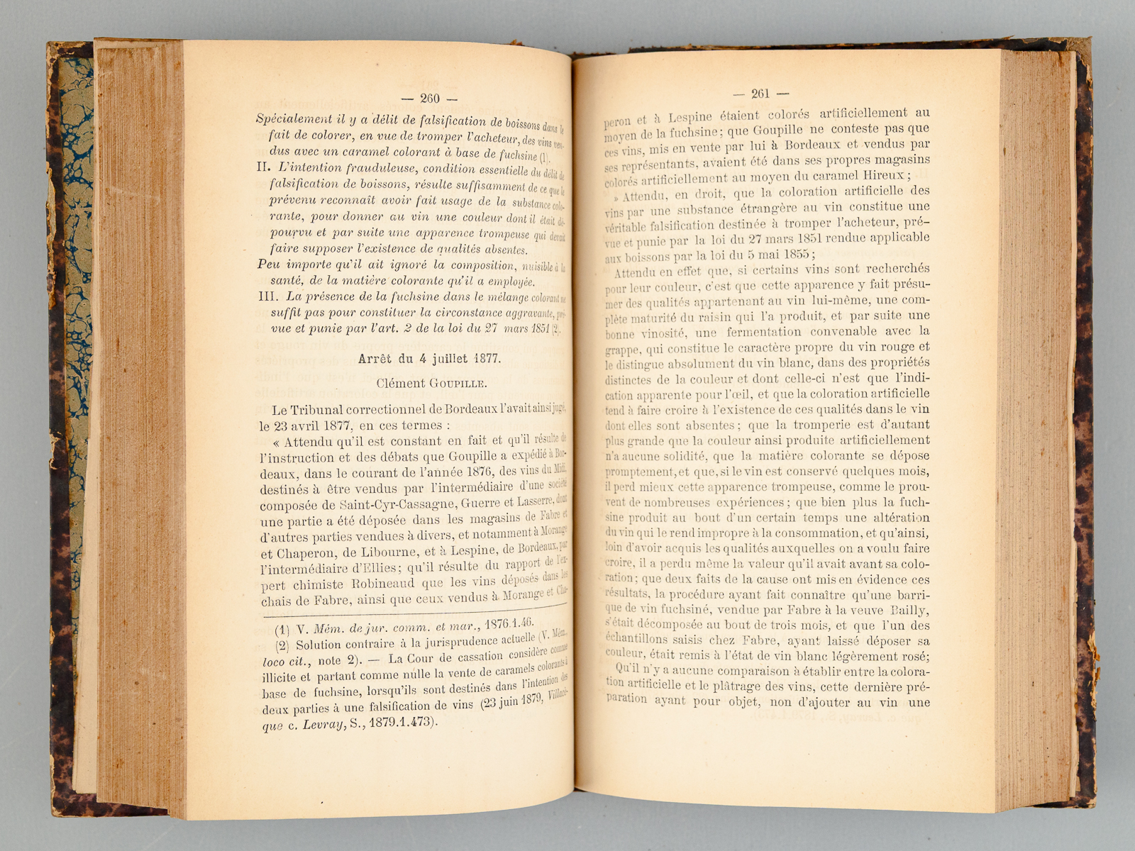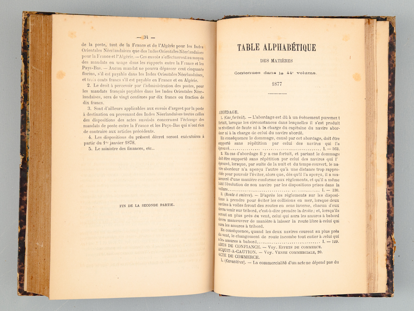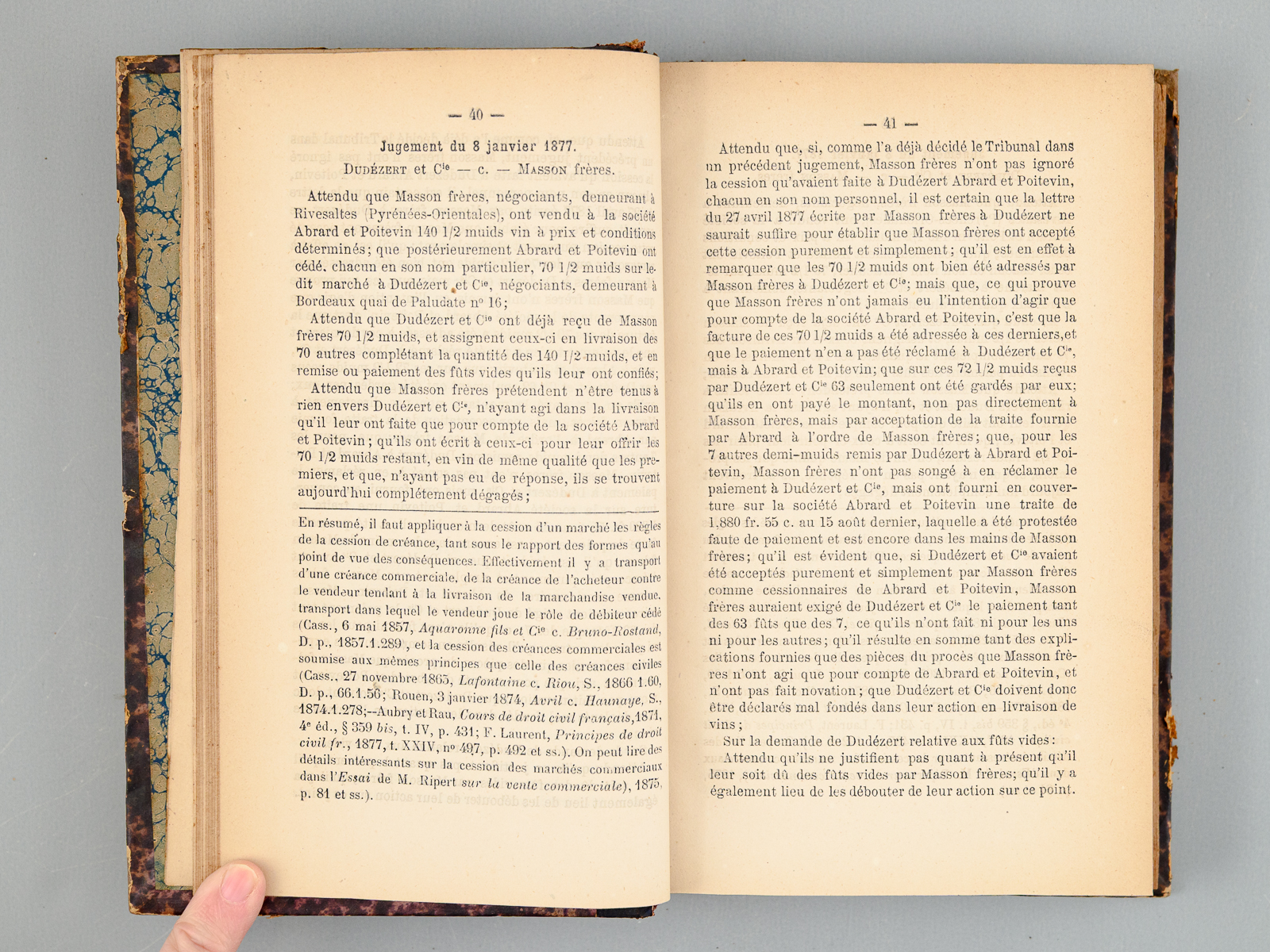 1 vol. in-8 rel. demi-basane brune, dos lisses, Imprimerie J. Lamarque, Bordeaux, 1877, 453-61 pp. Commentaire : Etat très satisfaisant (couv. lég. frottée, bon état par ailleurs). Cet ouvrage contient deux parties : Première patrie, Décisions du Tribunal de Commerce et de la Cour Impériale de Bordeaux ; Deuxième partie, Décisions diverses, Lois, Décrets et Règlements administratifs en matière de commerce. Ces parties sont suivie d'une table des matières.
