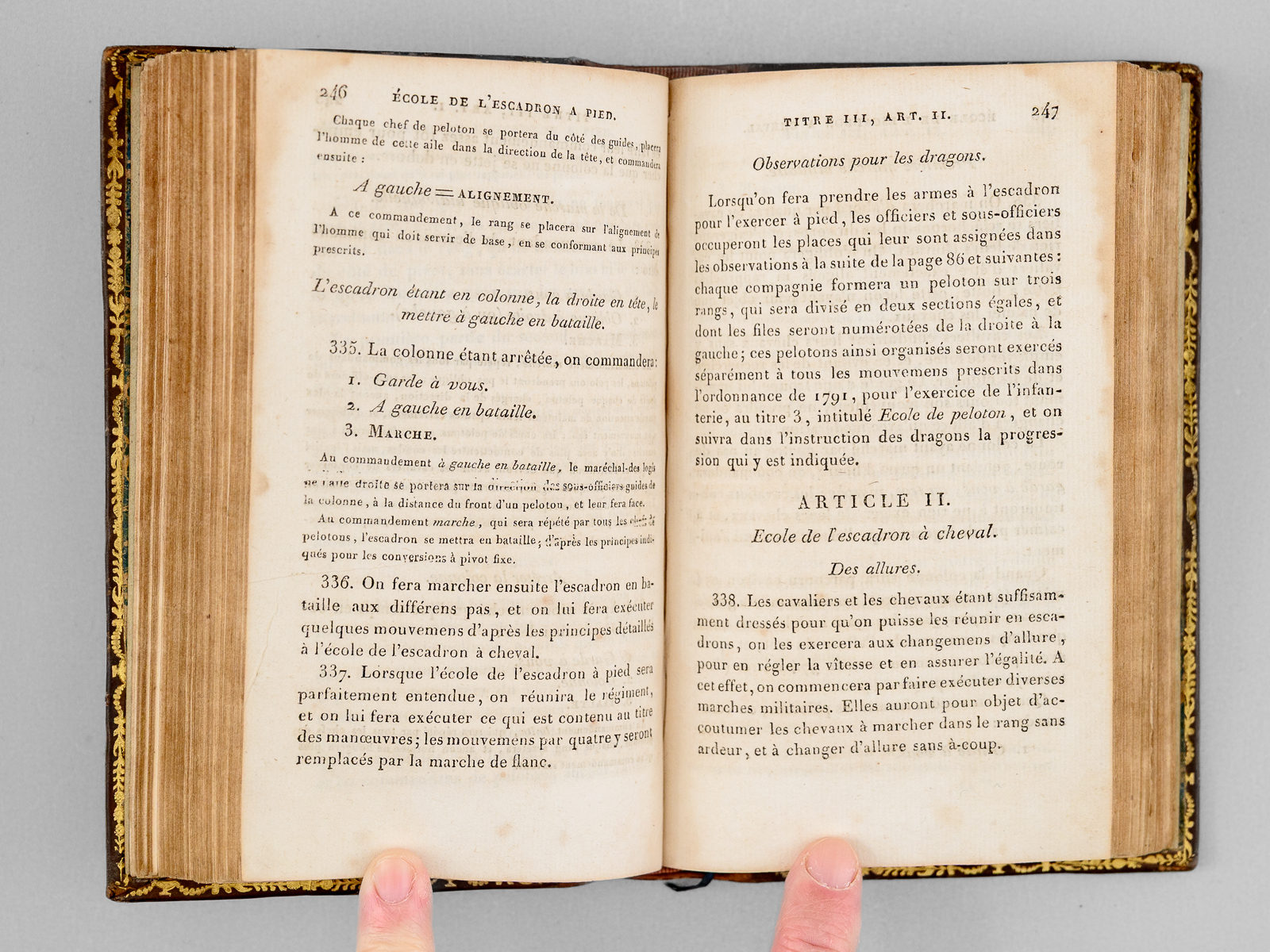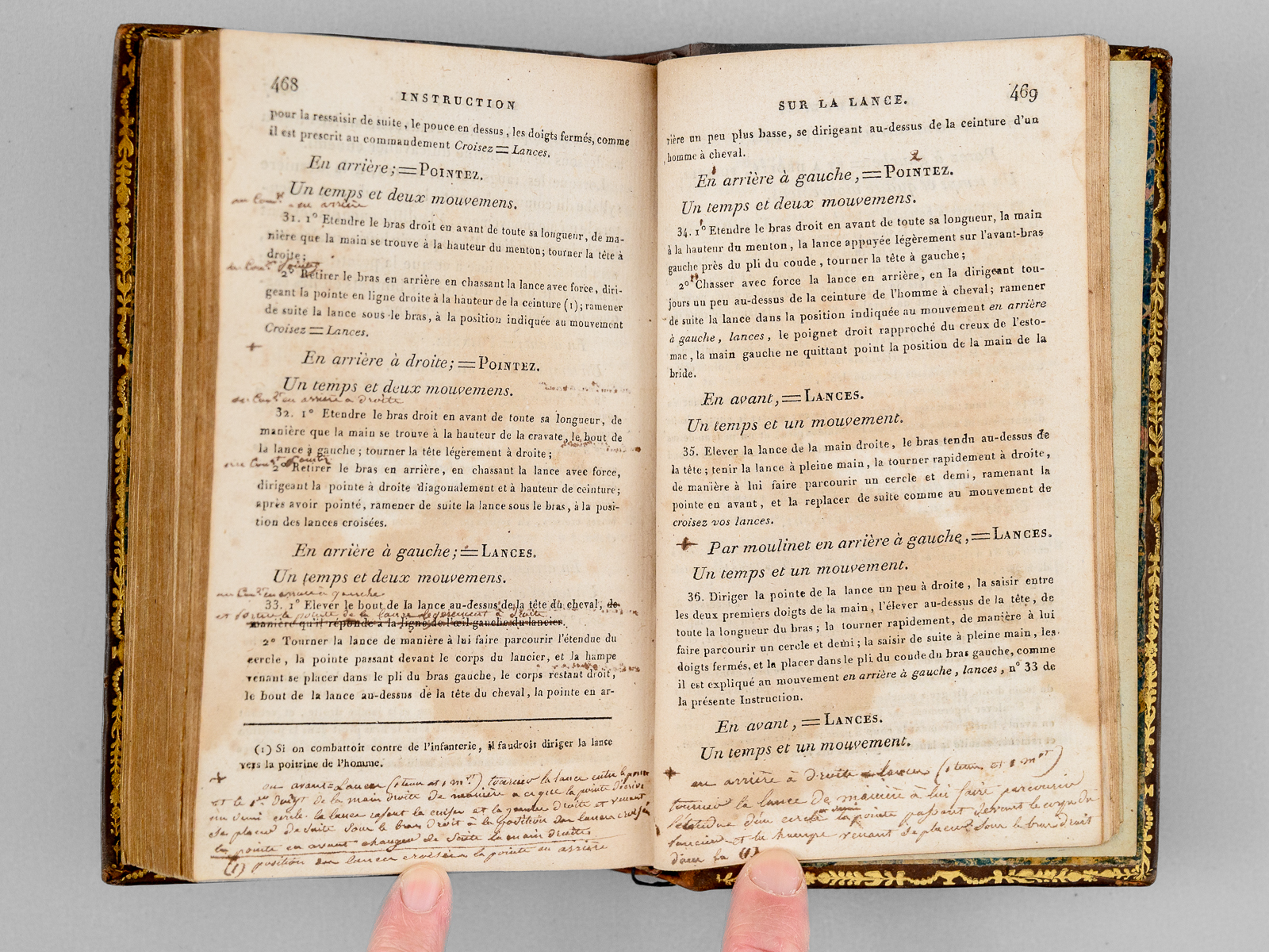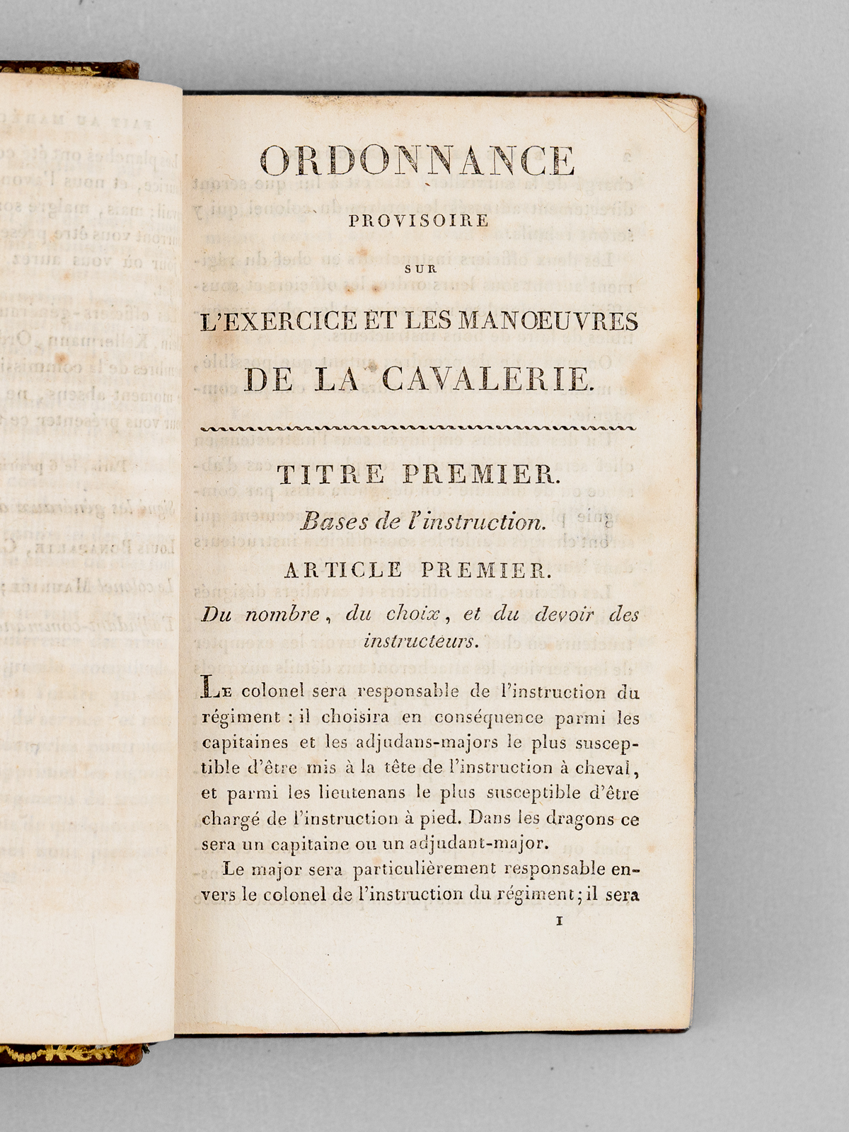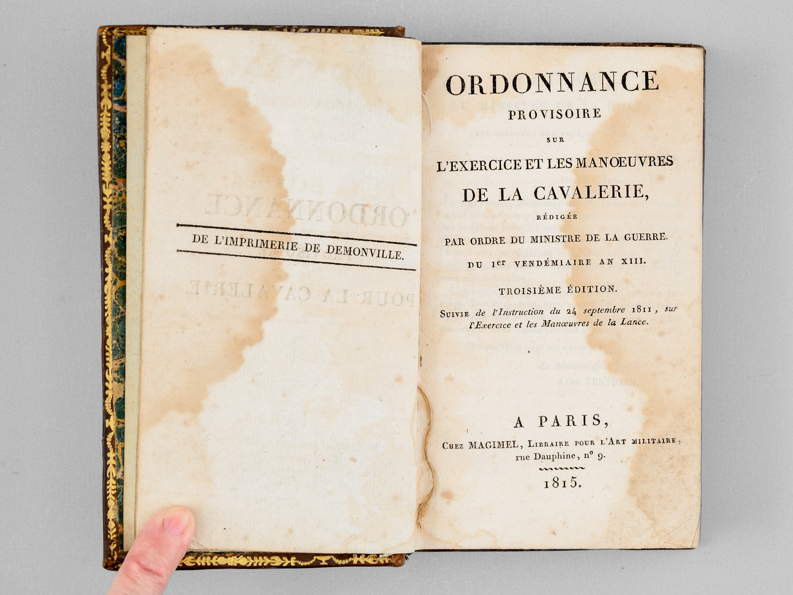 Commentaire : Etat très satisfaisant (couv. lég frottée, traces d'anciennes mouillures sur premières et dernières feuilles, bon état par ailleurs). Exemplaire avec quelques annotations manuscrites d'époque, dans le texte de l'Instruction du 24 septembre 1811. Cette ordonnance est un texte important dans l'histoire de la Cavalerie française, car elle harmonisait des procédures disparates, héritées de l'Ancien Régime. Cette ordonnance fixait précisément, en particulier, la formation des cavaliers, les évolutions d'escadron et la hiérarchies des ordres (signaux de trompettes, commandements vocaux). Une édition parue l'année de Waterloo, complétée de l'Instruction sur la Lance de 1811. 1811 est année l'année de création des régiments de lanciers par Napoléon.