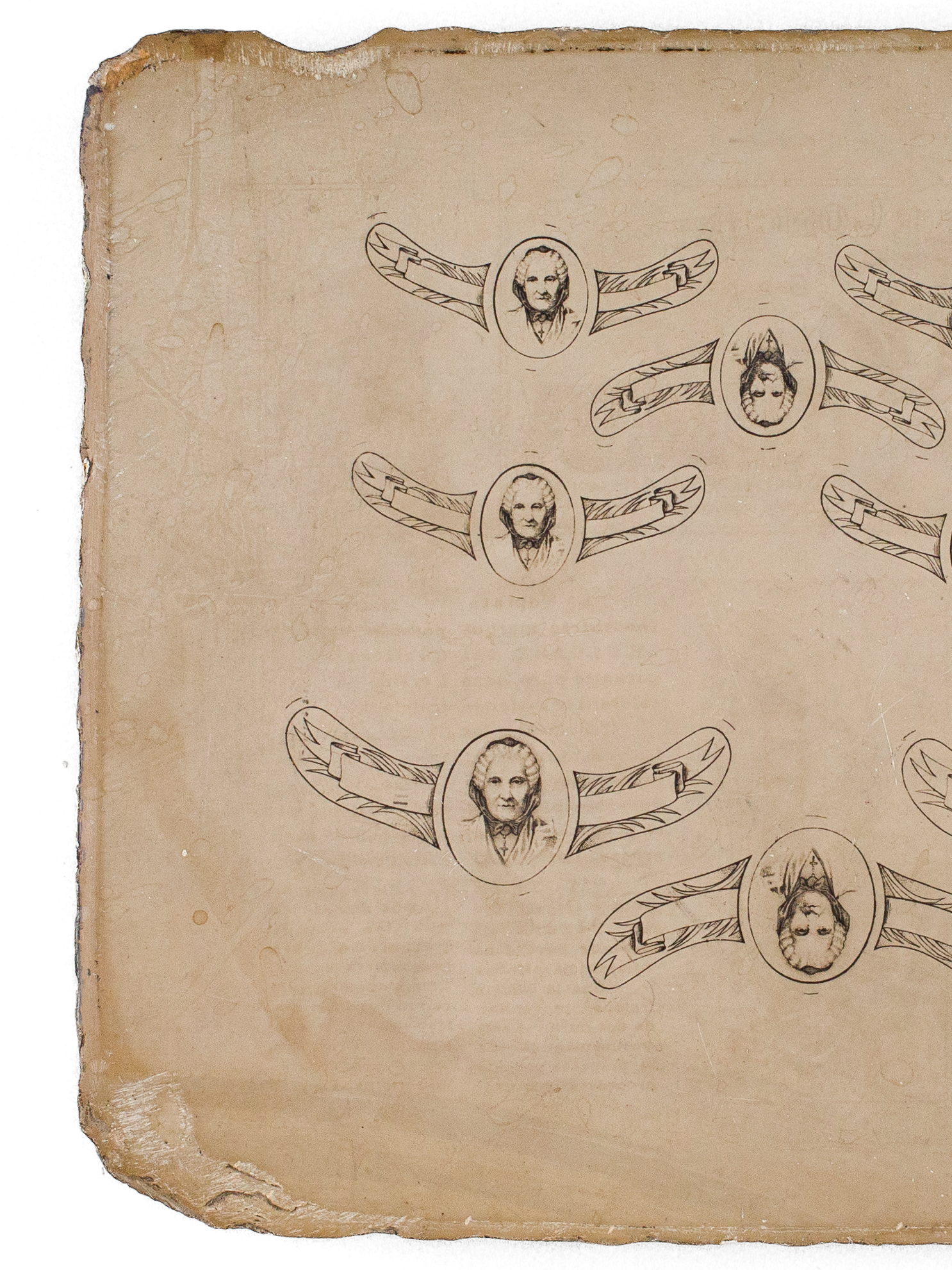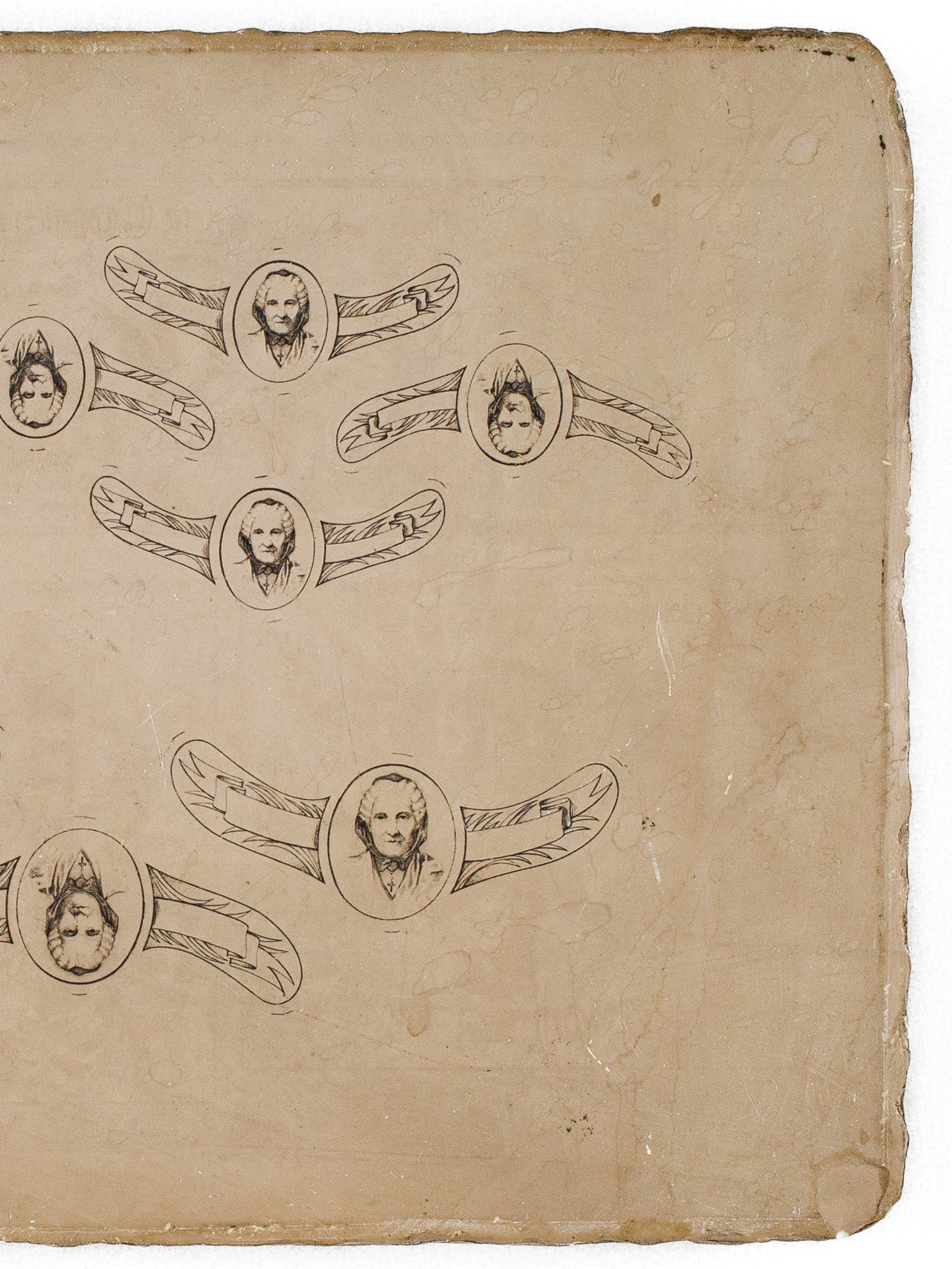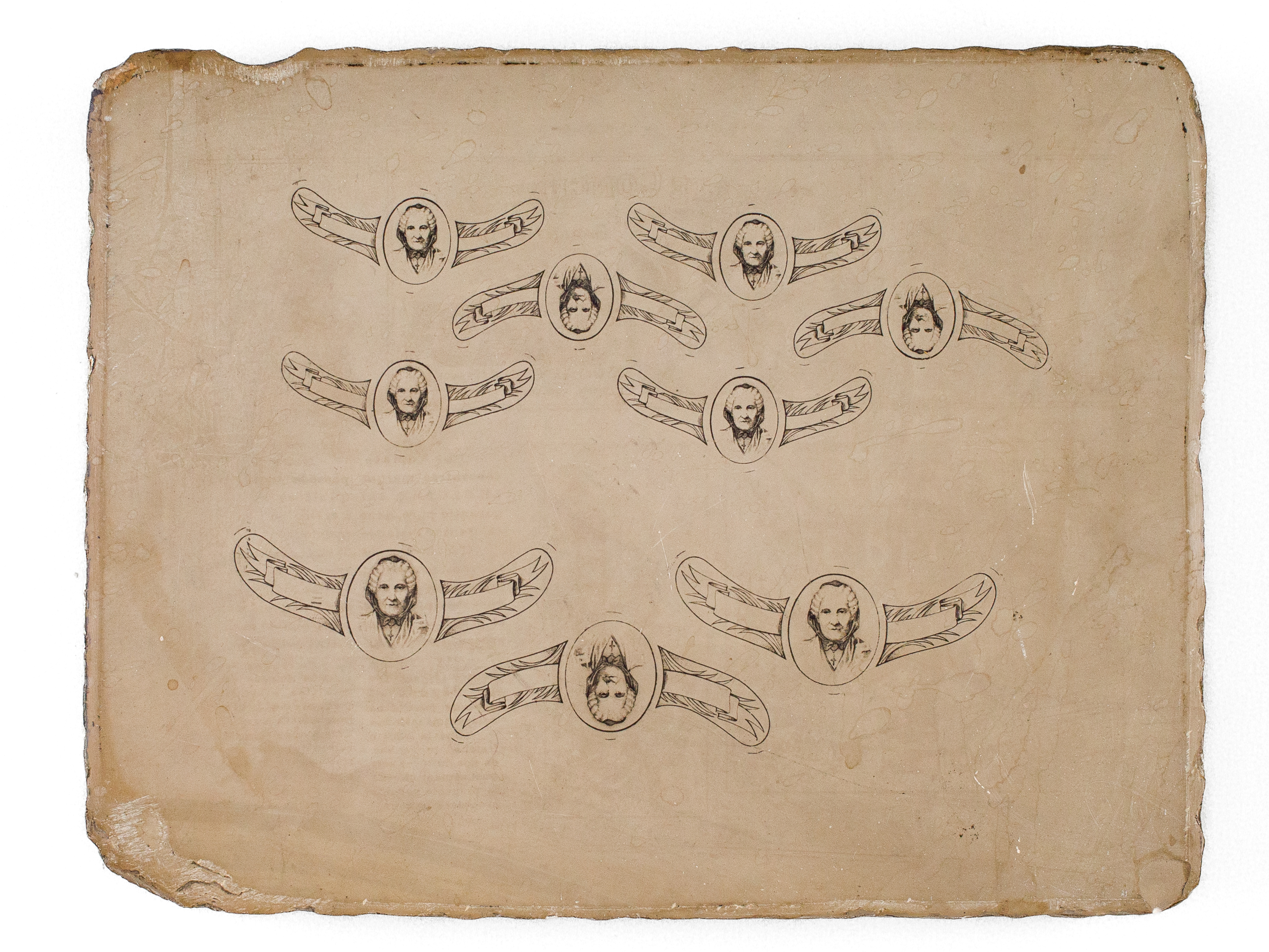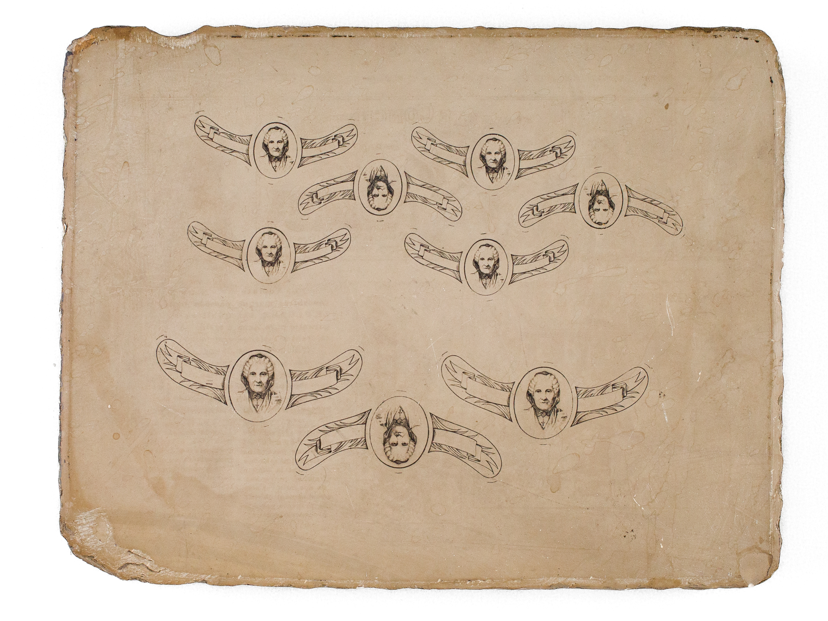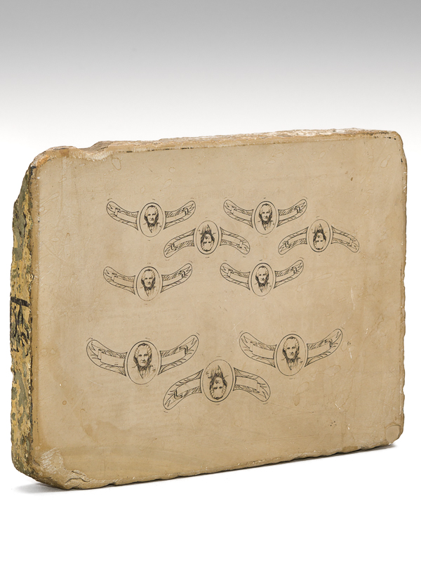 une pierre lithographique format 24,3 x 18,5 x 3 cm, pour impression d'étiquettes de col de la marque 'Marie Brizard', à savoir 6 étiquettes format 5,5 cm et 3 étiquettes format 7 cm, avec le portrait de Marie Brizard, l'espace réservé au texte demeurant vierge Commentaire : Remarquable document que cette pierre lithographique ayant servi à l'impression des fameuses étiquettes à l'effigie de 'Marie Brizard', la célèbre créatrice bordelaise de la liqueur d'anisette dont l'entreprise prospérera jusqu'à nos jours.