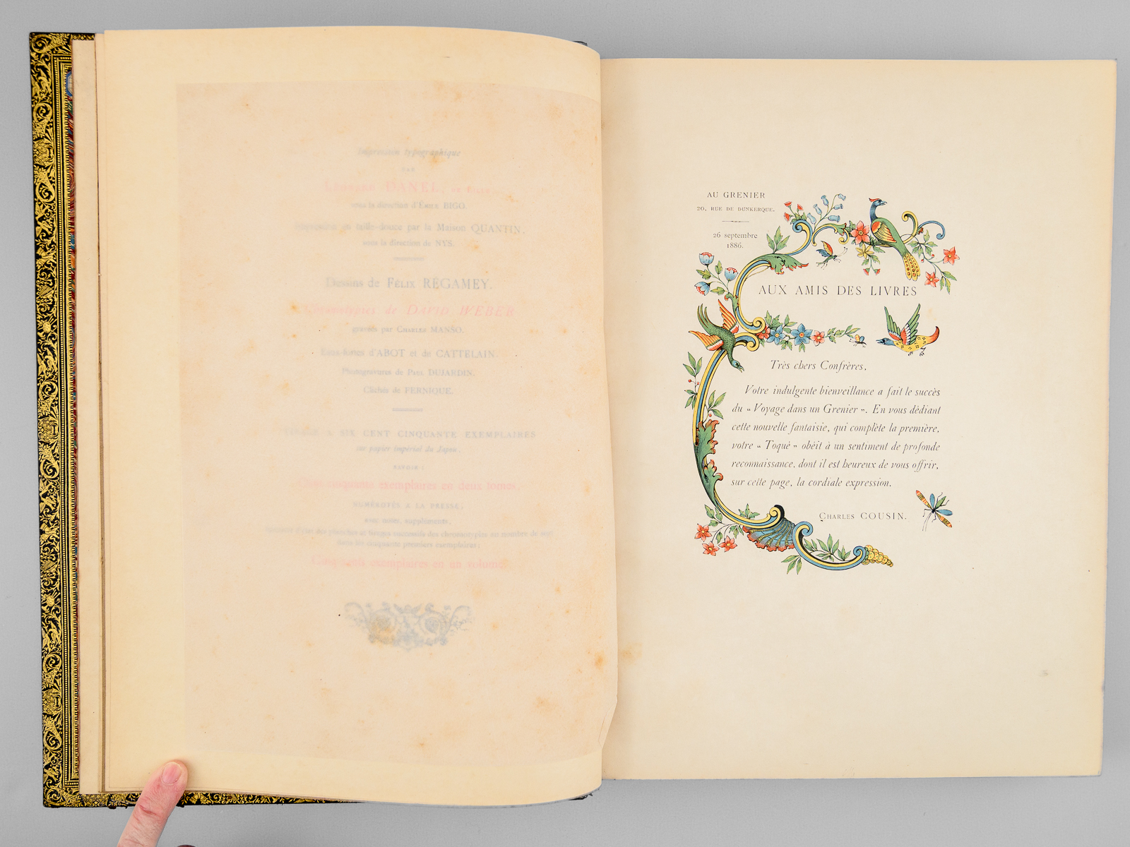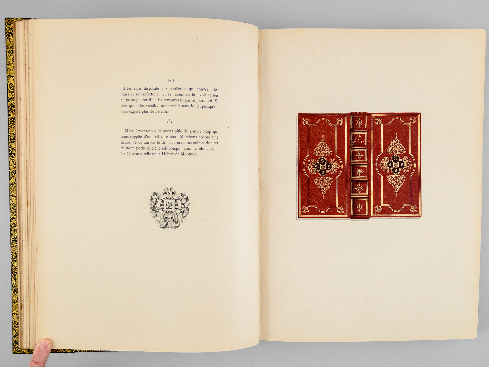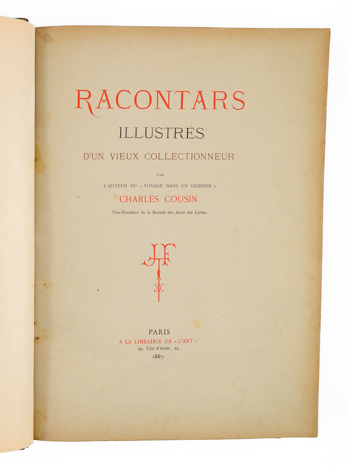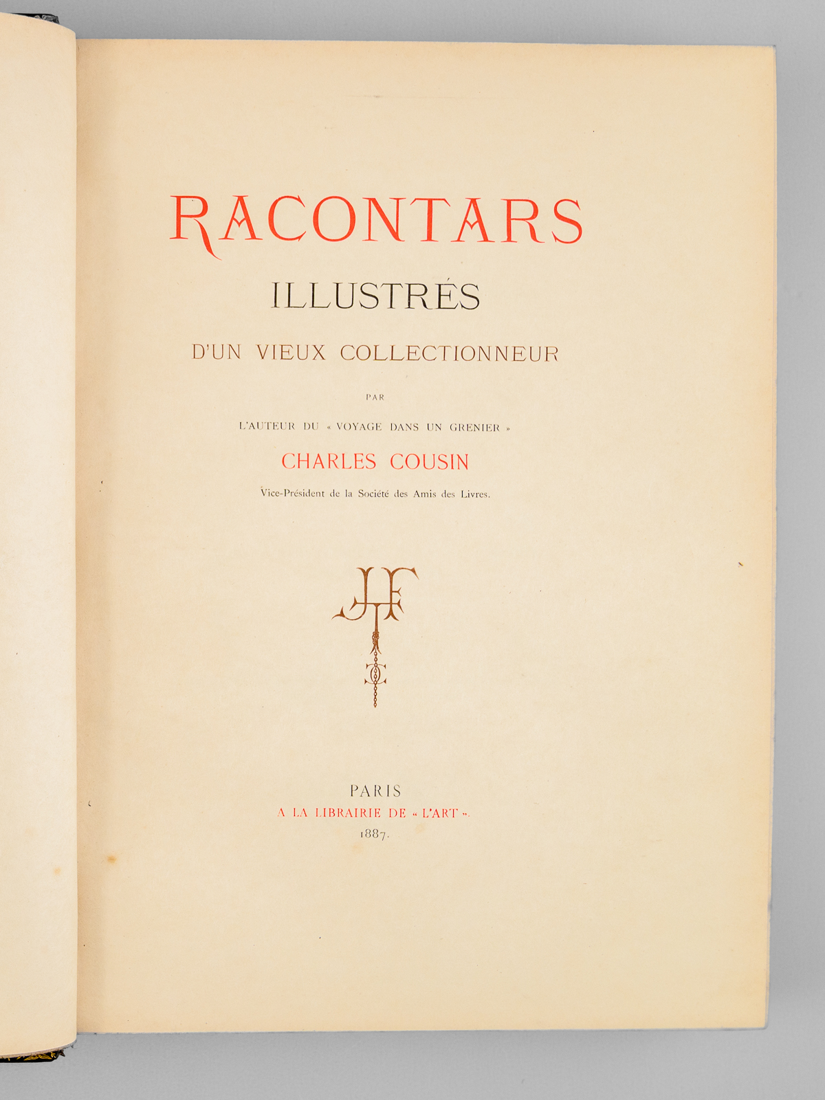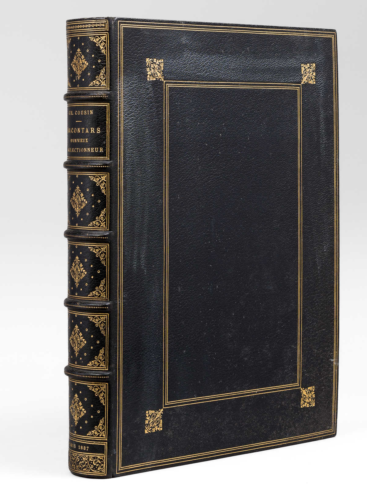 Par l'auteur du « Voyage dans un grenier », Vice-Président de la Société des Amis des Livres, un des 500 exemplaires en un volume sur papier impérial du Japon (après 150 exemplaires en 2 volumes numérotés) ; 1 vol. grand in-4 reliure plein maroquin bleu, dos à 5 nerfs dorés richement orné, plats orné à la Du Seuil, double filet doré en coupes, chasses richement ornée, reliure signée de Thierry, Succr. de Petit-Simier, À la Librairie de « L'Art », Paris, 1887, XVI-335 pp. Commentaire : Bibliophile, Charles Cousin (1822-1894) fut grand-maître du Grand Orient de France en 1883. Un chapitre entier est consacré à ses frères maçons, et la franc-maçonnerie évoquée à diverses reprises dans l'ouvrage. Bon état pour cet exemplaire établi dans une très belle reliure de Thierry (ex-libris gravé Louis Boutemy, reliure très lég. frottée, reste d'odeur de tabac).