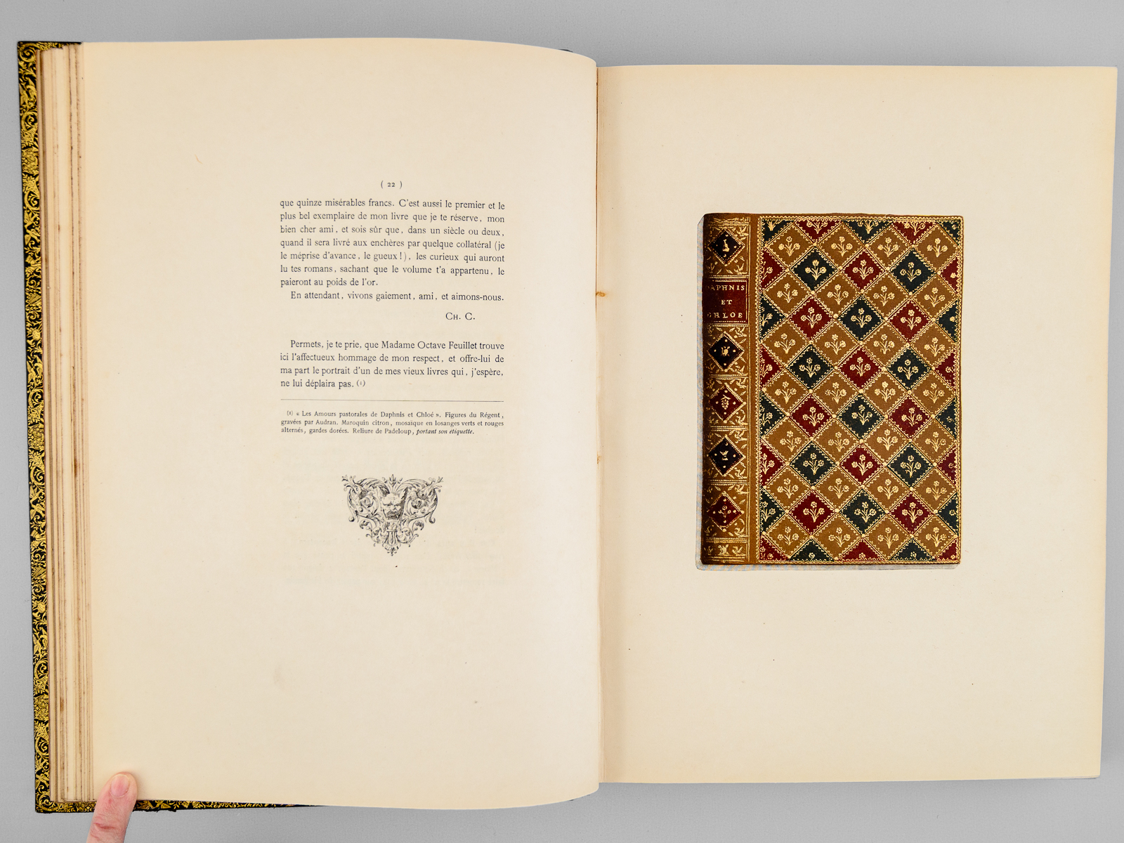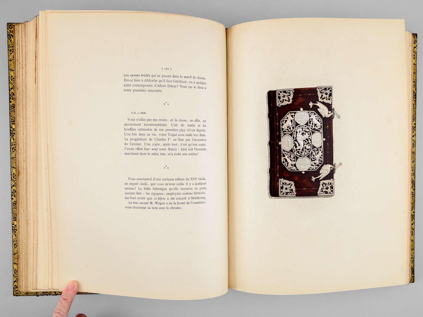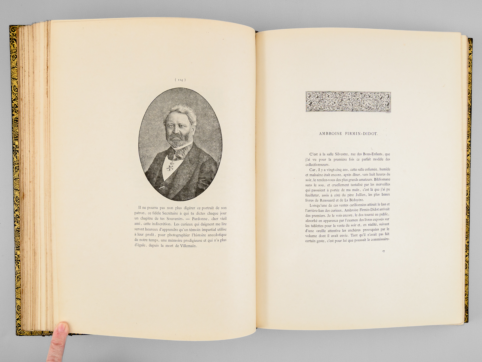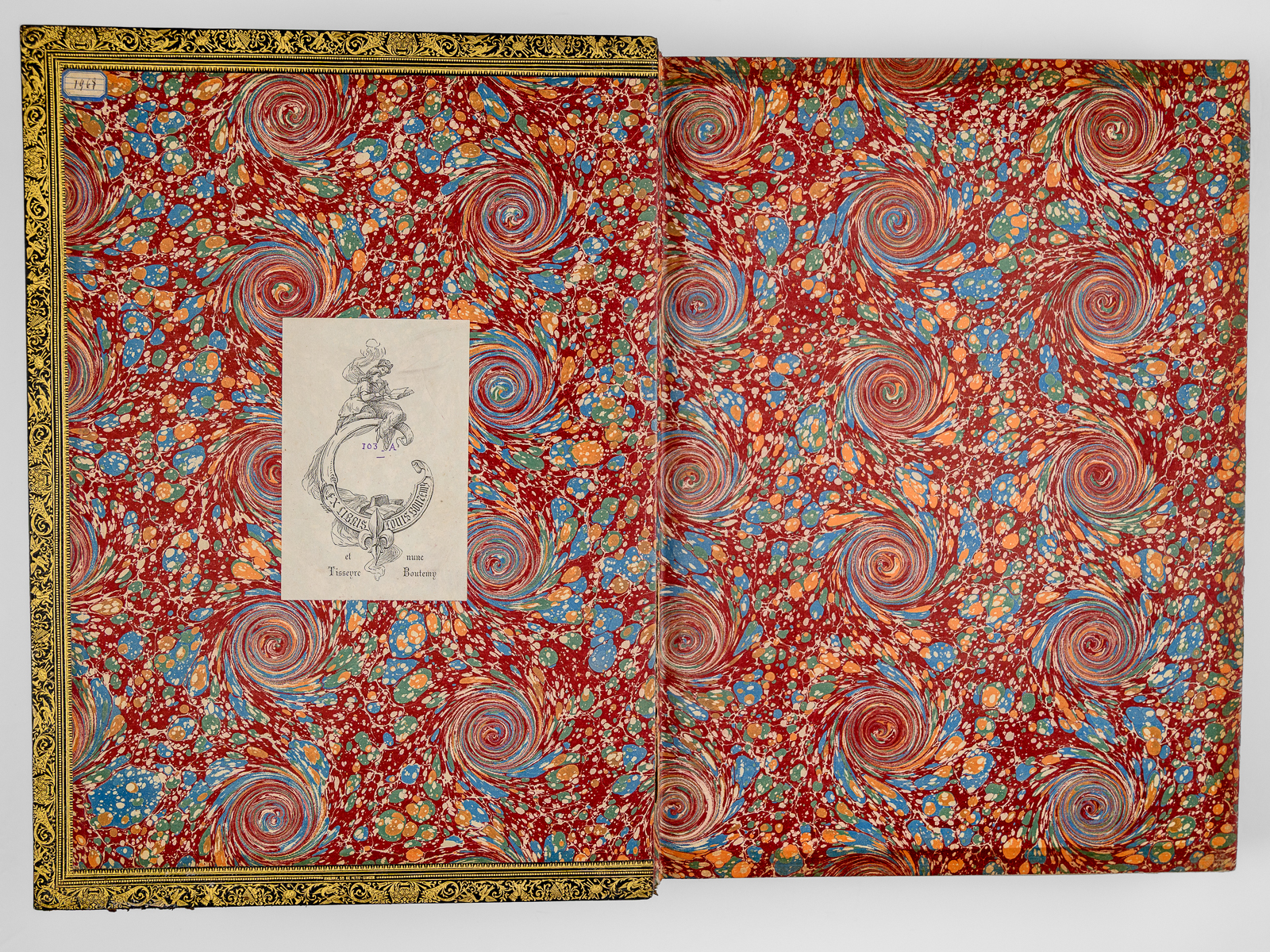 Par l'auteur du « Voyage dans un grenier », Vice-Président de la Société des Amis des Livres, un des 500 exemplaires en un volume sur papier impérial du Japon (après 150 exemplaires en 2 volumes numérotés) ; 1 vol. grand in-4 reliure plein maroquin bleu, dos à 5 nerfs dorés richement orné, plats orné à la Du Seuil, double filet doré en coupes, chasses richement ornée, reliure signée de Thierry, Succr. de Petit-Simier, À la Librairie de « L'Art », Paris, 1887, XVI-335 pp. Commentaire : Bibliophile, Charles Cousin (1822-1894) fut grand-maître du Grand Orient de France en 1883. Un chapitre entier est consacré à ses frères maçons, et la franc-maçonnerie évoquée à diverses reprises dans l'ouvrage. Bon état pour cet exemplaire établi dans une très belle reliure de Thierry (ex-libris gravé Louis Boutemy, reliure très lég. frottée, reste d'odeur de tabac).