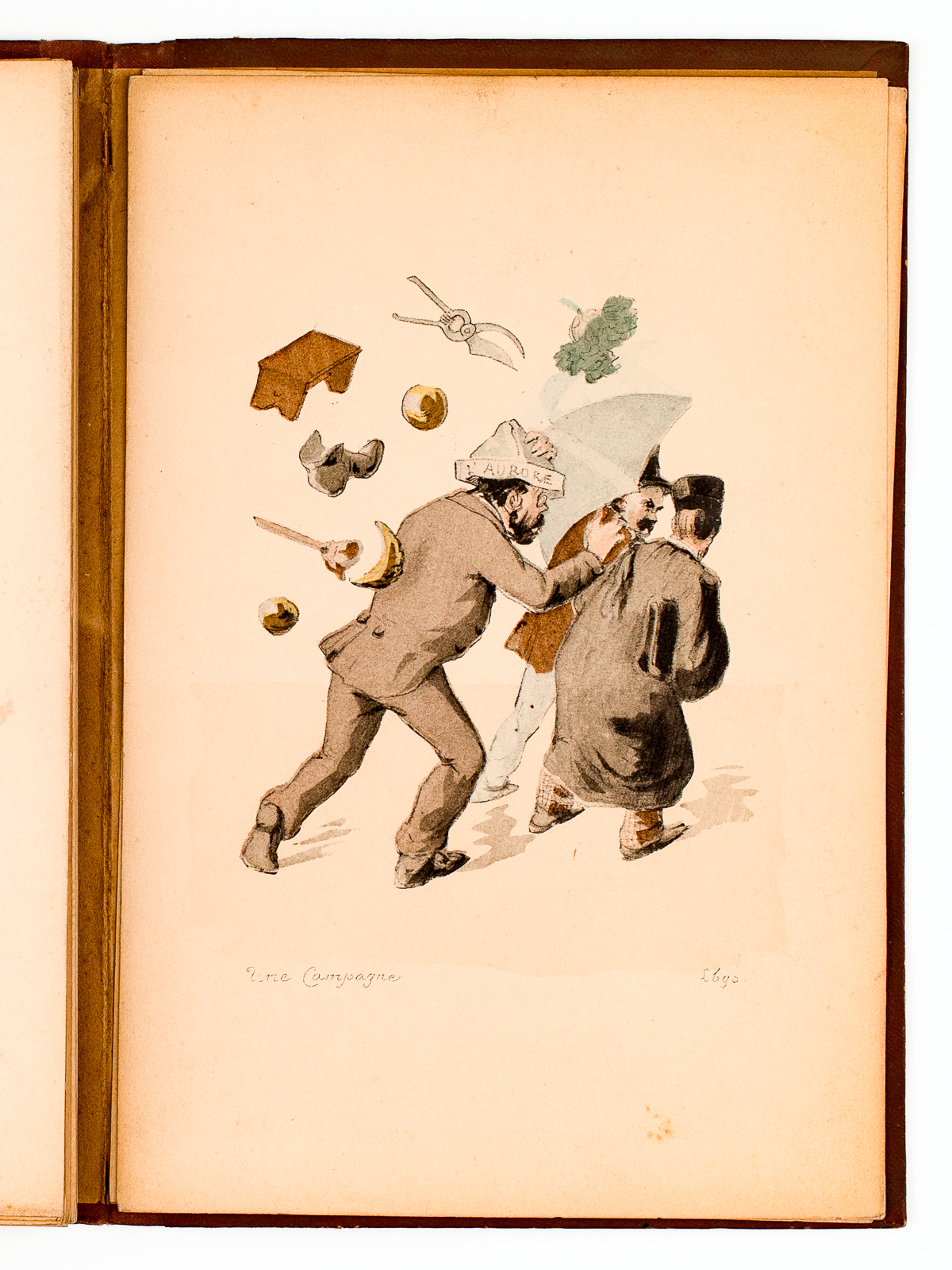 Commentaire : Exemplaire bien complet des 32 caricatures en couleurs moquant Emile Zola. Chaque caricature reprend le titre d'un livre de Zola : l'Assommoir (Zola vomissant contre un mur); Nana (Zola écoutant derrière la porte) ; Pot-Bouille (Zola séduisant la cuisinière) ; la Terre (Zola remontant son pantalon) ; l'Argent (Zola se courbant devant un financier à bicorne de polytechnicien) ; la Curée (Zola à quatre pattes dévorant la motte de beurre avec un chien et un porc) ; Lourdes (Zola assis et indécis entre la selle de la science et celle de la foi) ; etc... et en dernière caricature, deux personnages (dont Edouard Drumont) conduisant un Zola sous camisole chez les fous à Sainte-Anne ('Conclusion ... Et ce sera justifié'). L'ouvrage est publié au plus fort de l'affaire Dreyfus, l'année du célèbre 'J'accuse' publié par Zola le 13 janvier 1898 dans le journal L'Aurore. Etat très satisfaisant (chemise un peu frottée et sans les lacets, bon état par ailleurs, ex-libris en garde, on joint une coupure de presse sur Zola extraites des Nouvelles Littéraires de 1932)