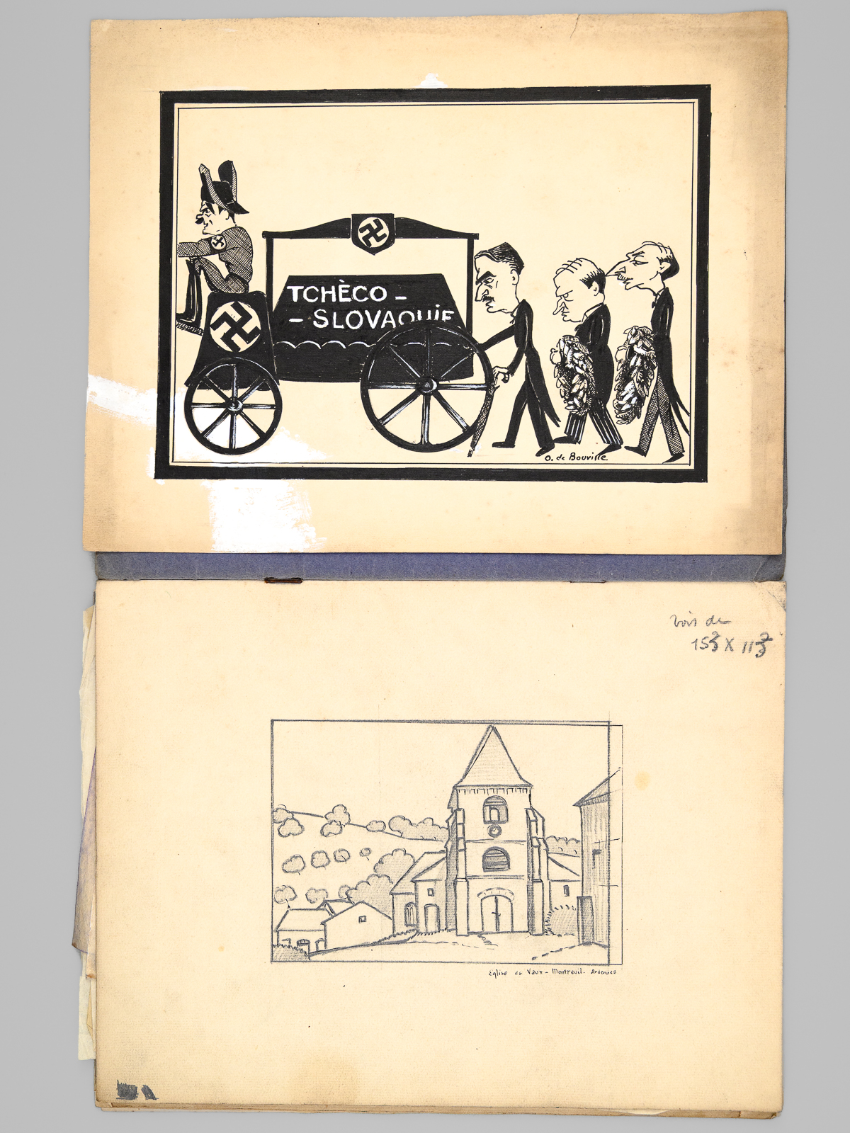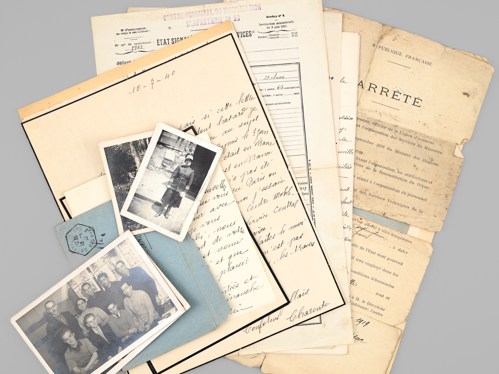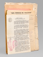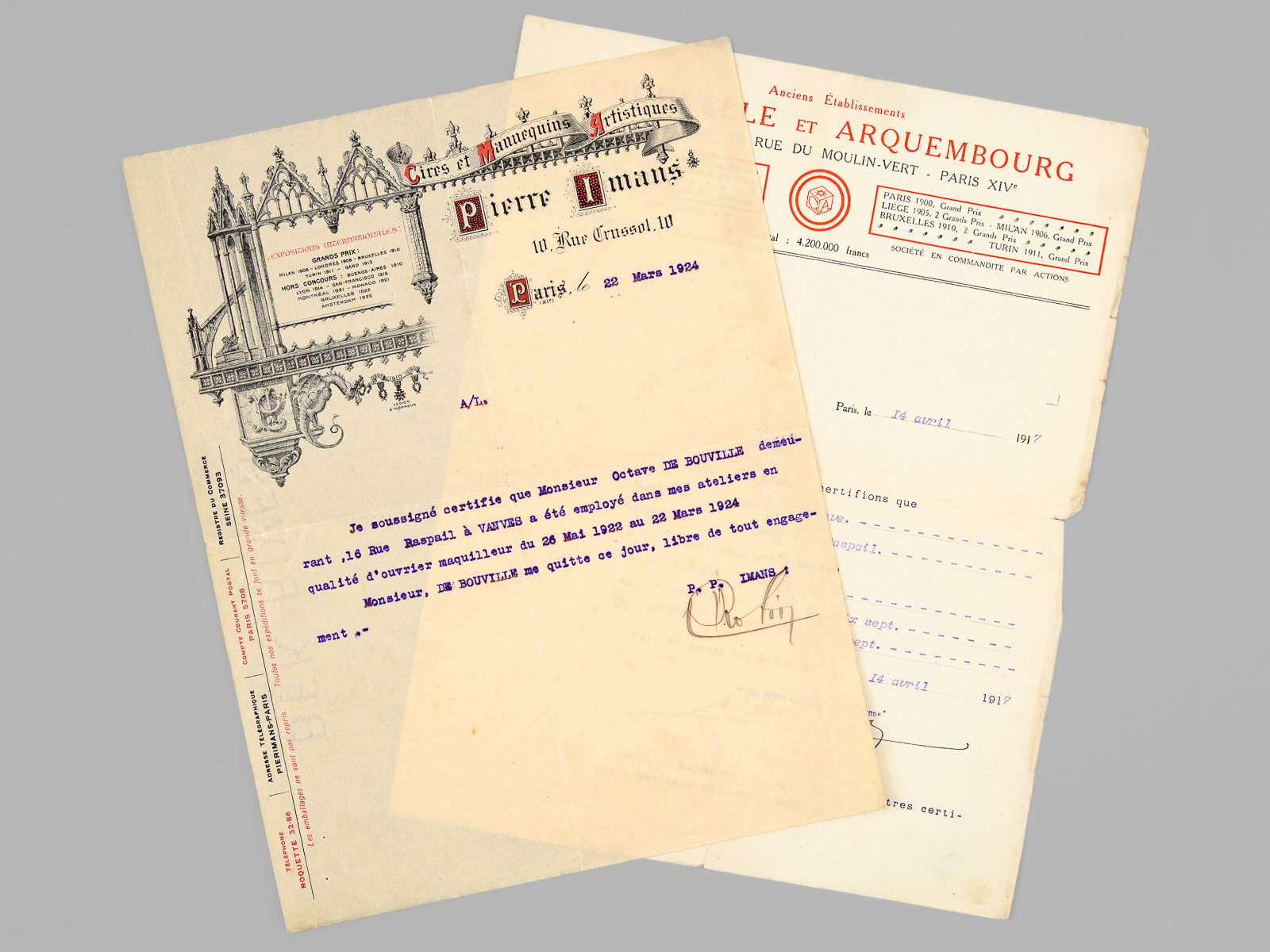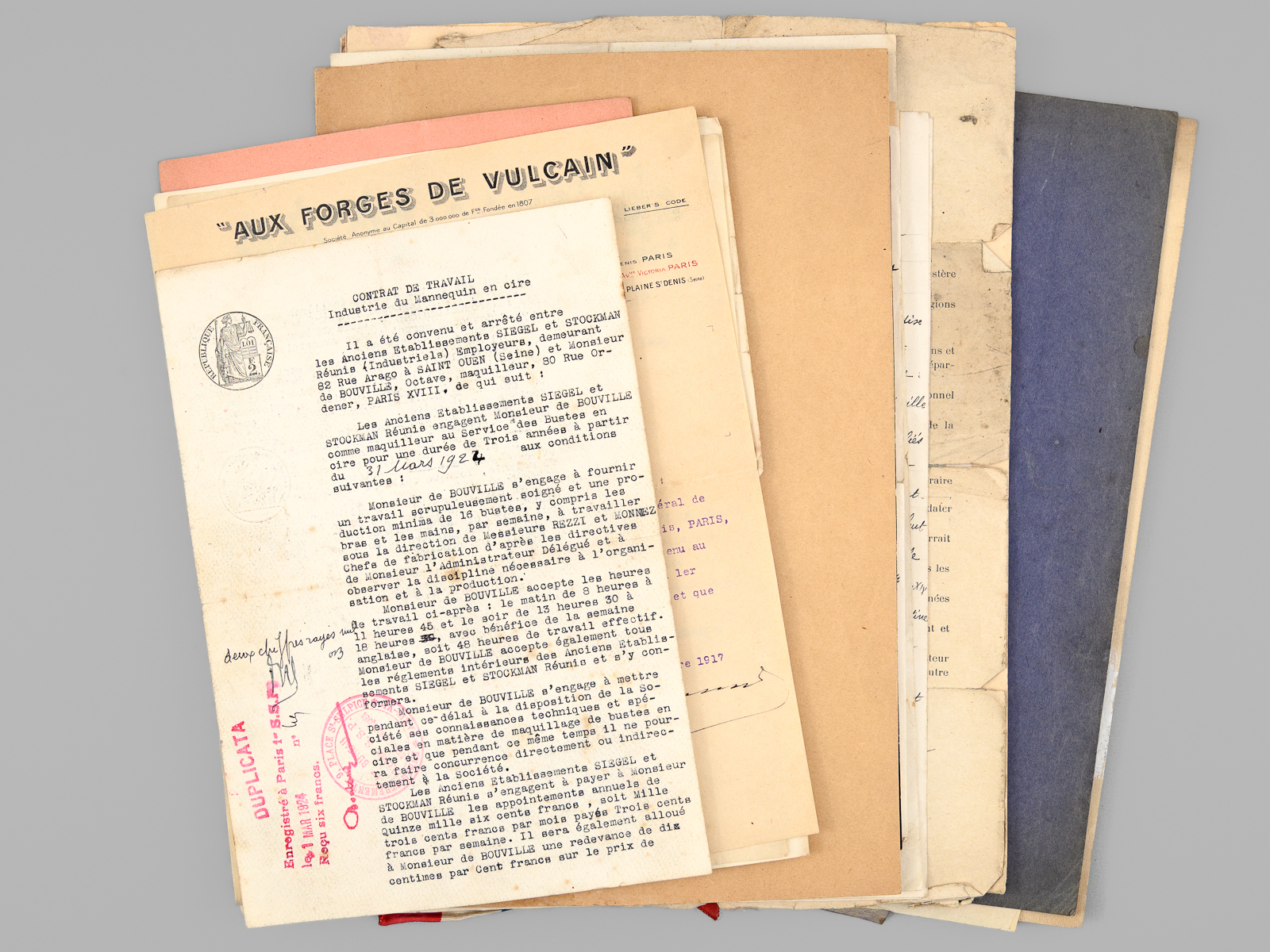 1 dossier contenant : [ Dossier d'archives sur Octave Louis Ernest Gossin de Bouville, dessinateur et décorateur ; Né à Neuvizy (Ardennes) le 21 mars 1899, marié à Henriette Vasseur : ] 2 cartes de prisonnier de guerre 1940-1941 ; Carte d'électeur 1938 ; Carte Ministère du travail Assurances sociales 1933 ; Curriculum Vitae signé de sa main (août 1937) ; Etat de service militaire ; 'Pétition' concession cimetière (1952) ; Diplômes Ministère de la santé publique (don du sang) : 4 ; Extrait J.O. Médaille d'honneur du travail ; Photos : 5 ; Bulletins de paie : 15 (dont Imprimerie Curial-Archereau) + 5 (Mannequins Siegel, 19 rue Réaumur,Paris, 1935) ; Contrats de travail : 6 (Anciens établissements Grouvelle et Arquembourg, 1917 - Pierre Imans Mannequins d'Art 1924 - Aux Forges de Vulcain, 1917) dont un contrat de travail 'comme maquilleur au Service des Bustes en cire' ; Lettres (courriers) : 8 (Jallais, Charente, nouvelles du Stalag) - 25 épreuves de bois gravés d'Octave de Bouville, 1 grand dessin original signé, 1 carnet de croquis (Ardennes : Eglise de Vaux-Montreuil, Moulin de Dendun, etc...) et 10 épreuves diverses ; Quittances d'assurance Mutuelle du Mans : 3 ; Reçus Assurances Sociales 1944-1945 : 17 + 2 ; Arrêté + attestation Ministère des régions libérées / Reconstitution foncière et cadastre : dessinateur (2 documents) ; Extrait d'acte de naissance ; ... Commentaire : Intéressant dossier d'archives privées d'un dessinateur et décorateur ardennais, Octave de Bouville (Né à Neuvizy en 1899 - mort à Belâbre en 1974), passé par les écoles Germain Pilon et Bernard Palissy, et qui travailla notamment à l'emploi peu commun de 'maquilleur au Service des Bustes en cire' pour la firme de mannequins Imans.