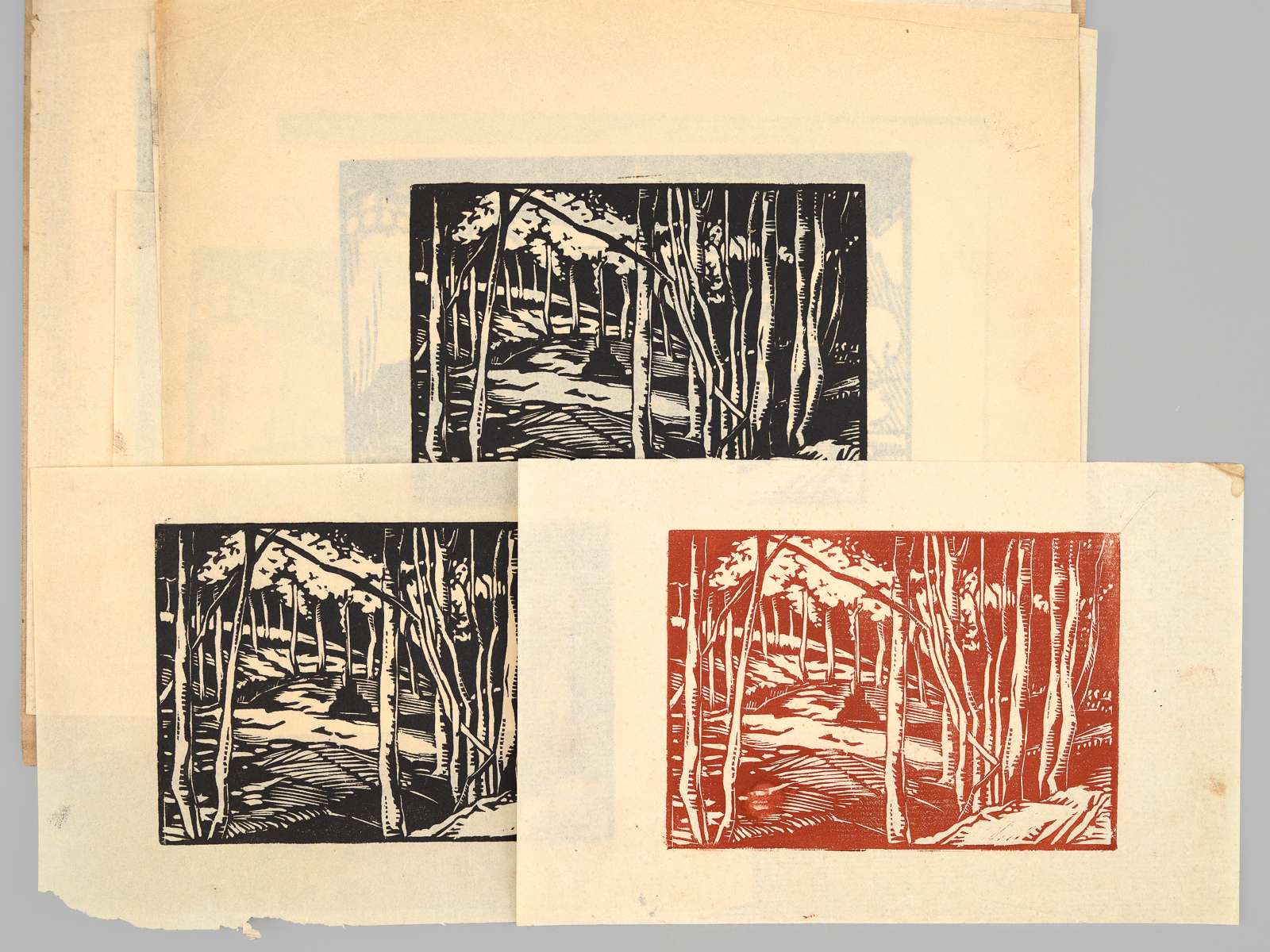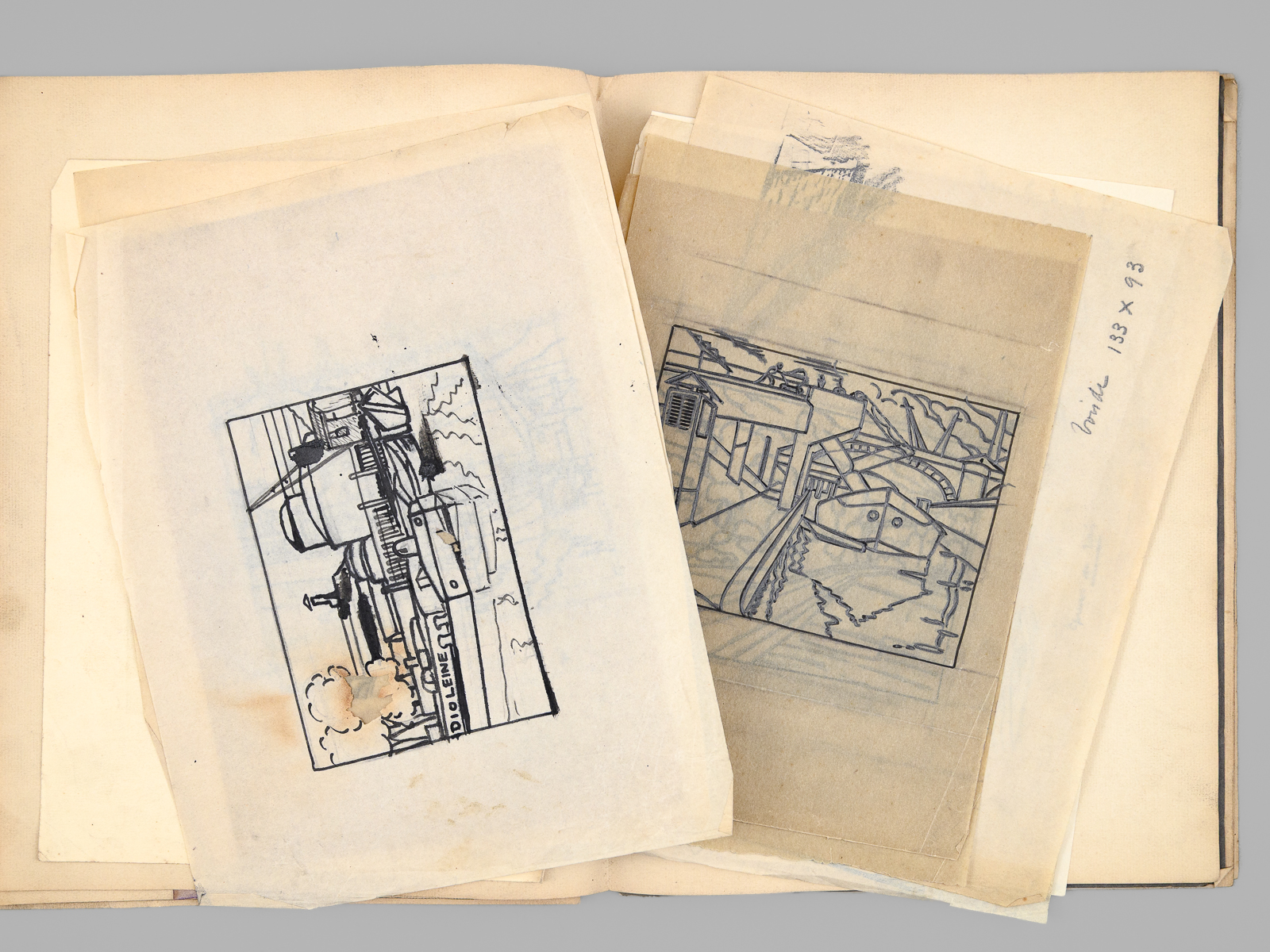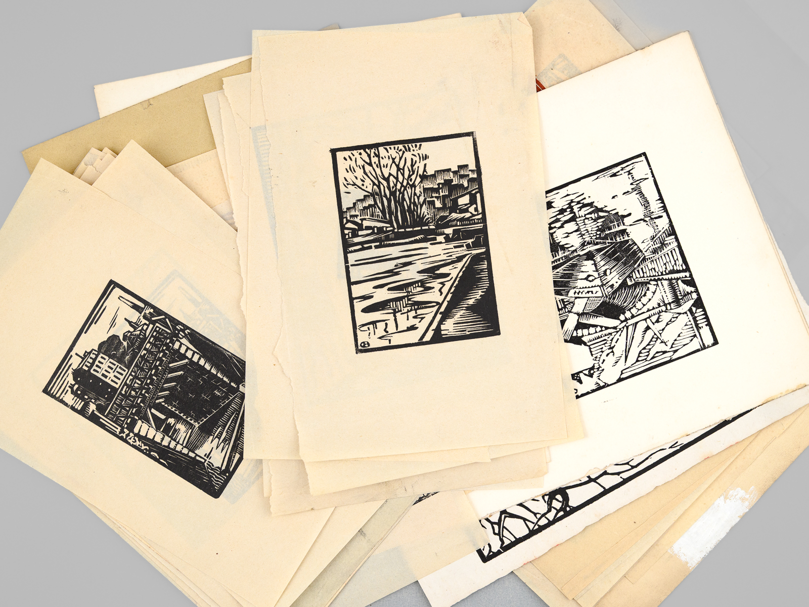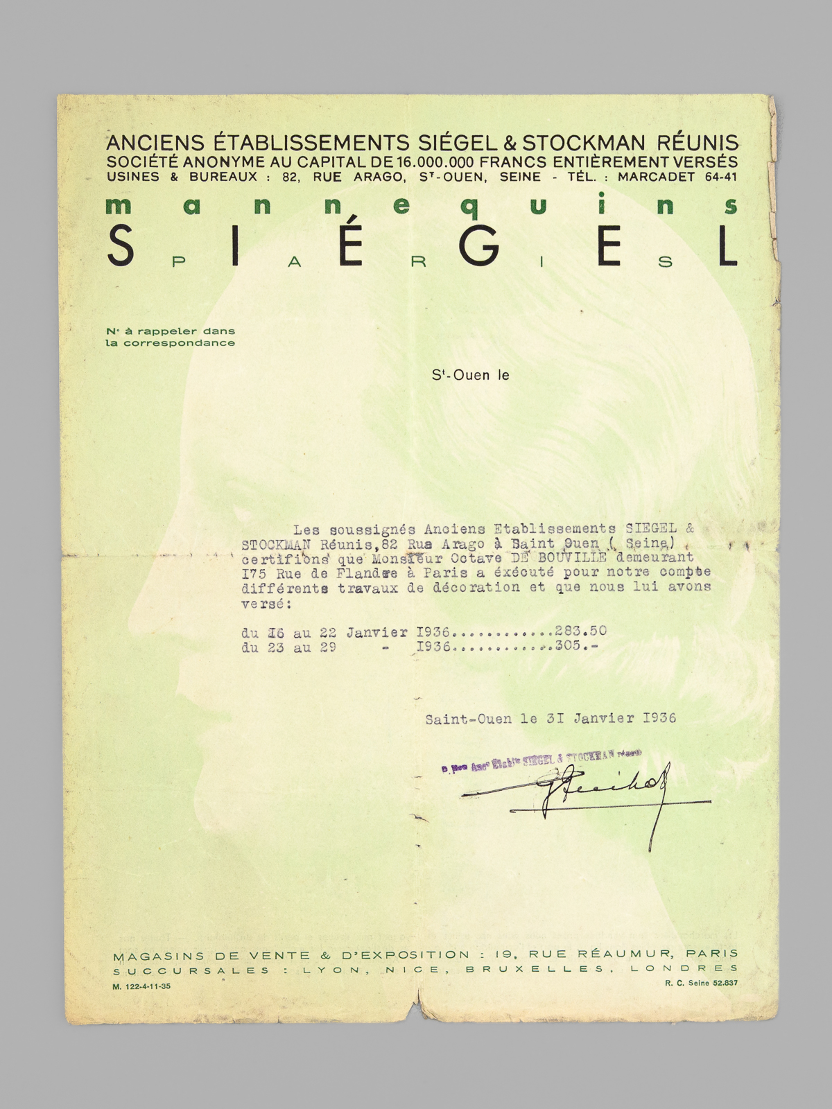 1 dossier contenant : [ Dossier d'archives sur Octave Louis Ernest Gossin de Bouville, dessinateur et décorateur ; Né à Neuvizy (Ardennes) le 21 mars 1899, marié à Henriette Vasseur : ] 2 cartes de prisonnier de guerre 1940-1941 ; Carte d'électeur 1938 ; Carte Ministère du travail Assurances sociales 1933 ; Curriculum Vitae signé de sa main (août 1937) ; Etat de service militaire ; 'Pétition' concession cimetière (1952) ; Diplômes Ministère de la santé publique (don du sang) : 4 ; Extrait J.O. Médaille d'honneur du travail ; Photos : 5 ; Bulletins de paie : 15 (dont Imprimerie Curial-Archereau) + 5 (Mannequins Siegel, 19 rue Réaumur,Paris, 1935) ; Contrats de travail : 6 (Anciens établissements Grouvelle et Arquembourg, 1917 - Pierre Imans Mannequins d'Art 1924 - Aux Forges de Vulcain, 1917) dont un contrat de travail 'comme maquilleur au Service des Bustes en cire' ; Lettres (courriers) : 8 (Jallais, Charente, nouvelles du Stalag) - 25 épreuves de bois gravés d'Octave de Bouville, 1 grand dessin original signé, 1 carnet de croquis (Ardennes : Eglise de Vaux-Montreuil, Moulin de Dendun, etc...) et 10 épreuves diverses ; Quittances d'assurance Mutuelle du Mans : 3 ; Reçus Assurances Sociales 1944-1945 : 17 + 2 ; Arrêté + attestation Ministère des régions libérées / Reconstitution foncière et cadastre : dessinateur (2 documents) ; Extrait d'acte de naissance ; ... Commentaire : Intéressant dossier d'archives privées d'un dessinateur et décorateur ardennais, Octave de Bouville (Né à Neuvizy en 1899 - mort à Belâbre en 1974), passé par les écoles Germain Pilon et Bernard Palissy, et qui travailla notamment à l'emploi peu commun de 'maquilleur au Service des Bustes en cire' pour la firme de mannequins Imans.