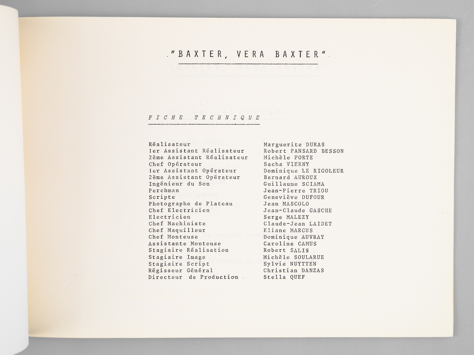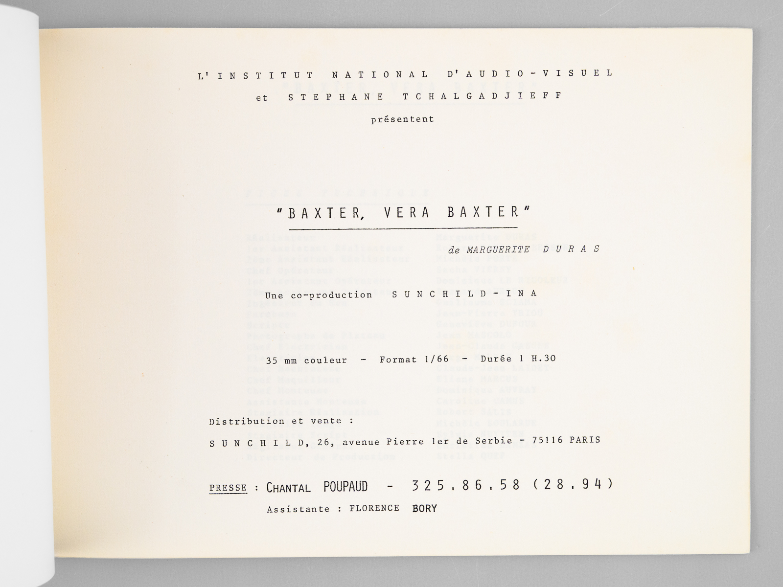 [ Dossier de presse original avec un texte inédit de Marguerite Duras : ] Baxter, Vera Baxter [ Edition originale ] L'Institut National d'Audio-Visuel et Stéphane Tchalgadjieff présentent 'Baxter, Vera Baxter' de Marguerite Duras. Une