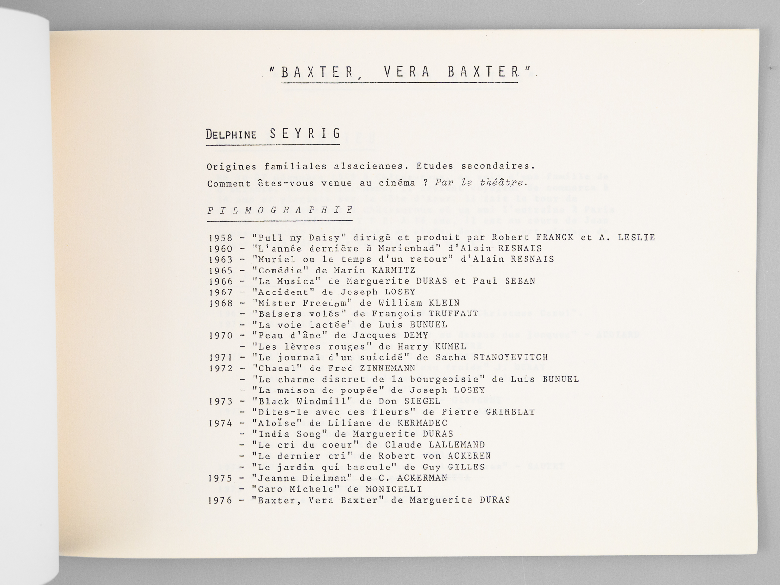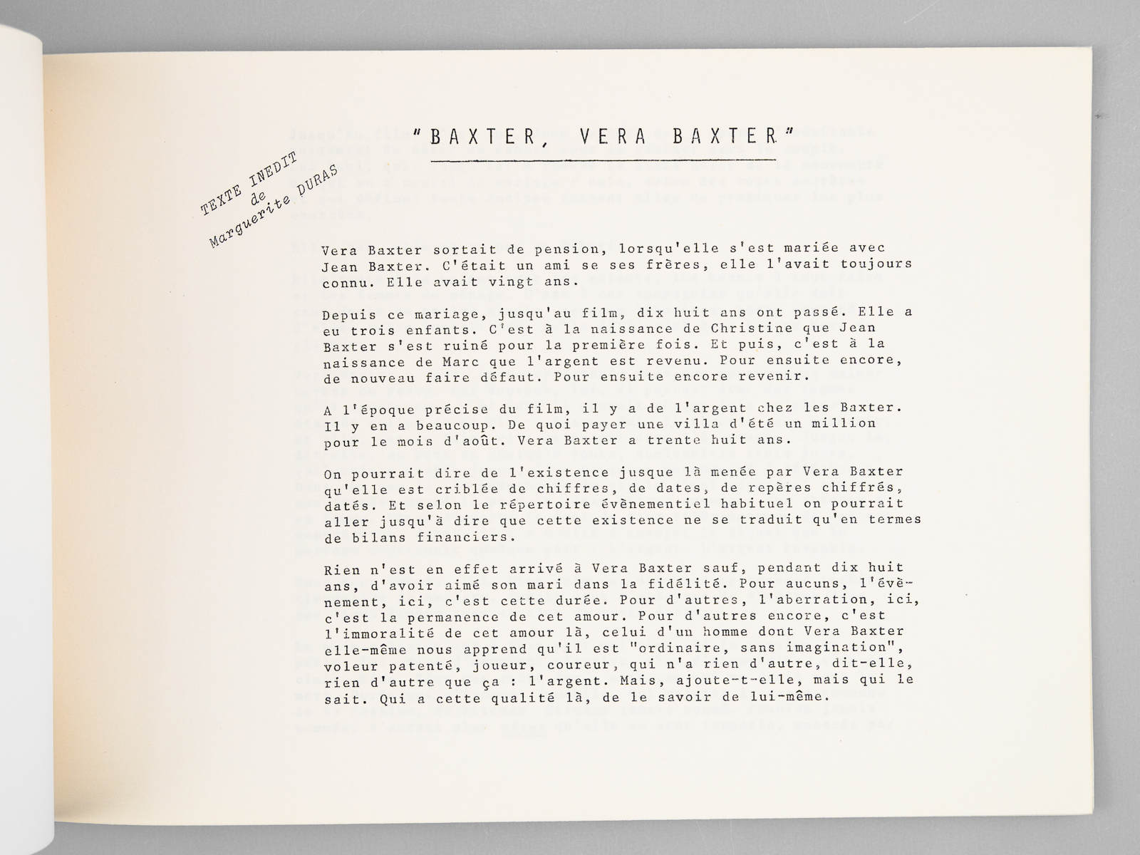 Commentaire : Très rare document, probable dossier de presse à l'attention des professionnels, pour le film de Marguerite Duras sorti en 1977 : 'Baxter, Vera Baxter'. Un résumé du film de 3 pages signé par Marguerite Duras est précédé la mention 'texte inédit de Marguerite Duras' ; on trouve in-fine le détail de la filmographie de Marguerite Duras et des acteurs Delphine Seyrig et Gérard Depardieu, et une présentation du compositeur Carlos d'Alessio. Bon exemplaire de ce document très rare.