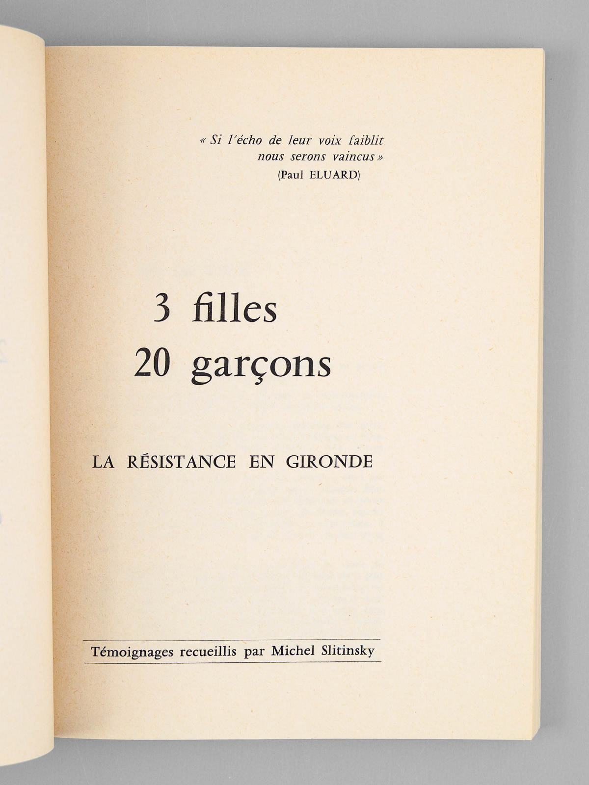 3 filles, 20 garçons - La Résistance en Gironde , témoignages recueillis par Michel Slitinsky [ Livre dédicacé par l'auteur ]