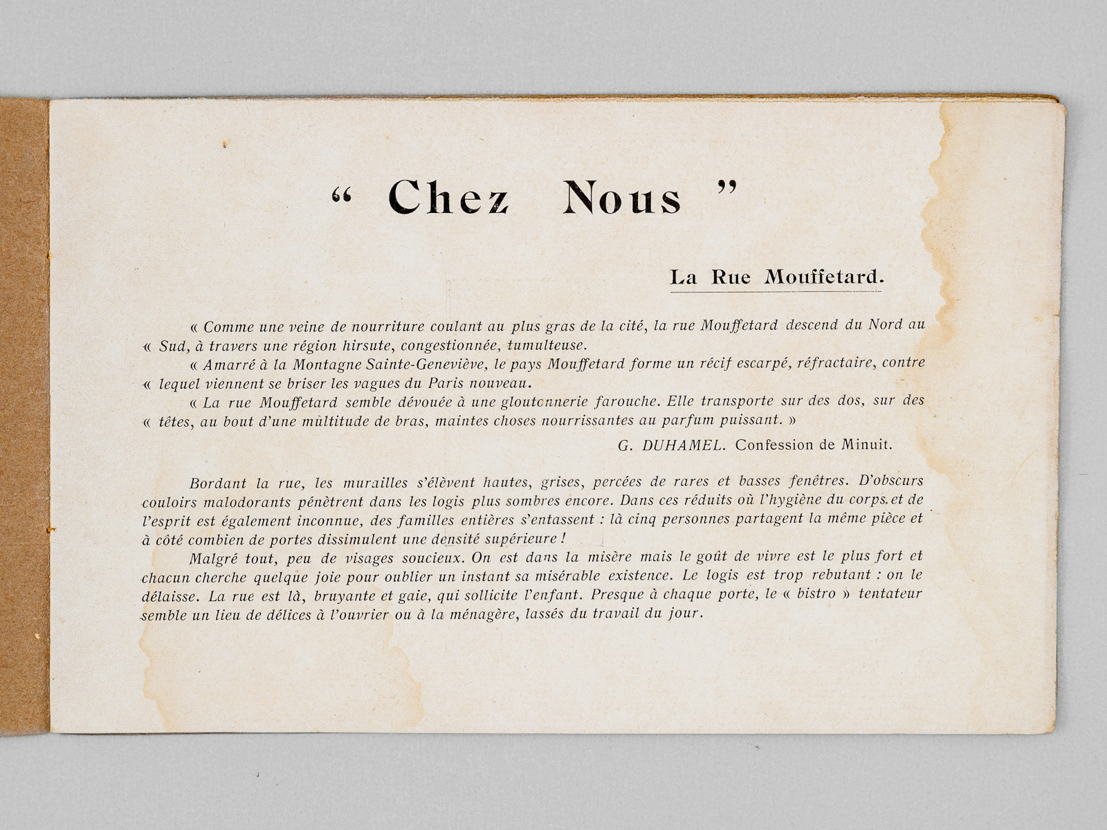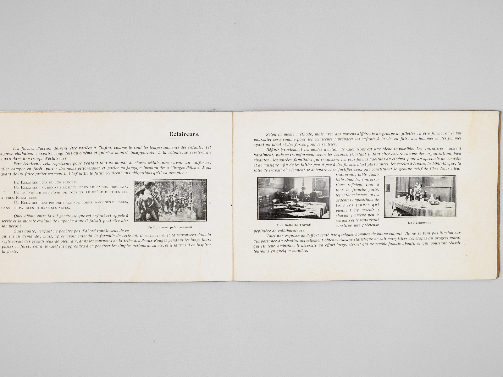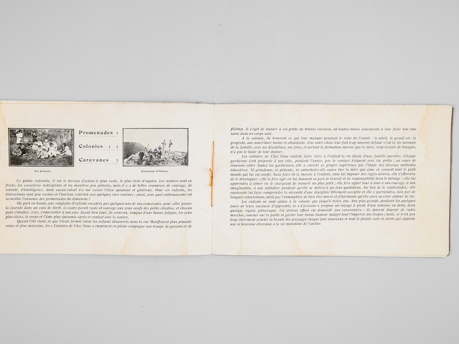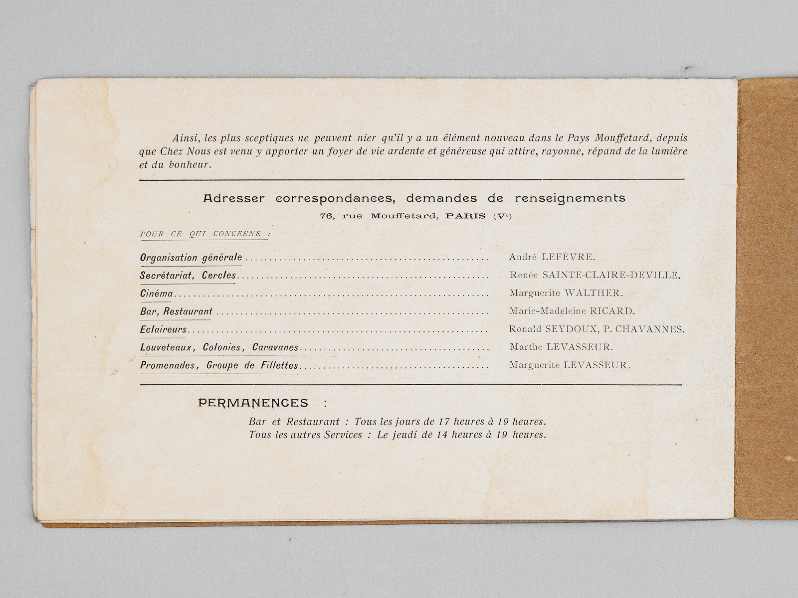 Commentaire : Rare exemplaire de cette brochure illustrée, évoquant le '76 rue Mouffetard' à Paris, siège de 'Chez nous', dirigée par le dessinateur industriel et jeune militant sillonniste André Lefèvre. Point de départ de colonies de vacances, de camps scouts et de caravanes scolaires pour les jeunes, le local accueille notamment un bar et un cinéma. Etat très satisfaisant (ancienne mouill., bon état par ailleurs) pour ce document rare.