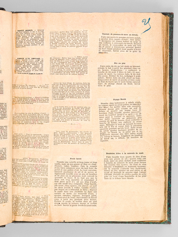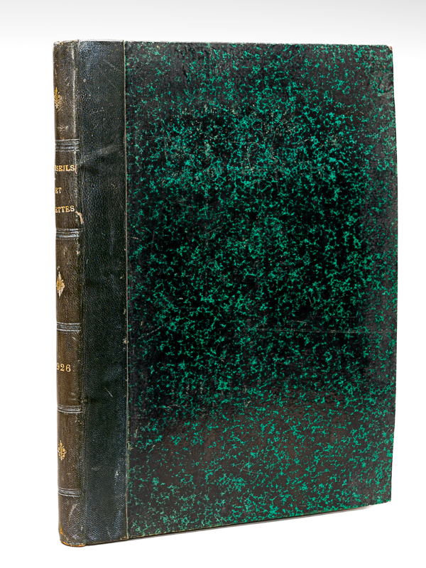 1 vol. in-4 reliure uniforme demi-basane verte, dos lisse orné, environ 100 feuillets : Conseils et Recettes [ Année 1926 : plus de 1000 recettes et conseils pratiques recueillis en 1 volume, avec table des matières manuscrite ] Commentaire : Etonnant et impressionnant recueil de plus de 1000 recettes et conseils pratiques, en autant d'articles contrecollés, découpés dans des journaux de l'époque non identifiés. Chaque volume est pourvu d'une table des matières manuscrites, qui recense par ordre alphabétique les innombrables recettes et conseils pratiques ; les recettes sont beaucoup plus nombreuses que les conseils pratiques (probablement 9 recettes pour un conseil pratique) : potage Borch, boulettes frites à la semoule de maïs, maquereaux à la Brestoise, Turbot sauce aurore, crêpes montmartroises, foie de veaux aux croûtons, omelette Saint-Antoine, paupiettes de veau à la Lucullus, carpe farcie au foie gras, poulet en lézards, etc. etc. Bon état.