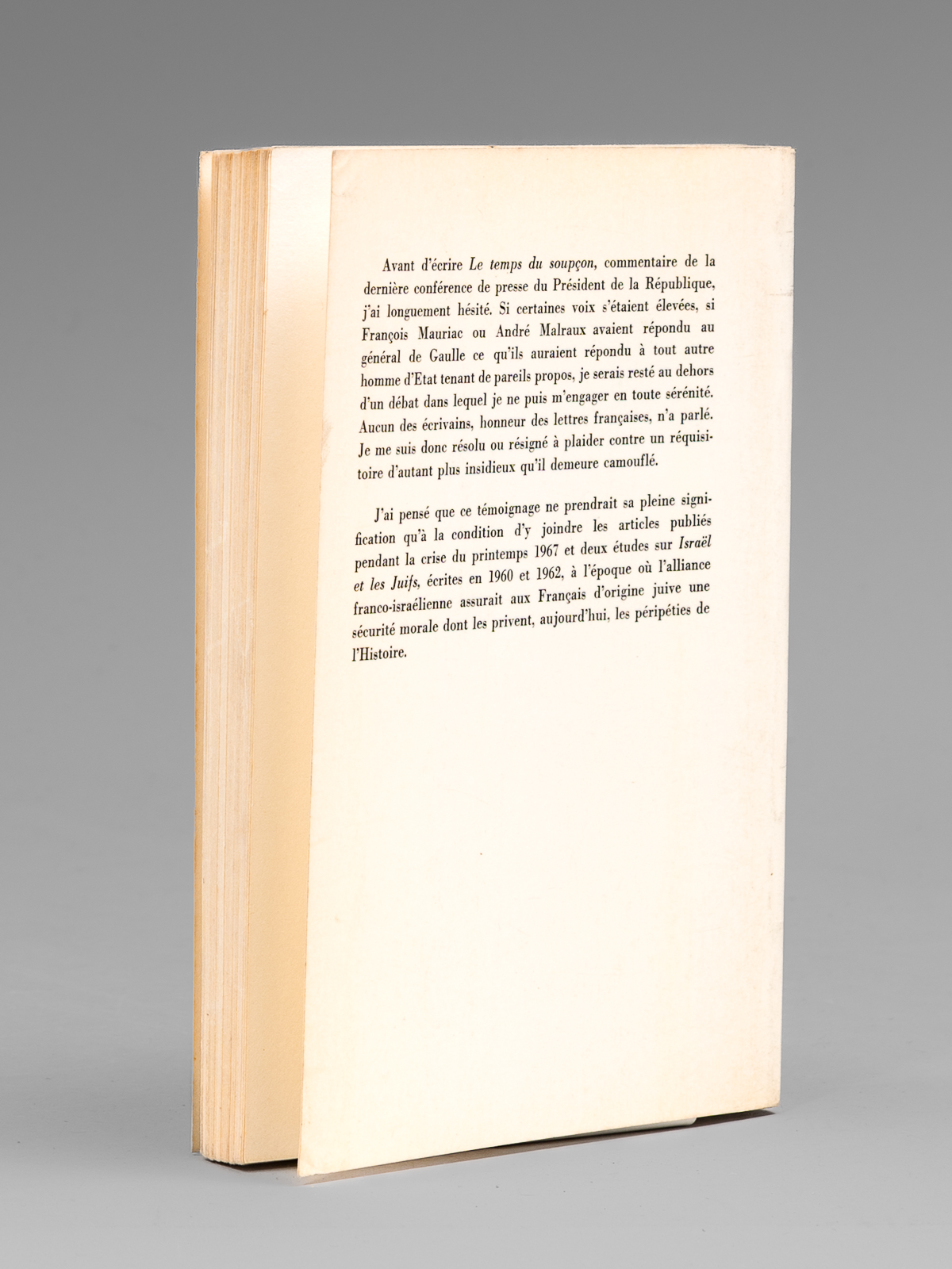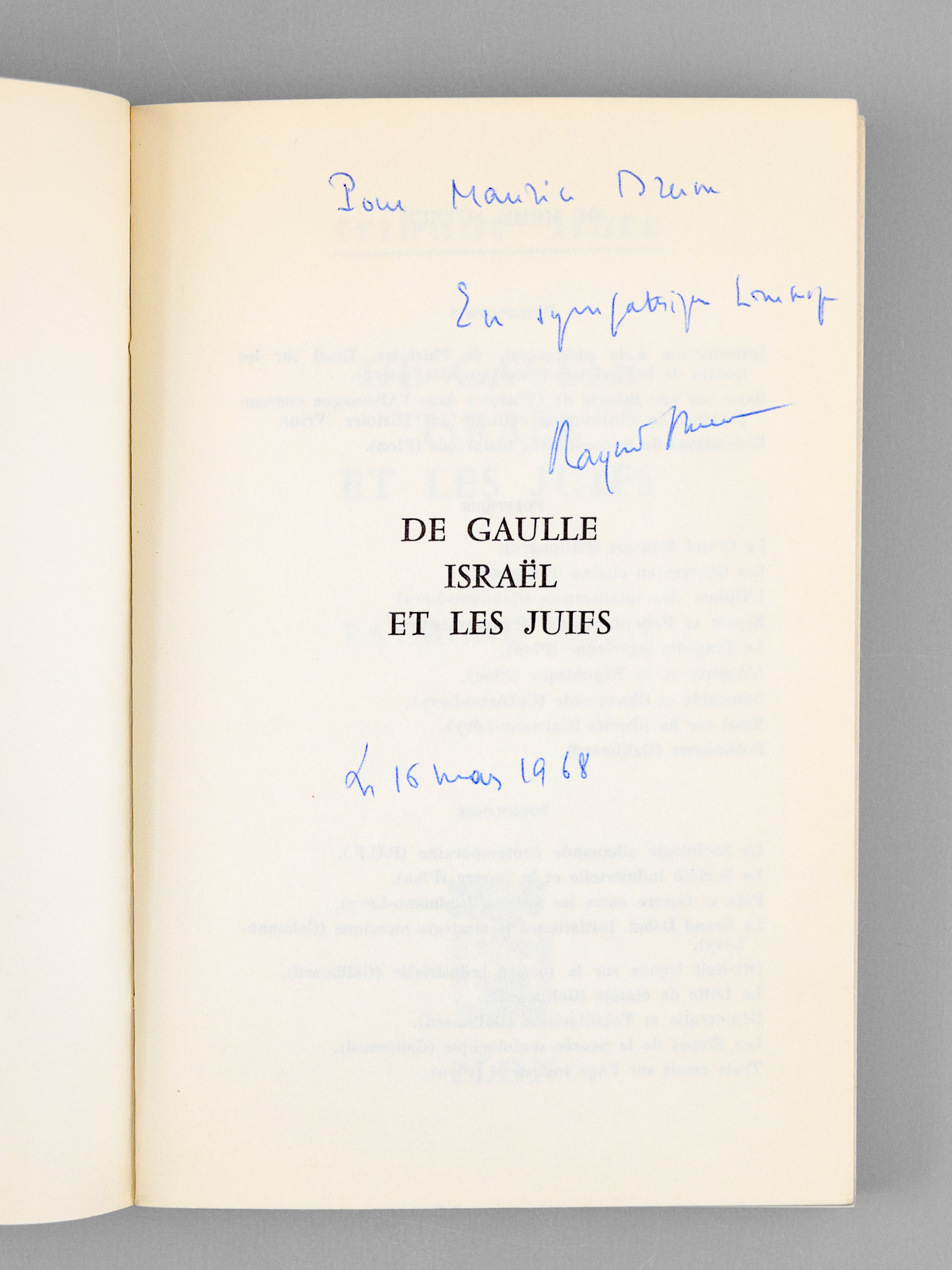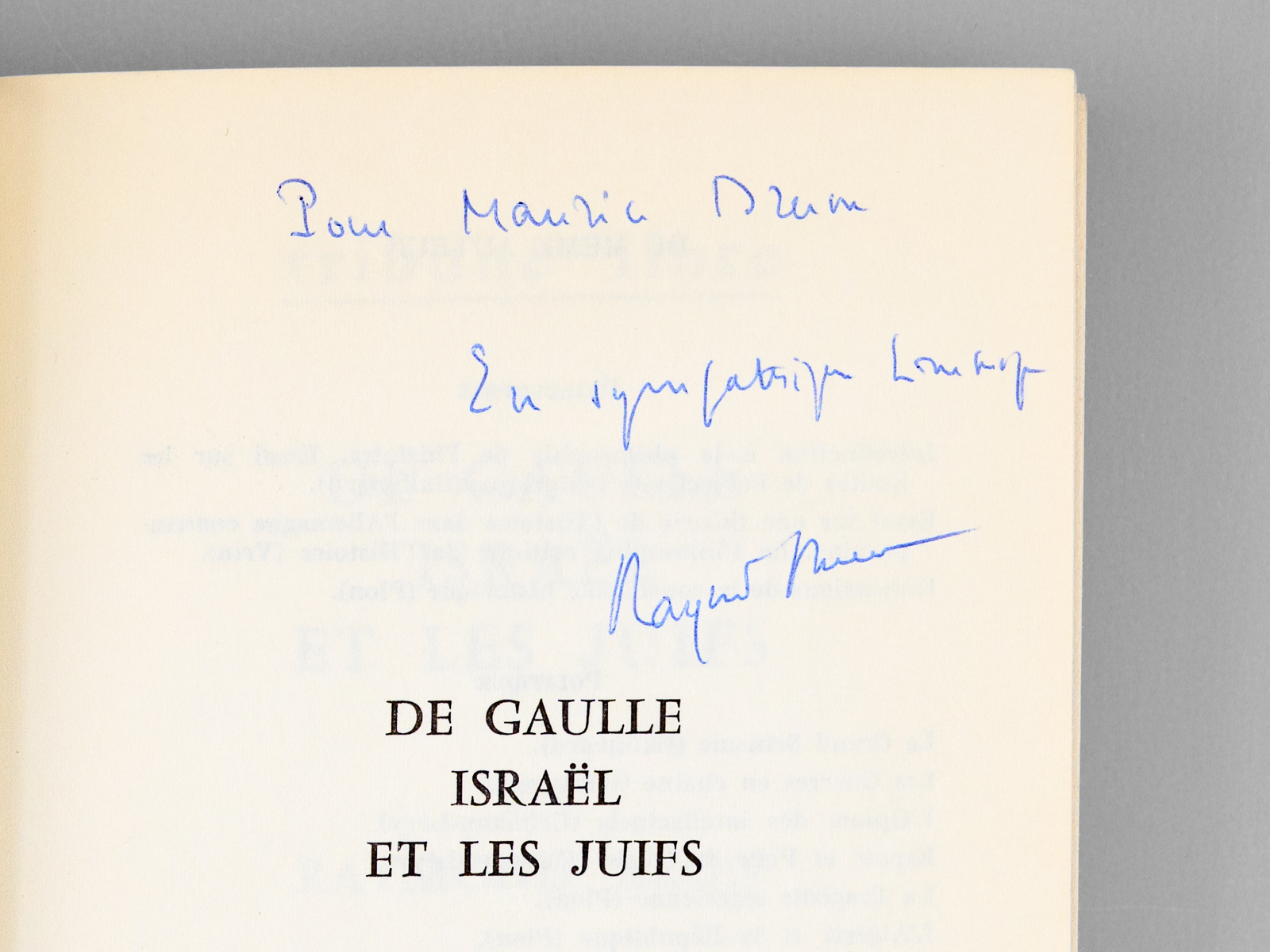 1 vol. in-8 br., Tribune Libre, Plon, Paris, 1968, 183 pp. Commentaire : Envoi de Raymond Aron daté du 16 mars 1968 'Pour Maurice Druon, en sympathique hommage'. Bon exemplaire de superbe provenance : de la bibliothèque du grand écrivain et futur Secrétaire Perpétuel de l'Académie Française, Maurice Druon, qui a signalé au crayon un passage du livre : 'J'appartiens donc à ces Juifs que Sartre, dans son essai, tient pour typiques, Juifs parce que le monde extérieur les déclare tels, qui assument leur judaïsme par dignité, mais qui ne l'éprouvent pas spontanément'.