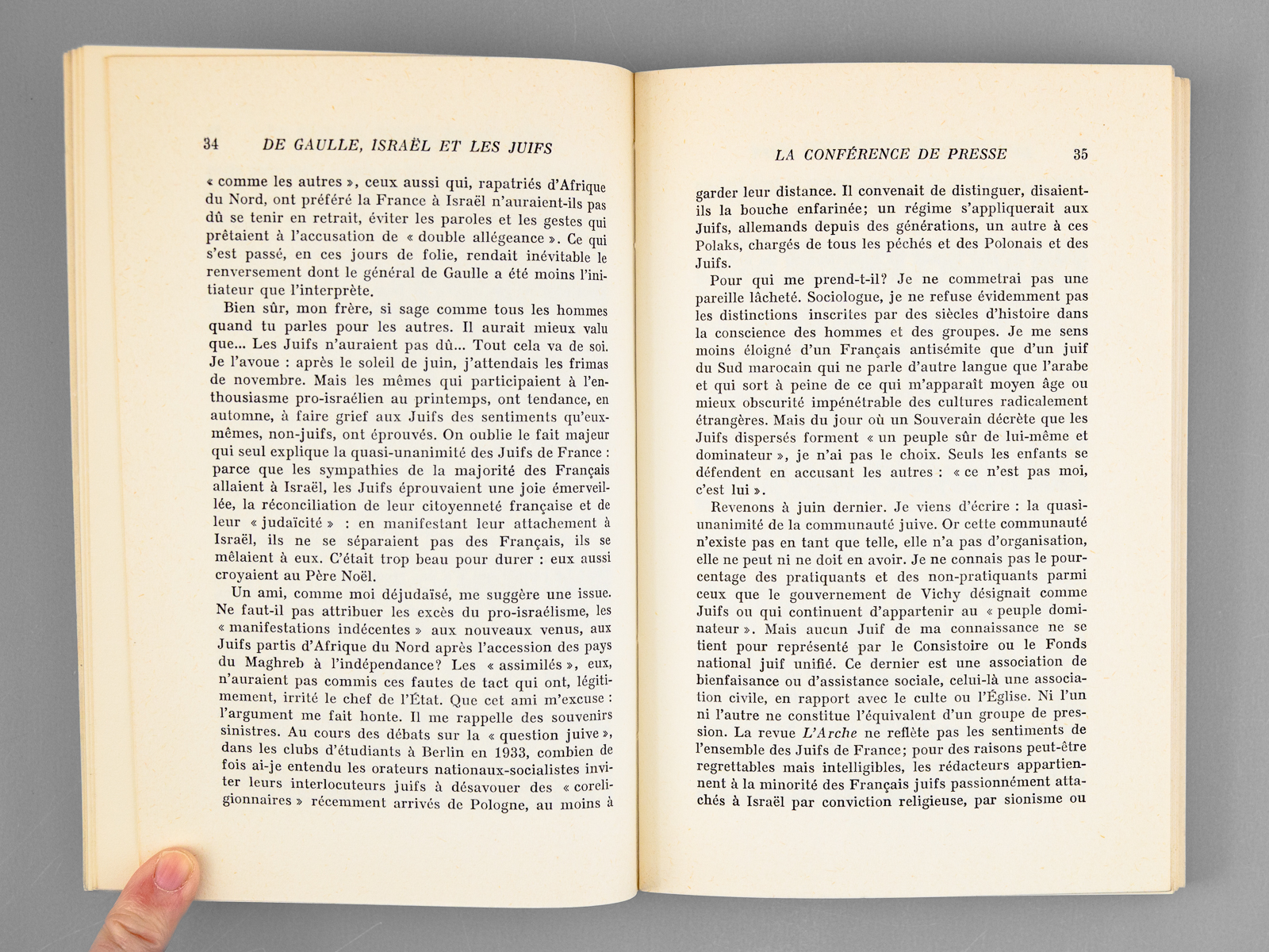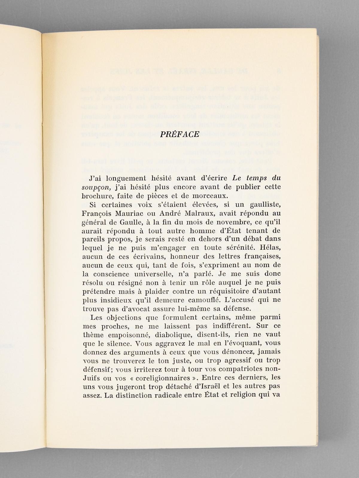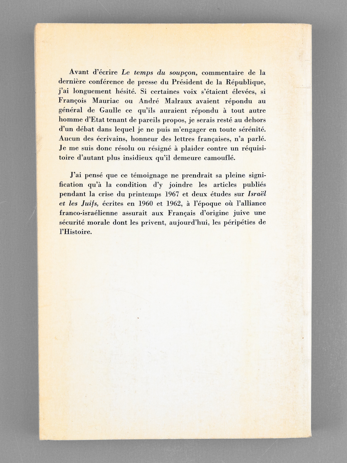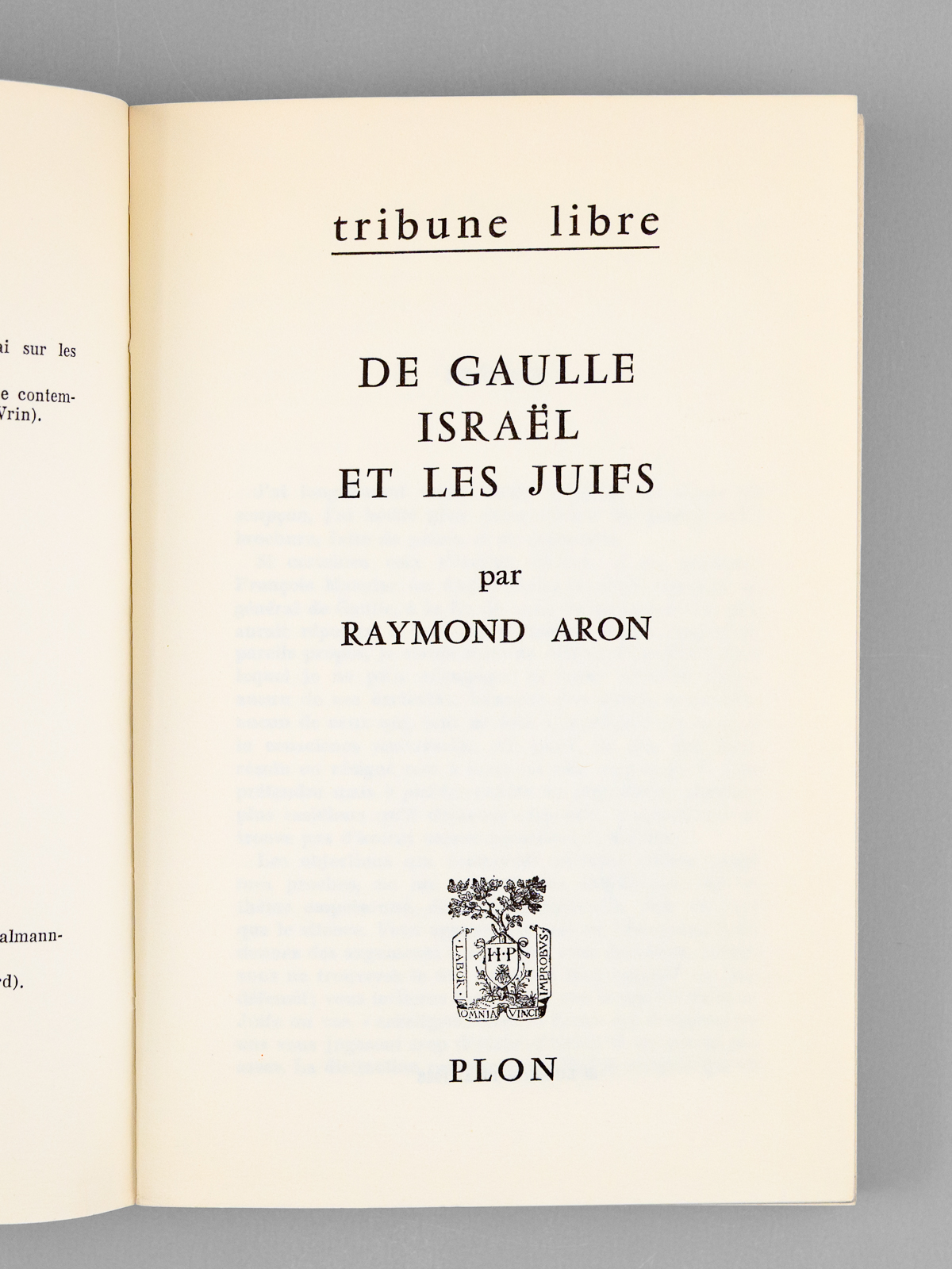 1 vol. in-8 br., Tribune Libre, Plon, Paris, 1968, 183 pp. Commentaire : Envoi de Raymond Aron daté du 16 mars 1968 'Pour Maurice Druon, en sympathique hommage'. Bon exemplaire de superbe provenance : de la bibliothèque du grand écrivain et futur Secrétaire Perpétuel de l'Académie Française, Maurice Druon, qui a signalé au crayon un passage du livre : 'J'appartiens donc à ces Juifs que Sartre, dans son essai, tient pour typiques, Juifs parce que le monde extérieur les déclare tels, qui assument leur judaïsme par dignité, mais qui ne l'éprouvent pas spontanément'.