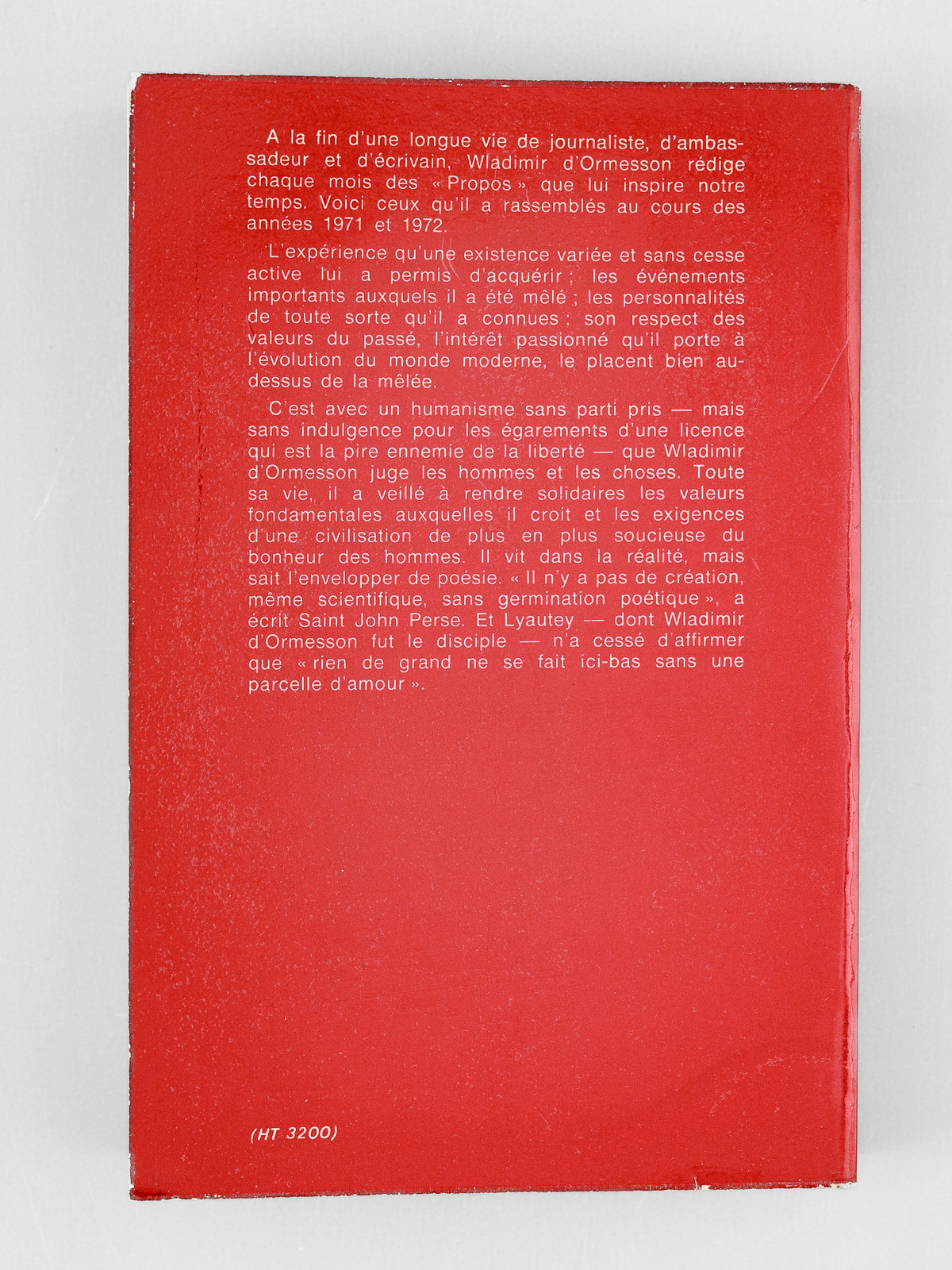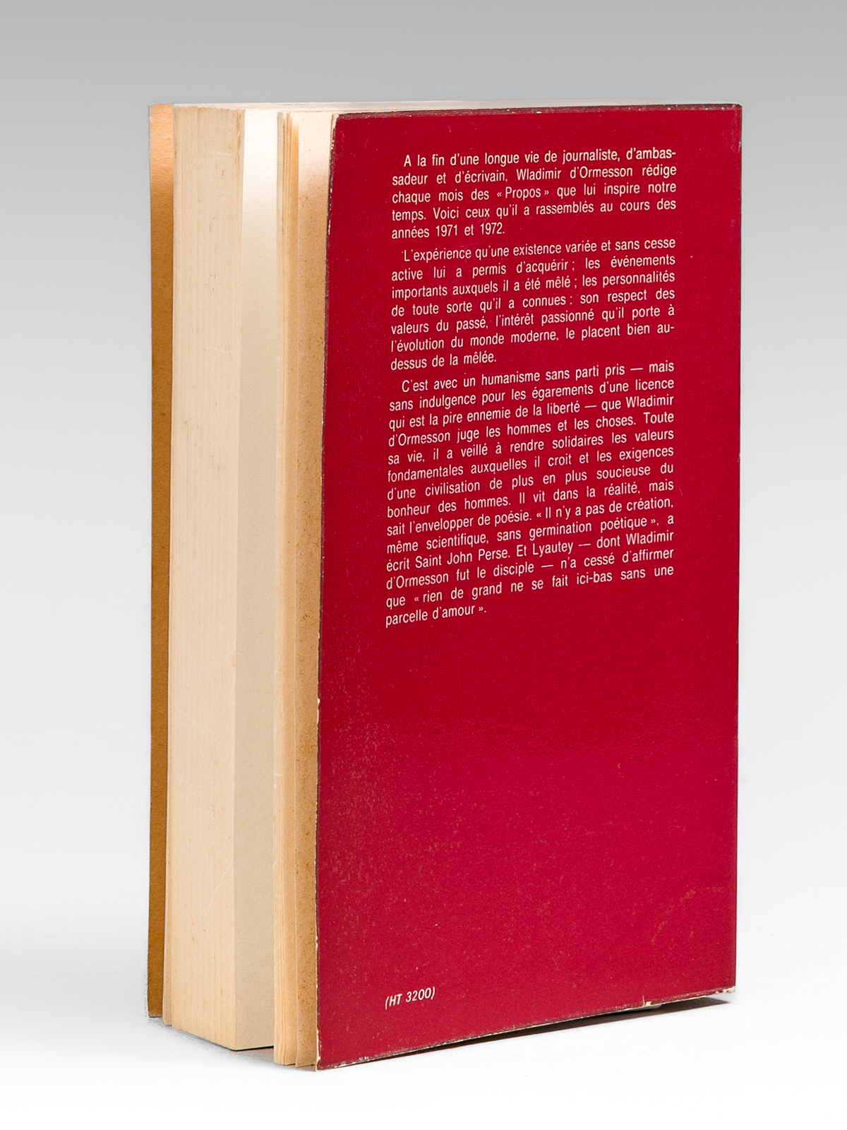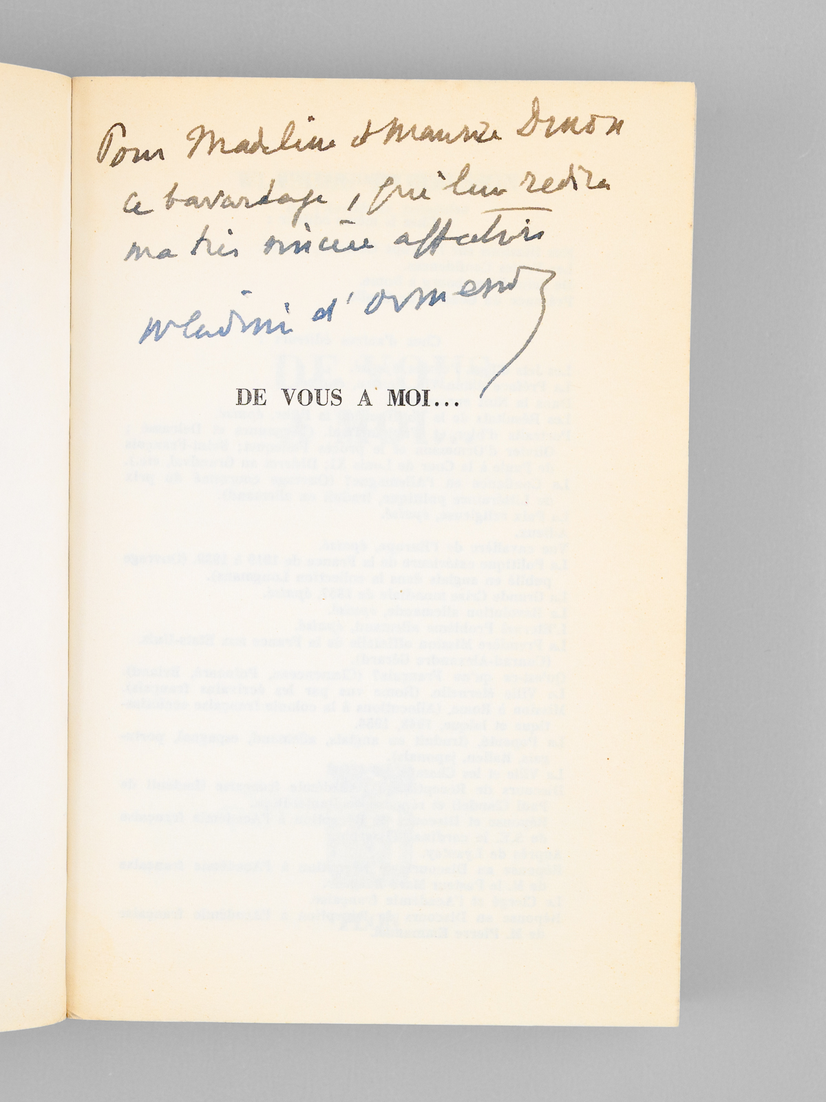 1 vol. in-8 cartonnage éditeur sous jaquette illustrée, Plon, Paris, 1973, 345 pp. Commentaire : Bel envoi de Wladimir d'Ormeson 'pour Madeleine et Maurice Druon ce bavardage, qui leur redira ma très sincère affection'. Belle provenance pour ce remarquable ouvrage de souvenirs : de la bibliothèque de Maurice Druon, futur Secrétaire Perpétuel de l'Académie Française.