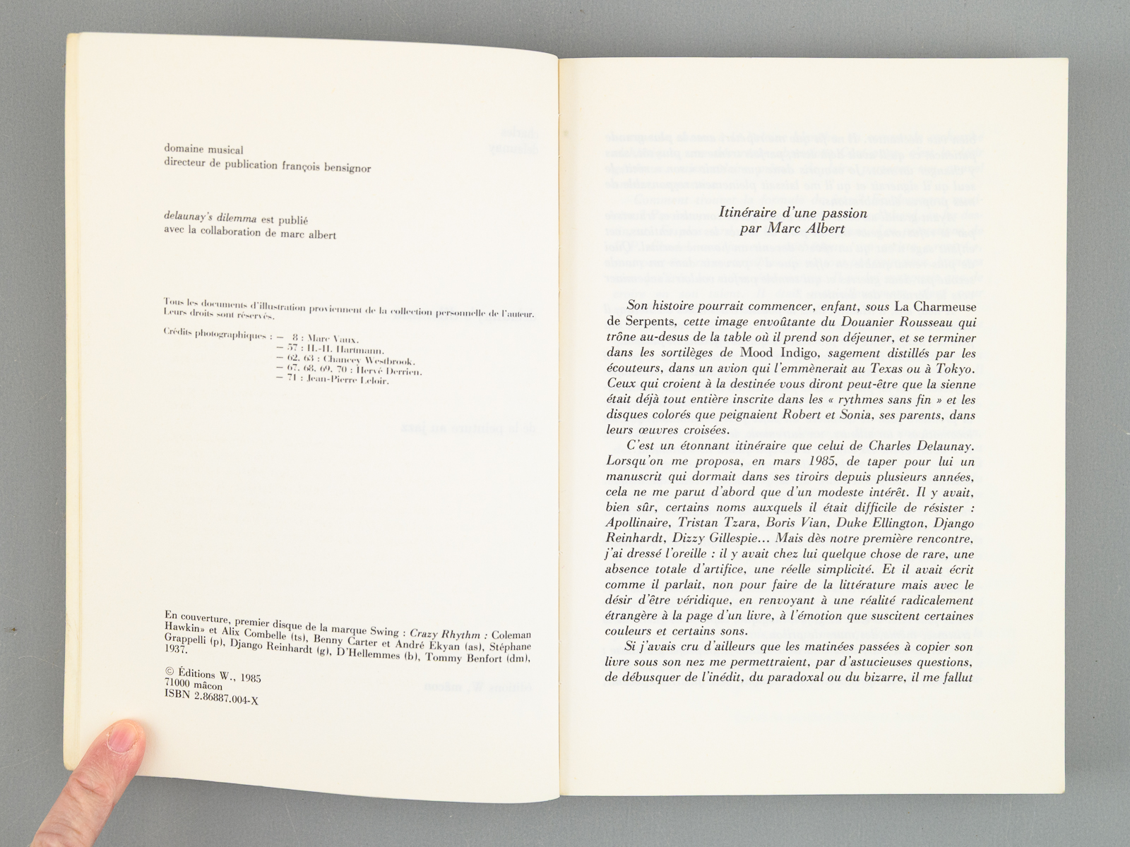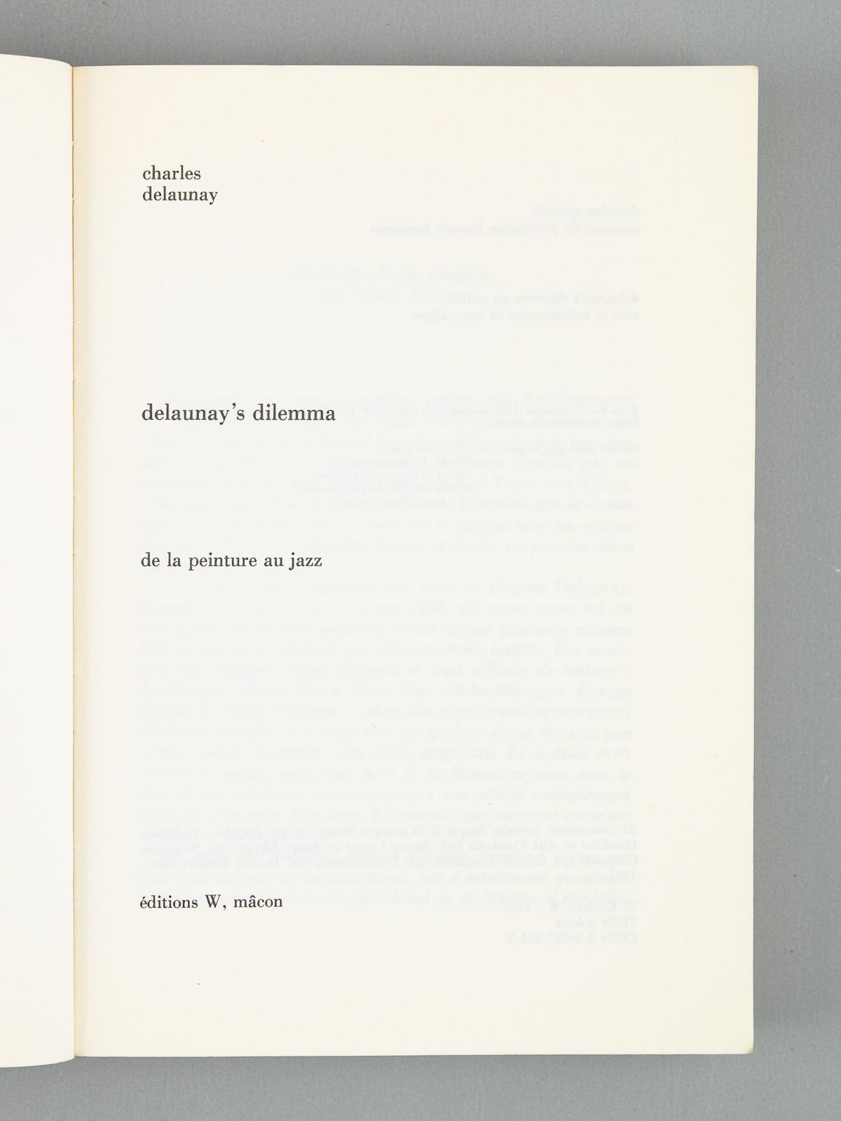 1 vol. in-12 br., éditions W, Mâcon, 1985, 271 pp. et 79 photos. On joint quelques coupures de presse sur Charles Delaunay. Commentaire : Bon état pour cette autobiographie de Charles Delaunay (1911-1985). Fils des peintres Sonia et Robert Delanay, après un début de carrière comme dessinateur publicitaire, ce passionné de jazz devint en 1933 le secrétaire d'Hugues Panassié, avec lequel il co-fonda la revue 'Jazz Hot'. Il fut également producteur de disques, ayant notamment co-fondé le label Vogue. Son énorme collection de disques, ainsi que ses archives sont désormais à la Bibliothèque Nationale. Ouvrage peu courant désormais.