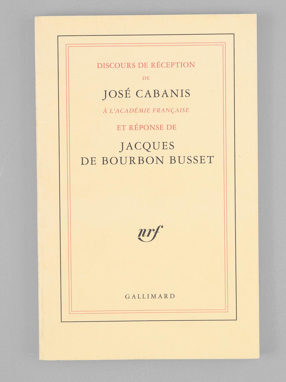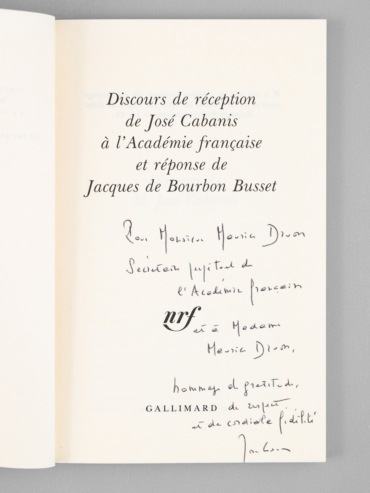 Discours de Réception de José Cabanis à l'Académie Française et réponse de Jacques de Bourbon Busset [ Livre dédicacé par l'auteur à Maurice Druon ]