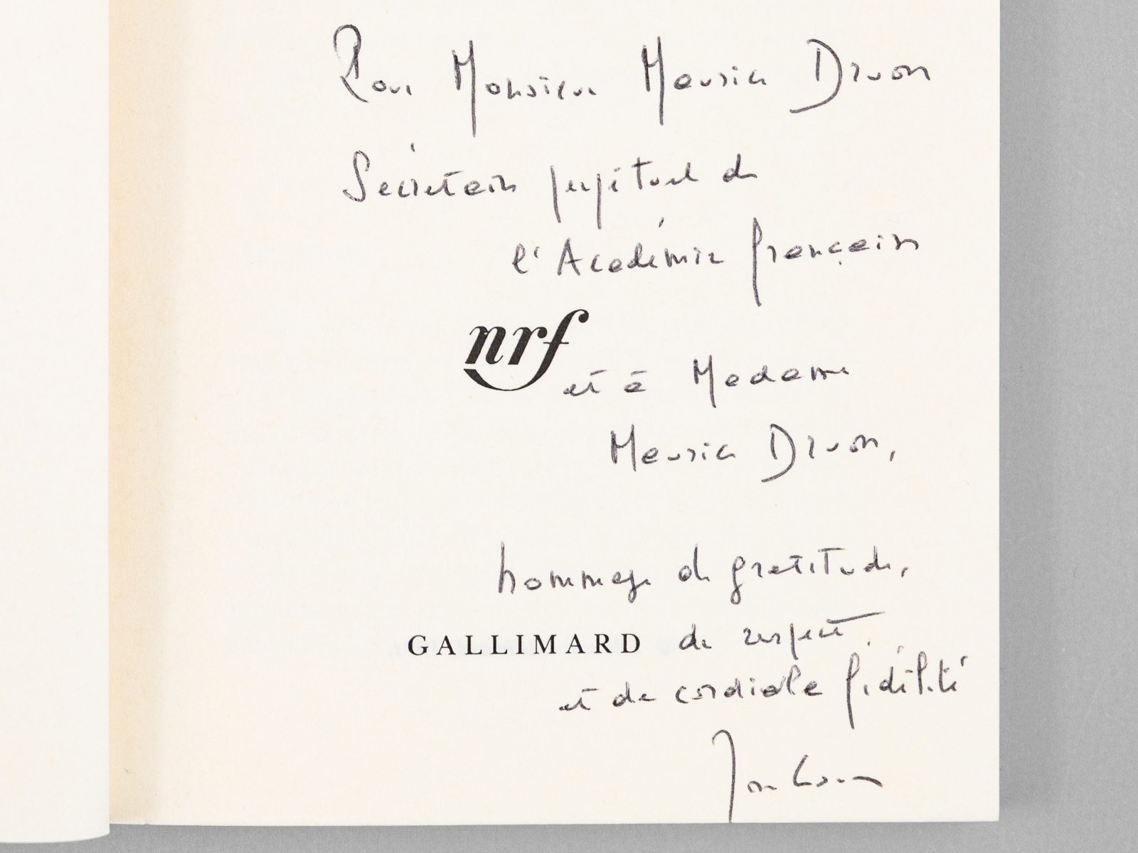Envoi ms. de l'auteur, 1 vol. petit in-8 br., NRF, Gallimard, Paris, 1991, 80 pp Commentaire : Exceptionnel exemplaire du tirage ordinaire (après 21 vélin de Rives), dédicacé par José Cabanis 'Pour Monsieur Maurice Druon, Secrétaire Perpétuel de l'Académie Française, et à Madame Maurice Druon, hommage de gratitude,de respect et de cordiale fidélité'. Bon exemplaire.