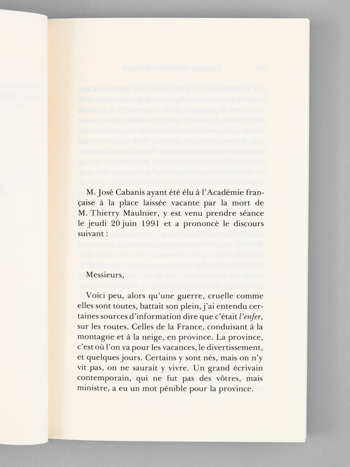 Discours de Réception de José Cabanis à l'Académie Française et réponse de Jacques de Bourbon Busset [ Livre dédicacé par l'auteur à Maurice Druon ] - Auteur: CABANIS, José - Année d'édition: 1991
