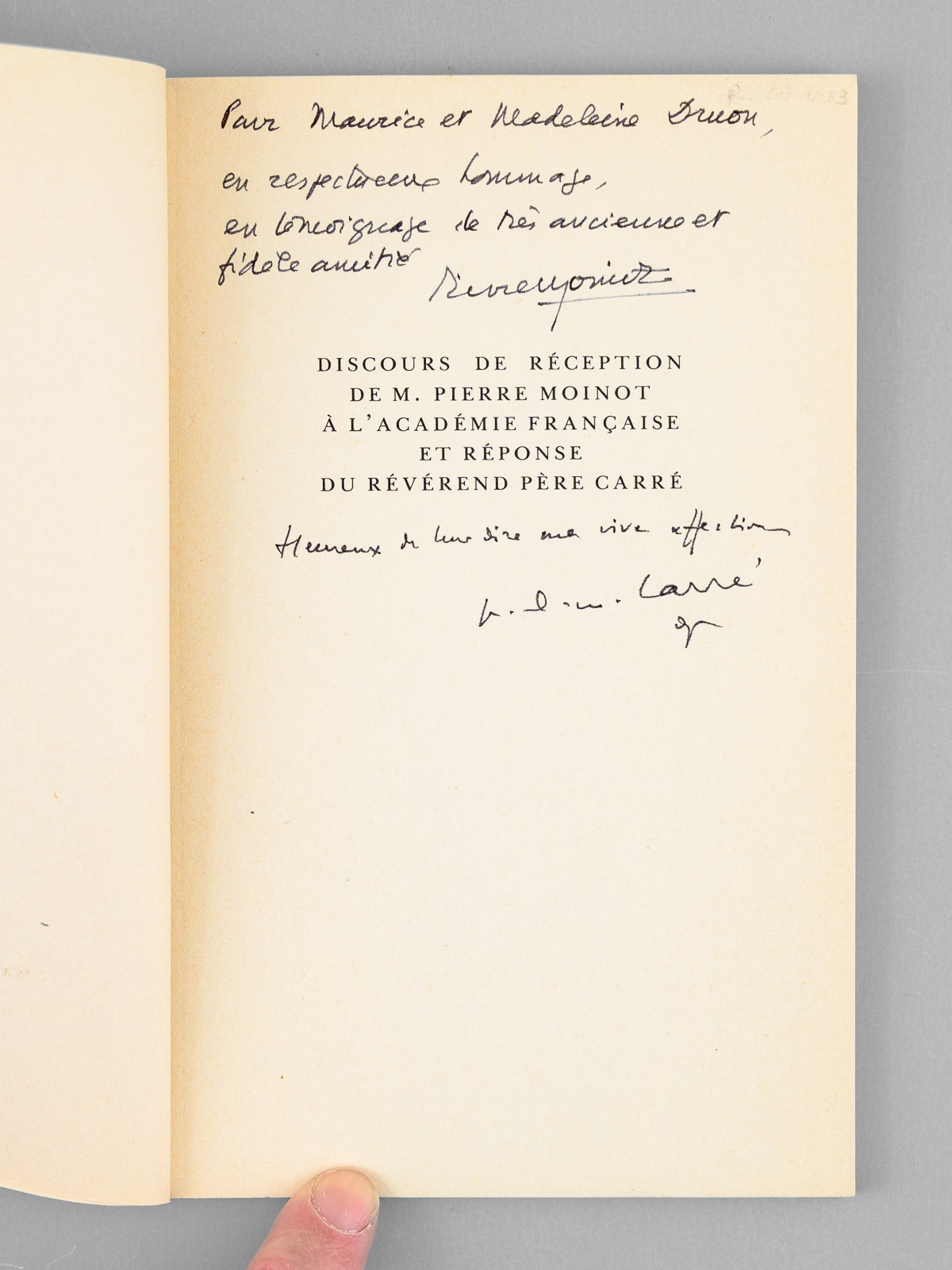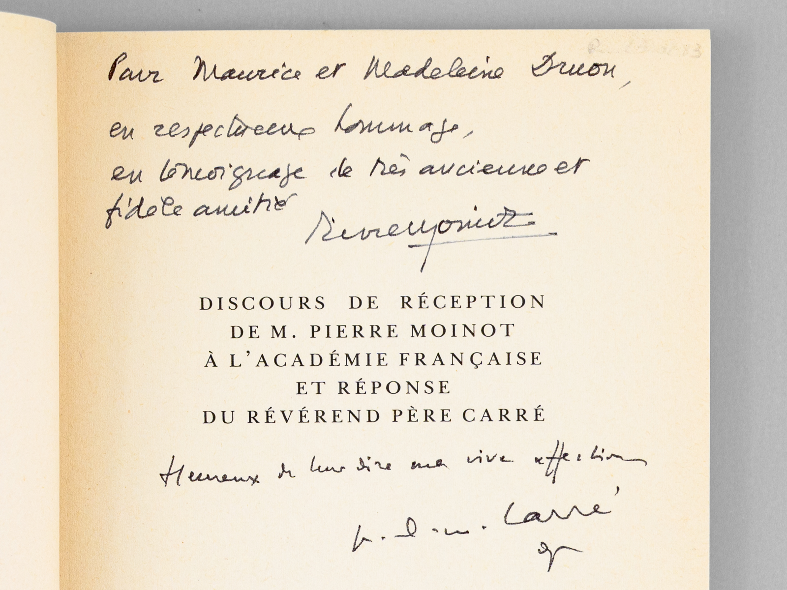 Commentaire : Envoi autographe signé de Pierre Moinot 'Pour Maurice et Madeleine Druon, en respectueux hommage, en témoignage de très ancienne et fidèle amitié', suivi d'un envoi autographe signé du Père Carré 'Heureux de leur dire ma vive affection'. Superbe provenance pour cet exemplaire du tirage ordinaire (après 23 exemplaires sur vélin pur fil) : de la bibliothèque de Maurice Druon, futur Secrétaire Perpétuel de l'Académie Française de 1985 à 1999. Bon exemplaire.